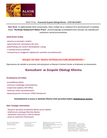 OPIS/ TYTUŁ: Pracownik Zespołu Obsługi Klienta – ETAT NA START! Alior Bank to ogólnopolski bank uniwersalny, który znalazł się w czołówce firm wyróżnionych w polskiej edycji "Rankingu Najlepszych Miejsc Pracy", prezentującego przedsiębiorstwa cieszące się największym zaufaniem wśród pracowników. Jeżeli jesteś osobą: -otwartą na kontakt z ludźmi -optymistycznie nastawioną do życia -podchodzącą do swoich obowiązków z pasją -z wysoką kulturą osobistą -nastawioną na osiąganie najlepszych wyników sprzedażowych DOŁĄCZ DO NAS I BUDUJ WYŻSZĄ KULTURĘ BANKOWOŚCI ! Zapraszamy do udziału w procesie rekrutacyjnym w Naszym Contact Center w Krakowie na stanowisko: Konsultant w Zespole Obsługi Klienta Oczekujemy od Ciebie: -prawidłowej dykcji -minimum średniego wykształcenia -znajomości pakietu MS Office -realizacji celów sprzedażowych -dyspozycyjności minimum 120h/miesięcznie Doświadczenie w pracy w obsłudze Klienta i/lub sprzedaży będzie dodatkowym atutem. Opis Twojego stanowiska: - aktywna sprzedaż produktów Banku przez telefon - telefoniczna obsługa Klientów Banku - udzielanie informacji o ofercie Banku - praca w systemie zmianowym Wybranym osobom oferujemy: -zatrudnienie w oparciu o umowę o pracę -możliwośd uzyskania premii do wysokości 45% miesięcznego wynagrodzenia brutto -system płatnych szkoleo podnoszących kwalifikacje -prywatna opieka medyczna, karta Multisport Pracuj wśród najlepszych sprzedawców! Pracownicy Alior Banku zajęli 1 miejsce aż w sześciu kategoriach najważniejszego konkursu sprzedaży "Polish National Sales Awards 2013", promującego wysokie standardy sprzedaży, obsługi klientów oraz innowacyjne rozwiązania. Aplikuj na [email protected] Informujemy, że skontaktujemy się z wybranymi kandydatami. Prosimy o zamieszczenie klauzuli: "Wyrażam zgodę na przetwarzanie moich danych osobowych, dla potrzeb niezbędnych do realizacji procesów rekrutacyjnych w Alior Bank S.A., zgodnie z przepisami ustawy z 29.08.1997 o ochronie danych osobowych (t.j. Dz.U. z 2002 r. Nr 101, poz. 926 z poź. zm.). Przyjmuję do wiadomości, że przysługuje mi prawo wglądu do treści moich danych oraz ich poprawiania."