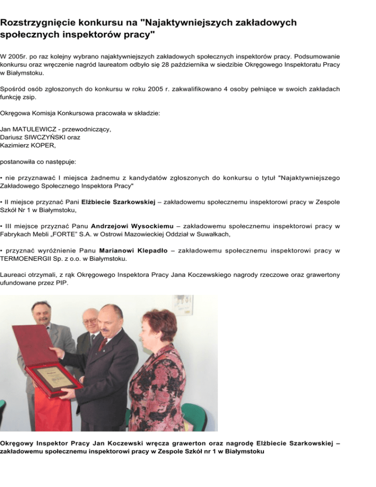 Rozstrzygnięcie konkursu na "Najaktywniejszych zakładowych społecznych inspektorów pracy" W 2005r. po raz kolejny wybrano najaktywniejszych zakładowych społecznych inspektorów pracy. Podsumowanie konkursu oraz wręczenie nagród laureatom odbyło się 28 października w siedzibie Okręgowego Inspektoratu Pracy w Białymstoku. Spośród osób zgłoszonych do konkursu w roku 2005 r. zakwalifikowano 4 osoby pełniące w swoich zakładach funkcję zsip. Okręgowa Komisja Konkursowa pracowała w składzie: Jan MATULEWICZ - przewodniczący, Dariusz SIWCZYŃSKI oraz Kazimierz KOPER, postanowiła co następuje: • nie przyznawać I miejsca żadnemu z kandydatów zgłoszonych do konkursu o tytuł "Najaktywniejszego Zakładowego Społecznego Inspektora Pracy" • II miejsce przyznać Pani Elżbiecie Szarkowskiej – zakładowemu społecznemu inspektorowi pracy w Zespole Szkół Nr 1 w Białymstoku, • III miejsce przyznać Panu Andrzejowi Wysockiemu – zakładowemu społecznemu inspektorowi pracy w Fabrykach Mebli „FORTE” S.A. w Ostrowi Mazowieckiej Oddział w Suwałkach, • przyznać wyróżnienie Panu Marianowi Klepadło – zakładowemu społecznemu inspektorowi pracy w TERMOENERGII Sp. z o.o. w Białymstoku. Laureaci otrzymali, z rąk Okręgowego Inspektora Pracy Jana Koczewskiego nagrody rzeczowe oraz grawertony ufundowane przez PIP. Okręgowy Inspektor Pracy Jan Koczewski wręcza grawerton oraz nagrodę Elżbiecie Szarkowskiej – zakładowemu społecznemu inspektorowi pracy w Zespole Szkół nr 1 w Białymstoku Konkurs organizowany jest przez Państwową Inspekcję Pracy od 1995r. Organizator za cel postawił sobie systematyczną poprawę stanu bezpieczeństwa pracy w zakładach poprzez aktywowanie społecznych inspektorów pracy i inicjowanie przez nich działań w sferze ochrony pracy i praworządności w stosunkach pracy. Laureaci konkursu wraz z kierownictwem Okręgowego Inspektoratu Pracy w Białymstoku – Janem Matulewiczem Zastępcą Okręgowego Inspektora Pracy ds. Prawno – Organizacyjnych (pierwszy z lewej), Okręgowym Inspektorem Pracy Janem Koczewskim (trzeci od lewej) oraz Jerzym Derpą Zastępcą Okręgowego Inspektora Pracy ds. Nadzoru (pierwszy z prawej).