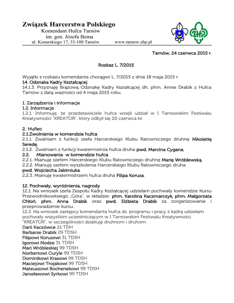 Związek Harcerstwa Polskiego Komendant Hufca Tarnów im. gen. Józefa Bema ul. Konarskiego 17, 33-100 Tarnów www.tarnow.zhp.pl Tarnów, 24 czerwca 2015 r. Rozkaz L. 7/2015 Wyjątki z rozkazu komendanta chorągwi L. 7/2015 z dnia 18 maja 2015 r. 14. Odznaka Kadry Kształcącej 14.1.3. Przyznaję Brązową Odznakę Kadry Kształcącej dh. phm. Annie Drabik z Hufca Tarnów z datą ważności od 4 maja 2015 roku. 1. Zarządzenia i informacje 1.2. Informacje 1.2.1. Informuję, że przedstawiciele hufca wzięli udział w I Tarnowskim Festiwalu Kreatywności "KREATOR", który odbył się 20 czerwca br. 2. Hufiec 2.1.Zwolnienia w komendzie hufca 2.1.1. Zwalniam z funkcji szefa Harcerskiego Klubu Ratowniczego druhnę Nikolettę Seredę. 2.1.2. Zwalniam z funkcji kwatermistrza hufca druha pwd. Marcina Cygana. 2.2. Mianowania w komendzie hufca 2.2.1. Mianuję szefem Harcerskiego Klubu Ratowniczego druhnę Marię Wróblewską. 2.2.2. Mianuję szefem wyszkolenia Harcerskiego Klubu Ratowniczego druha pwd. Wojciecha Jakimiuka. 2.2.3. Mianuję kwatermistrzem hufca druha Filipa Korusa. 12. Pochwały, wyróżnienia, nagrody 12.1. Na wniosek szefa Zespołu Kadry Kształcącej udzielam pochwały komendzie Kursu Przewodnikowksiego „Góra”, w składzie: phm. Karolina Kaczmarczyk, phm. Małgorzata Chłoń, phm. Anna Drabik oraz pwd. Elżbieta Drabik za zorganizowanie i przeprowadzenie kursu. 12.2. Na wniosek zastępcy komendanta hufca ds. programu i pracy z kadrą udzielam pochwały wszystkim uczestniczącym w I Tarnowskim Festiwalu Kreatywności "KREATOR", w szczególności dziękuję druhnom i druhom: Darii Kaczówce 21 TDH Barbarze Drabik 29 TDSH Filipowi Korusowi 31 TDSH Igorowi Nodze 31 TDSH Mari Wróbleskiej 99 TDSH Norbertowi Curyle 99 TDSH Dominikowi Krasowi 99 TDSH Maciejowi Trojakowi 99 TDSH Mateuszowi Bochenekowi 99 TDSH Jarosławowi Syrkowi 99 TDSH Michałowi Brniakowi 99 TDSH Natalia Wójcik próbna PTWDH 13. Inne 13.1. Na wniosek Kapituły Stopni Wędrowniczych zamykam próbę na Harcerza Orlego z wynikiem pozytywnym druhowi Michałowi Brniakowi. 13.2. Na wniosek Kapituły Stopni Wędrowniczych otwieram próbę na Harcerza Orlego druhowi Oskarowi Pawlikowi. 14. Sprostowania 14.1. Informuję, że w rozkazie L.6/2015 z dnia 14 maja 2015 r. błędnie podano numer oraz nazwę Gromady Zuchowej, było: „3.3.1. Zwalniam z funkcji opiekuna 8 Gromad Zuchowej „Gwiezdni Wojownicy” druhnę hm. Martę Tomasiewicz.”, powinno być: „3.3.1. Zwalniam z funkcji opiekuna 3 Gromady Zuchowej „Wojownicy Galaktyki” druhnę hm. Martę Tomasiewicz.” 14.2. Informuję, że w rozkazie L.6/2015 z dnia 14 maja 2015 r. błędnie podano datę trwania obozu, było: „6.1.1 Mianuję druhnę hm. Martę Tomasiewicz komendantką obozu w Szklanej Hucie, w terminie 30.06-15.08.2015 r.”, powinno być: „6.1.1 Mianuję druhnę hm. Martę Tomasiewicz komendantką obozu w Szklanej Hucie, w terminie 30.06-18.07.2015 r.” Czuwaj! /-/ hm. Jerzy Gacoń