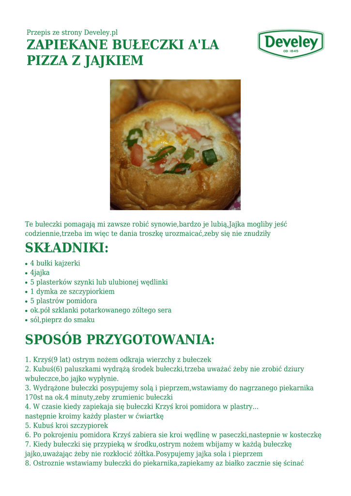 Przepis ze strony Develey.pl ZAPIEKANE BUŁECZKI A'LA PIZZA Z JAJKIEM Te bułeczki pomagają mi zawsze robić synowie,bardzo je lubią,Jajka mogliby jeść codziennie,trzeba im więc te dania troszkę urozmaicać,zeby się nie znudziły SKŁADNIKI: ● ● ● ● ● ● ● 4 bułki kajzerki 4jajka 5 plasterków szynki lub ulubionej wędlinki 1 dymka ze szczypiorkiem 5 plastrów pomidora ok.pół szklanki potarkowanego zóltego sera sól,pieprz do smaku SPOSÓB PRZYGOTOWANIA: 1. Krzyś(9 lat) ostrym nożem odkraja wierzchy z bułeczek 2. Kubuś(6) paluszkami wydrążą środek bułeczki,trzeba uważać żeby nie zrobić dziury wbułeczce,bo jajko wypłynie. 3. Wydrążone bułeczki posypujemy solą i pieprzem,wstawiamy do nagrzanego piekarnika 170st na ok.4 minuty,zeby zrumienic bułeczki 4. W czasie kiedy zapiekaja się bułeczki Krzyś kroi pomidora w plastry... następnie kroimy każdy plaster w ćwiartkę 5. Kubuś kroi szczypiorek 6. Po pokrojeniu pomidora Krzyś zabiera sie kroi wędlinę w paseczki,nastepnie w kosteczkę 7. Kiedy bułeczki się przypieką w środku,ostrym nożem wbijamy w każdą bułeczkę jajko,uważając żeby nie rozkłocić żółtka.Posypujemy jajka sola i pieprzem 8. Ostroznie wstawiamy bułeczki do piekarnika,zapiekamy az białko zacznie się ścinać 9. Kiedy białko zacznie się ścinać posypujemy po nim pokrojoną szynką,układamy pomidora 10. Zapiekamy jeszcze ok.3 minuty,po gorących bułeczkach posypujemy starkowany ser i szczypiorek