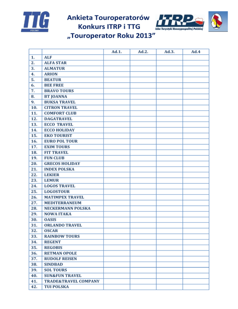 Ankieta Touroperatorów Konkurs ITRP i TTG „Touroperator Roku 2013” Ad.1. 1. 2. 3. 4. 5. 6. 7. 8. 9. 10. 11. 12. 13. 14. 15. 16. 17. 18. 19. 20. 21. 22. 23. 24. 25. 26. 27. 28. 29. 30. 31. 32. 33. 34. 35. 36. 37. 38. 39. 40. 41. 42. ALF ALFA STAR ALMATUR ARION BEATUR BEE FREE BRAVO TOURS BT JOANNA BUKSA TRAVEL CITRON TRAVEL COMFORT CLUB DAGATRAVEL ECCO TRAVEL ECCO HOLIDAY EKO TOURIST EURO POL TOUR EXIM TOURS FIT TRAVEL FUN CLUB GRECOS HOLIDAY INDEX POLSKA LEKIER LEMUR LOGOS TRAVEL LOGOSTOUR MATIMPEX TRAVEL MEDITERRANEUM NECKERMANN POLSKA NOWA ITAKA OASIS ORLANDO TRAVEL OSCAR RAINBOW TOURS REGENT REGOBIS RETMAN OPOLE RUDOLF REISEN SINDBAD SOL TOURS SUN&FUN TRAVEL TRADE&TRAVEL COMPANY TUI POLSKA Ad.2. Ad.3. Ad.4 Ad.1. 43. 44. 45. Ad.2. Ad.3. Ad.4. VIVA TOURS WEZYR ZAWADZKIE …………………………………………… Miejscowość i data …………………………… Pieczęć i podpis Touroperatorów oceniany w 4 dziedzinach : 1. liczba najwięcej sprzedanych miejsc dla danego touroperatora lub największy obrót 2. działalność przedstawicieli terenowych i działów agencyjnych 3. system rezerwacyjny , materiały reklamowe i strona www 4. pomoc dla agentów / szkolenia, study toury oraz pomoc w ciężkich sytuacjach takich jak: pomyłki w systemie rezerwacyjnym, rezerwacja bez zapłaty ze strony klienta internetowego i inne W każdej dziedzinie przyznajemy dla najlepszego touroperatora 4 pkt., dla drugiego 3 pkt., dla trzeciego 2 pkt. oraz dla czwartego 1 pkt. czyli w każdej dziedzinie wskazujemy 4 najlepszych według nas touroperatorów. Dla każdej dziedziny mamy 10 pkt. a łącznie dla całości 40 pkt. Ankiety prosimy przesyłać e-mailem , fax-em lub listownie na adres swoje Izby Turystyki lub: IT RP, 50-029 Wrocław ul. Świdnicka 39 oraz on-line na www.ttg.com.pl Sponsorzy konkursu: