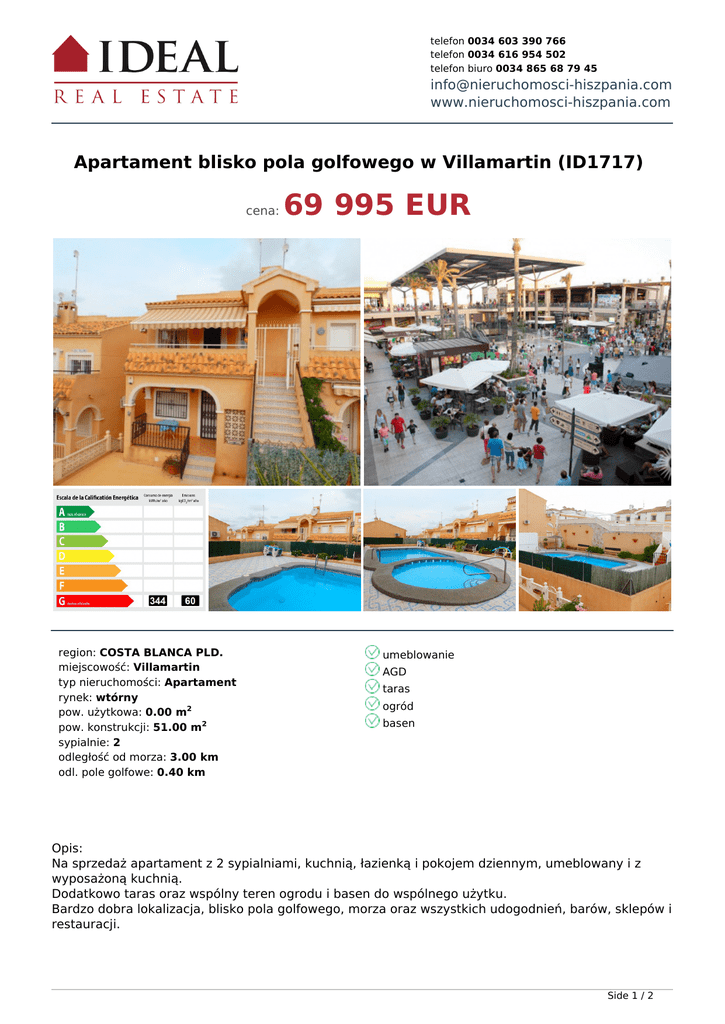 telefon 0034 603 390 766 telefon 0034 616 954 502 telefon biuro 0034 865 68 79 45 [email protected] www.nieruchomosci-hiszpania.com Apartament blisko pola golfowego w Villamartin (ID1717) cena: region: COSTA BLANCA PLD. miejscowość: Villamartin typ nieruchomości: Apartament rynek: wtórny pow. użytkowa: 0.00 m2 pow. konstrukcji: 51.00 m2 sypialnie: 2 odległość od morza: 3.00 km odl. pole golfowe: 0.40 km 69 995 EUR umeblowanie AGD taras ogród basen Opis: Na sprzedaż apartament z 2 sypialniami, kuchnią, łazienką i pokojem dziennym, umeblowany i z wyposażoną kuchnią. Dodatkowo taras oraz wspólny teren ogrodu i basen do wspólnego użytku. Bardzo dobra lokalizacja, blisko pola golfowego, morza oraz wszystkich udogodnień, barów, sklepów i restauracji. Side 1 / 2 www.nieruchomosci-hiszpania.com Side 2 / 2 Powered by TCPDF (www.tcpdf.org)