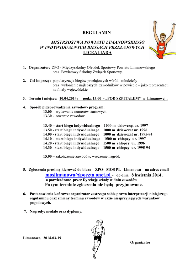 REGULAMIN MISTRZOSTWA POWIATU LIMANOWSKIEGO W INDYWIDUALNYCH BIEGACH PRZEŁAJOWYCH LICEALIADA 1. Organizator: ZPO - Międzyszkolny Ośrodek Sportowy Powiatu Limanowskiego oraz Powiatowy Szkolny Związek Sportowy. 2. Cel imprezy: popularyzacja biegów przełajowych wśród młodzieży oraz wyłonienie najlepszych zawodników w powiecie – jako reprezentacji na finały wojewódzkie 3. Termin i miejsce: 10.04.2014r 4. godz. 13.00 - „POD SZPITALEM’’ w Limanowej . Sposób przeprowadzenia zawodów- program: 13.00 - wydawanie numerów startowych 13.30 - otwarcie zawodów 13.40 – start biegu indywidualnego 13.50 - start biegu indywidualnego 14.00 - start biegu indywidualnego 14.10 - start biegu indywidualnego 14.20 - start biegu indywidualnego 14.30 - start biegu indywidualnego 1000 m dziewcząt ur. 1997 1000 m dziewcząt ur. 1996 1000 m dziewcząt ur. 1995-94 1500 m chłopcy ur. 1997 1500 m chłopcy ur. 1996 1500 m chłopcy ur. 1995-94 15.00 – zakończenie zawodów, wręczenie nagród. 5. Zgłoszenia prosimy kierować do biura ZPO- MOS PL Limanowa na adres email [email protected] - do dnia 8 kwietnia 2014 , a potwierdzone przez Dyrekcję szkoły w dniu zawodów Po tym terminie zgłoszenia nie będą przyjmowane. 6. Postanowienia końcowe: organizator zastrzega sobie prawo interpretacji niniejszego regulaminu oraz zmiany terminu zawodów w razie niesprzyjających warunków pogodowych. 7. Nagrody: medale oraz dyplomy. Limanowa, 2014-03-19 Organizator