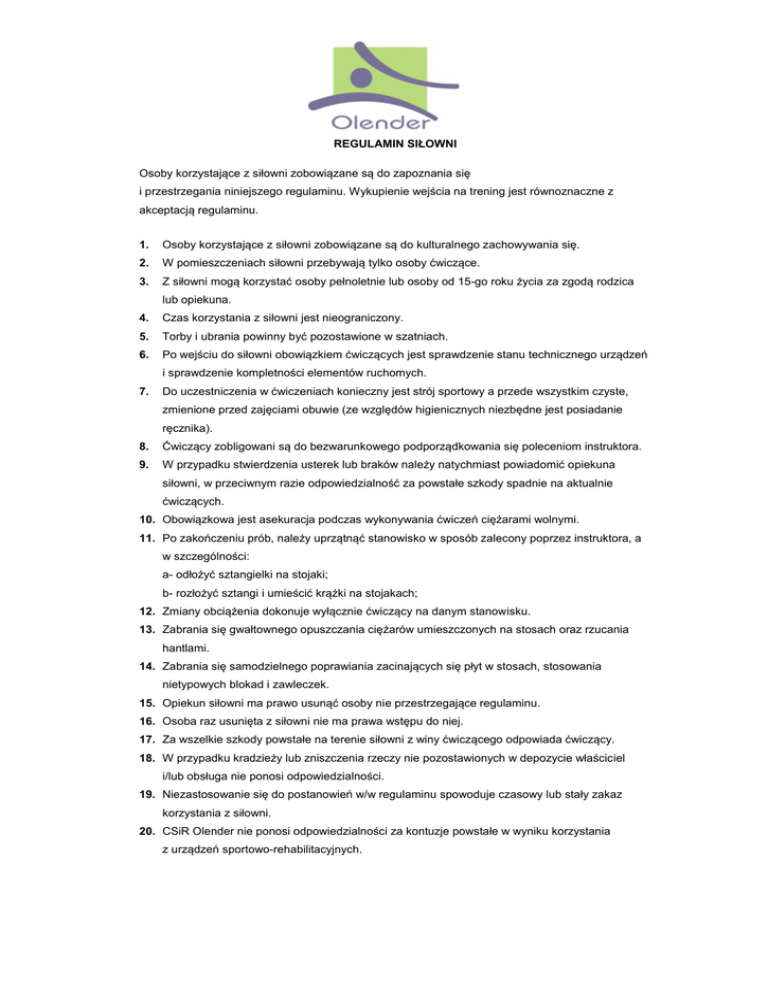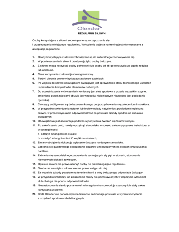 REGULAMIN SIŁOWNI Osoby korzystające z siłowni zobowiązane są do zapoznania się i przestrzegania niniejszego regulaminu. Wykupienie wejścia na trening jest równoznaczne z akceptacją regulaminu. 1. Osoby korzystające z siłowni zobowiązane są do kulturalnego zachowywania się. 2. W pomieszczeniach siłowni przebywają tylko osoby ćwiczące. 3. Z siłowni mogą korzystać osoby pełnoletnie lub osoby od 15-go roku życia za zgodą rodzica lub opiekuna. 4. Czas korzystania z siłowni jest nieograniczony. 5. Torby i ubrania powinny być pozostawione w szatniach. 6. Po wejściu do siłowni obowiązkiem ćwiczących jest sprawdzenie stanu technicznego urządzeń i sprawdzenie kompletności elementów ruchomych. 7. Do uczestniczenia w ćwiczeniach konieczny jest strój sportowy a przede wszystkim czyste, zmienione przed zajęciami obuwie (ze względów higienicznych niezbędne jest posiadanie ręcznika). 8. Ćwiczący zobligowani są do bezwarunkowego podporządkowania się poleceniom instruktora. 9. W przypadku stwierdzenia usterek lub braków należy natychmiast powiadomić opiekuna siłowni, w przeciwnym razie odpowiedzialność za powstałe szkody spadnie na aktualnie ćwiczących. 10. Obowiązkowa jest asekuracja podczas wykonywania ćwiczeń ciężarami wolnymi. 11. Po zakończeniu prób, należy uprzątnąć stanowisko w sposób zalecony poprzez instruktora, a w szczególności: a- odłożyć sztangielki na stojaki; b- rozłożyć sztangi i umieścić krążki na stojakach; 12. Zmiany obciążenia dokonuje wyłącznie ćwiczący na danym stanowisku. 13. Zabrania się gwałtownego opuszczania ciężarów umieszczonych na stosach oraz rzucania hantlami. 14. Zabrania się samodzielnego poprawiania zacinających się płyt w stosach, stosowania nietypowych blokad i zawleczek. 15. Opiekun siłowni ma prawo usunąć osoby nie przestrzegające regulaminu. 16. Osoba raz usunięta z siłowni nie ma prawa wstępu do niej. 17. Za wszelkie szkody powstałe na terenie siłowni z winy ćwiczącego odpowiada ćwiczący. 18. W przypadku kradzieży lub zniszczenia rzeczy nie pozostawionych w depozycie właściciel i/lub obsługa nie ponosi odpowiedzialności. 19. Niezastosowanie się do postanowień w/w regulaminu spowoduje czasowy lub stały zakaz korzystania z siłowni. 20. CSiR Olender nie ponosi odpowiedzialności za kontuzje powstałe w wyniku korzystania z urządzeń sportowo-rehabilitacyjnych.