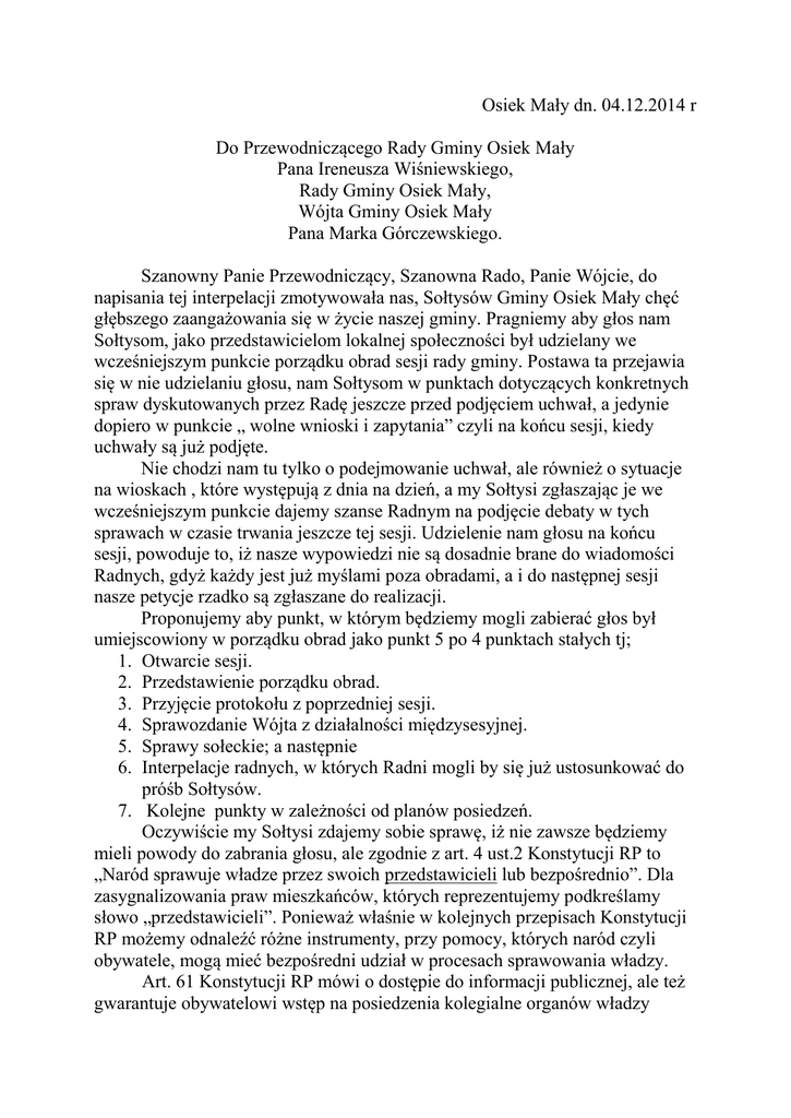 Osiek Mały dn. 04.12.2014 r Do Przewodniczącego Rady Gminy Osiek Mały Pana Ireneusza Wiśniewskiego, Rady Gminy Osiek Mały, Wójta Gminy Osiek Mały Pana Marka Górczewskiego. Szanowny Panie Przewodniczący, Szanowna Rado, Panie Wójcie, do napisania tej interpelacji zmotywowała nas, Sołtysów Gminy Osiek Mały chęć głębszego zaangażowania się w życie naszej gminy. Pragniemy aby głos nam Sołtysom, jako przedstawicielom lokalnej społeczności był udzielany we wcześniejszym punkcie porządku obrad sesji rady gminy. Postawa ta przejawia się w nie udzielaniu głosu, nam Sołtysom w punktach dotyczących konkretnych spraw dyskutowanych przez Radę jeszcze przed podjęciem uchwał, a jedynie dopiero w punkcie „ wolne wnioski i zapytania” czyli na końcu sesji, kiedy uchwały są już podjęte. Nie chodzi nam tu tylko o podejmowanie uchwał, ale również o sytuacje na wioskach , które występują z dnia na dzień, a my Sołtysi zgłaszając je we wcześniejszym punkcie dajemy szanse Radnym na podjęcie debaty w tych sprawach w czasie trwania jeszcze tej sesji. Udzielenie nam głosu na końcu sesji, powoduje to, iż nasze wypowiedzi nie są dosadnie brane do wiadomości Radnych, gdyż każdy jest już myślami poza obradami, a i do następnej sesji nasze petycje rzadko są zgłaszane do realizacji. Proponujemy aby punkt, w którym będziemy mogli zabierać głos był umiejscowiony w porządku obrad jako punkt 5 po 4 punktach stałych tj; 1. Otwarcie sesji. 2. Przedstawienie porządku obrad. 3. Przyjęcie protokołu z poprzedniej sesji. 4. Sprawozdanie Wójta z działalności międzysesyjnej. 5. Sprawy sołeckie; a następnie 6. Interpelacje radnych, w których Radni mogli by się już ustosunkować do próśb Sołtysów. 7. Kolejne punkty w zależności od planów posiedzeń. Oczywiście my Sołtysi zdajemy sobie sprawę, iż nie zawsze będziemy mieli powody do zabrania głosu, ale zgodnie z art. 4 ust.2 Konstytucji RP to „Naród sprawuje władze przez swoich przedstawicieli lub bezpośrednio”. Dla zasygnalizowania praw mieszkańców, których reprezentujemy podkreślamy słowo „przedstawicieli”. Ponieważ właśnie w kolejnych przepisach Konstytucji RP możemy odnaleźć różne instrumenty, przy pomocy, których naród czyli obywatele, mogą mieć bezpośredni udział w procesach sprawowania władzy. Art. 61 Konstytucji RP mówi o dostępie do informacji publicznej, ale też gwarantuje obywatelowi wstęp na posiedzenia kolegialne organów władzy pochodzącej z wyboru, a wiec także i Rad Gminnych czy tez Miejskich. Należy zaznaczyć, że pojęcie wstępu na sesje Rady Gminy należy interpretować szeroko – a więc nie tylko możliwość bycia obecnym podczas obrad Rady Gminy, czy tez jej komisji. Oznacza to, że obywatele, jak i my Sołtysi reprezentujący ich poglądy, nie możemy być biernymi obserwatorami ale możemy zabierać głos, zadawać pytania, wygłaszać opinie, oczywiście zgodnie z poszanowaniem pewnych reguł i autonomii działania organu władzy publicznej jakim jest Rada Gminy. Jako ostatecznym argumentem przemawiającym za słusznością stwierdzeń przedstawionych powyżej, chcielibyśmy Państwu wskazać, że samo wysłuchanie osób chętnych do zabrania głosu w trakcie dyskusji nad uchwałą nie przesądza przecież o ostatecznym rozstrzygnięciu, które dokonane zostanie w akcie głosowania nad konkretną uchwałą, do którego uprawnieni są jedynie radni Rady Gminnej. Mamy nadzieje, że potraktuje Pan jak również Rada Gminy naszą interpelacje poważnie i zrozumie, że zostaliśmy wybrani przez mieszkańców naszych sołectw do reprezentowania ich interesów na polu gminnym, z Wy jako radni jesteście zobowiązani kierować się dobrem naszej Małej Ojczyzny jaką jest gmina. W związku z tym proponuje Państwu Radnym przypomnieć Sobie słowa roty ślubowania na radnego złożone na początku kadencji, kładąc nacisk na ostatni człon jej treści, który mówi o względzie na dobro gminy i jej mieszkańców. Mamy nadzieję na pozytywne rozpatrzenie naszej prośby. Z poważaniem Sołtysi Gminy Osiek Mały Załączniki: 1. Lista z podpisami Sołtysów Gminy Osiek Mały PISMO NAPISANE Z INICJATYWY SOŁTYSA ANDRZEJA KAWKI ODCZYTANE NA SESJI PRZEZ SOŁTYSA JANA PUSZCZYKA