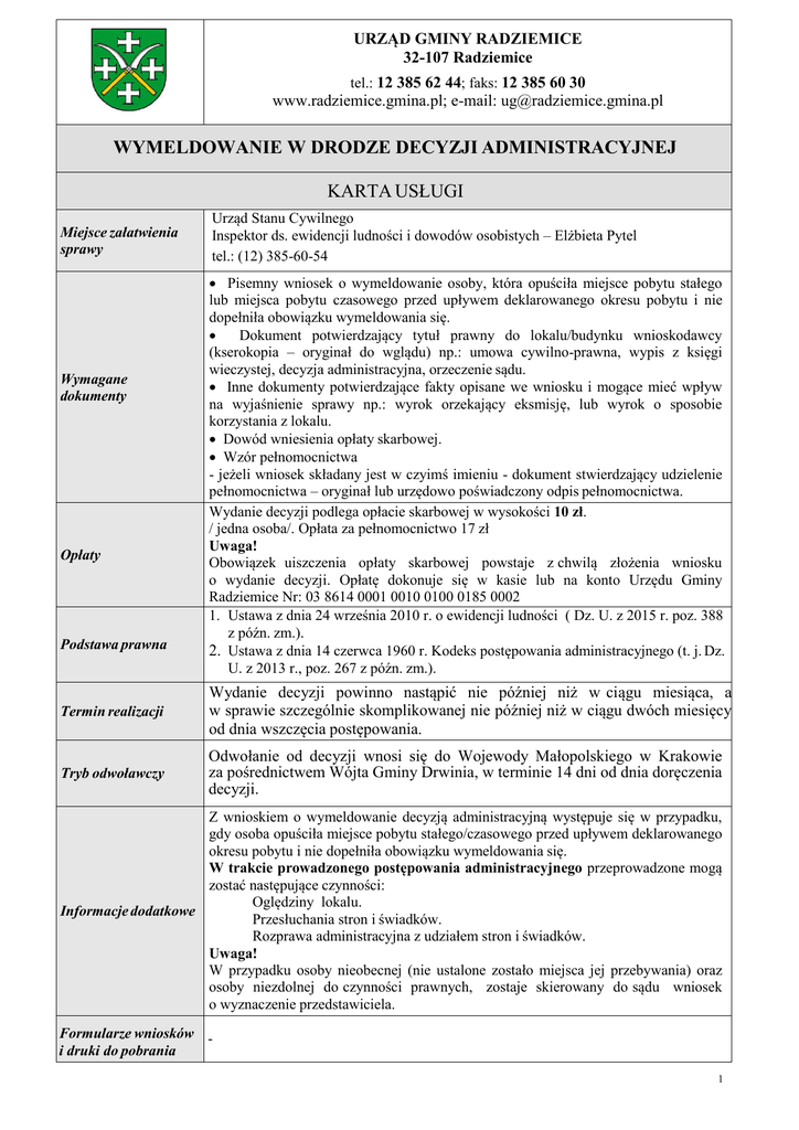 URZĄD GMINY RADZIEMICE 32-107 Radziemice tel.: 12 385 62 44; faks: 12 385 60 30 www.radziemice.gmina.pl; e-mail: [email protected] WYMELDOWANIE W DRODZE DECYZJI ADMINISTRACYJNEJ KARTA USŁUGI Miejsce załatwienia sprawy Wymagane dokumenty Opłaty Podstawa prawna Urząd Stanu Cywilnego Inspektor ds. ewidencji ludności i dowodów osobistych – Elżbieta Pytel tel.: (12) 385-60-54 Pisemny wniosek o wymeldowanie osoby, która opuściła miejsce pobytu stałego lub miejsca pobytu czasowego przed upływem deklarowanego okresu pobytu i nie dopełniła obowiązku wymeldowania się. Dokument potwierdzający tytuł prawny do lokalu/budynku wnioskodawcy (kserokopia – oryginał do wglądu) np.: umowa cywilno-prawna, wypis z księgi wieczystej, decyzja administracyjna, orzeczenie sądu. Inne dokumenty potwierdzające fakty opisane we wniosku i mogące mieć wpływ na wyjaśnienie sprawy np.: wyrok orzekający eksmisję, lub wyrok o sposobie korzystania z lokalu. Dowód wniesienia opłaty skarbowej. Wzór pełnomocnictwa - jeżeli wniosek składany jest w czyimś imieniu - dokument stwierdzający udzielenie pełnomocnictwa – oryginał lub urzędowo poświadczony odpis pełnomocnictwa. Wydanie decyzji podlega opłacie skarbowej w wysokości 10 zł. / jedna osoba/. Opłata za pełnomocnictwo 17 zł Uwaga! Obowiązek uiszczenia opłaty skarbowej powstaje z chwilą złożenia wniosku o wydanie decyzji. Opłatę dokonuje się w kasie lub na konto Urzędu Gminy Radziemice Nr: 03 8614 0001 0010 0100 0185 0002 1. Ustawa z dnia 24 września 2010 r. o ewidencji ludności ( Dz. U. z 2015 r. poz. 388 z późn. zm.). 2. Ustawa z dnia 14 czerwca 1960 r. Kodeks postępowania administracyjnego (t. j. Dz. U. z 2013 r., poz. 267 z późn. zm.). Termin realizacji Wydanie decyzji powinno nastąpić nie później niż w ciągu miesiąca, a w sprawie szczególnie skomplikowanej nie później niż w ciągu dwóch miesięcy od dnia wszczęcia postępowania. Tryb odwoławczy Odwołanie od decyzji wnosi się do Wojewody Małopolskiego w Krakowie za pośrednictwem Wójta Gminy Drwinia, w terminie 14 dni od dnia doręczenia decyzji. Z wnioskiem o wymeldowanie decyzją administracyjną występuje się w przypadku, gdy osoba opuściła miejsce pobytu stałego/czasowego przed upływem deklarowanego okresu pobytu i nie dopełniła obowiązku wymeldowania się. W trakcie prowadzonego postępowania administracyjnego przeprowadzone mogą zostać następujące czynności: Oględziny lokalu. Informacje dodatkowe Przesłuchania stron i świadków. Rozprawa administracyjna z udziałem stron i świadków. Uwaga! W przypadku osoby nieobecnej (nie ustalone zostało miejsca jej przebywania) oraz osoby niezdolnej do czynności prawnych, zostaje skierowany do sądu wniosek o wyznaczenie przedstawiciela. Formularze wniosków i druki do pobrania 1