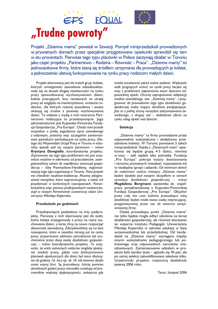 „Trudne powroty” Projekt „Dzienna mama” powstał w Szwecji. Pomysł miniprzedszkoli prowadzonych w prywatnych domach przez specjalnie przygotowane opiekunki sprawdził się tam w stu procentach. Pierwsze tego typu placówki w Polsce zaczynają działać w Toruniu jako część projektu „Partnerstwo – Rodzina – Równość – Praca”. „Dzienne mamy” to jednoosobowe firmy, które staną się źródłem utrzymania dla prowadzących je kobiet, a jednocześnie ułatwią funkcjonowanie na rynku pracy rodzicom małych dzieci. Projekt skierowany jest do trzech grup: kobiet, których umiejętności zawodowe zdezaktualizowały się na skutek długiej nieobecności na rynku pracy spowodowanej wychowywaniem dzieci; kobiet pracujących, lecz narażonych na utratę pracy ze względu na macierzyństwo, wreszcie rodziców, dla których rozwój zawodowy i awans okazują się trudne z powodu wychowywania dzieci. To właśnie z myślą o nich tworzono Partnerstwo realizujące to przedsięwzięcie. Jego administratorem jest Kujawsko-Pomorska Fundacja Gospodarcza „Pro Europa”. Chodzi nam przede wszystkim o próbę pogodzenia życia zawodowego z rodzinnym, jesteśmy więc szczególnie zainteresowani zjawiskami zachodzącymi na rynku pracy. Dlatego też Wojewódzki Urząd Pracy w Toruniu w naturalny sposób stał się naszym partnerem – mówi Krystyna Dowgiałło, koordynatorka projektu. Zajmowanie się tego typu problemami nie jest oczywiście możliwe w oderwaniu od pracodawców, zaangażowaliśmy zatem do współpracy samorząd gospodarczy – Izbę Przemysłowo-Handlową, najpoważniejszą tego typu organizację w Toruniu. Nasz projekt ma charakter naukowo-badawczy. Musimy zdiagnozować narzędzia, które wypracowujemy, a także ich przydatność w konkretnych rozwiązaniach. Potrzebowaliśmy więc pomocy profesjonalnych naukowców, stąd w naszym Partnerstwie uczestniczy także Uniwersytet Mikołaja Kopernika. Przedszkole po godzinach Przedsięwzięcie podzielono na trzy podprojekty. Pierwszy z nich skierowany jest do osób, które kiedyś zrezygnowały z pracy na rzecz wychowania dzieci, a teraz chcą na nowo rozpocząć aktywność zawodową. Zdecydowaliśmy się na dwa rozwiązania, które w zasadzie istnieją już na rynku pracy: przywrócenie zdolności zatrudnienia lub uruchomienie przez daną osobę działalności gospodarczej – mówi koordynatorka projektu. To oczywiste, że wielu samotnych rodziców mogłoby spokojnie znaleźć pracę, gdyby czas funkcjonowania placówek opiekuńczych dla dzieci był nieco dłuższy: nie do godziny 16, lecz np. do 18, tak bowiem działa coraz więcej firm. Są pracodawcy, którzy pomimo określonych godzin pracy nierzadko oczekują od pracowników większej dyspozycyjności, zwłaszcza gdy trzeba zrealizować jakieś ważne zadanie. Większość osób pragnących wrócić na rynek pracy boryka się więc z problemem zapewnienia swym dzieciom odpowiedniej opieki. Chcemy zaproponować adaptację modelu szwedzkiego, tzw. „Dziennej mamy”, i przygotować do prowadzenia tego typu działalności gospodarczej osoby mające określone predyspozycje. Jest to z jednej strony narzędzie zaktywizowania zawodowego, z drugiej zaś – dodatkowa oferta na rynku usług opieki nad dziećmi. Selekcja „Dzienne mamy” to firmy prowadzone przez odpowiednio wykształcone i dodatkowo przeszkolone kobiety. W Toruniu powstanie 5 takich miniprzedszkoli. Każda z „Dziennych mam” opiekować się będzie grupą 4-5 dzieci, również w nocy – jeśli zajdzie taka potrzeba. Fundacja „Pro Europa” pokryje koszty dostosowania i remontu prywatnych mieszkań, wyposażenia ich w niezbędny sprzęt i zabawki. Od minimum dwóch do maksimum sześciu miesięcy „Dzienna mama” będzie działała pod naszymi skrzydłami w ramach symulacji działalności gospodarczej – mówi Magdalena Bergmann asystentka ds. współpracy ponadnarodowej z Kujawsko-Pomorskiej Fundacji Gospodarczej „Pro Europa”. Oficjalnie przez cały ten czas kobieta prowadząca taką działalność będzie miała status osoby niepracującej, przygotowywanej przez nas do otwarcia zarejestrowanej firmy. Osoba prowadząca punkt „Dzienna mama” nie tylko będzie mogła odbyć szkolenia na temat działalności gospodarczej, ale również skorzystać ze wsparcia Instytutu Pedagogiki Uniwersytetu Mikołaja Kopernika w zakresie edukacji w fazie wczesnoszkolnej lub przedszkolnej. Od kandydatek na „Dzienne mamy” wymagano między innymi wykształcenia pedagogicznego lub pokrewnego oraz odpowiednich warunków mieszkaniowych. Zainteresowanie udziałem w projekcie było bardzo duże – zgłosiło się 40 pań, ale po ostrej selekcji zakwalifikowano zaledwie kilka. Uczestniczki projektu rozpoczną działalność jesienią 2006 roku. Toruń, listopad 2006