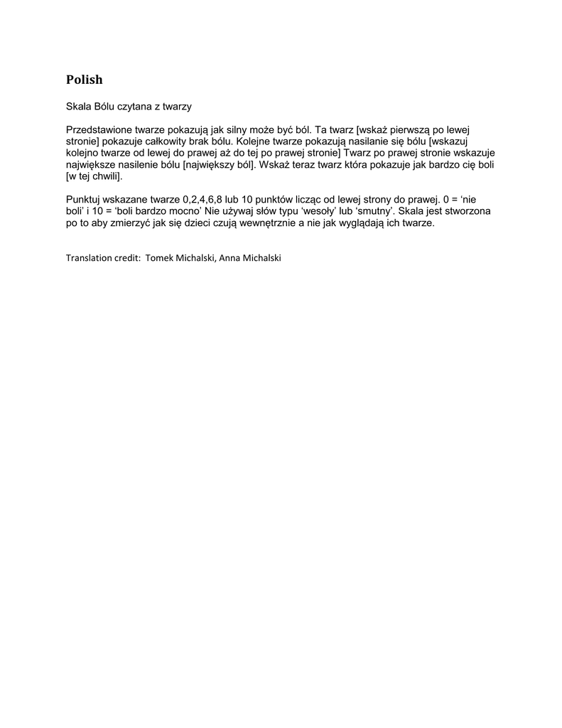 Polish Skala Bólu czytana z twarzy Przedstawione twarze pokazują jak silny może być ból. Ta twarz [wskaż pierwszą po lewej stronie] pokazuje całkowity brak bólu. Kolejne twarze pokazują nasilanie się bólu [wskazuj kolejno twarze od lewej do prawej aż do tej po prawej stronie] Twarz po prawej stronie wskazuje największe nasilenie bólu [największy ból]. Wskaż teraz twarz która pokazuje jak bardzo cię boli [w tej chwili]. Punktuj wskazane twarze 0,2,4,6,8 lub 10 punktów licząc od lewej strony do prawej. 0 = ‘nie boli’ i 10 = ‘boli bardzo mocno’ Nie używaj słów typu ‘wesoły’ lub ‘smutny’. Skala jest stworzona po to aby zmierzyć jak się dzieci czują wewnętrznie a nie jak wyglądają ich twarze. Translation credit: Tomek Michalski, Anna Michalski
