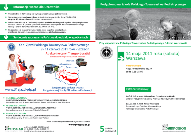 Podyplomowa Szkoła Polskiego Towarzystwa Pediatrycznego Informacje ważne dla Uczestnika Uczestnictwo w Konferencji nie wymaga wcześniejszego potwierdzenia. Warunkiem otrzymania certyfikatu jest rejestracja przy stoisku firmy SYMPOSION do godz. 10.30 oraz obecność Państwa na wykładach. Lekarz uczestniczący w Konferencji uzyska 5 punktów edukacyjnych zgodnie z Rozporządzeniem Ministra Zdrowia w sprawie sposobów dopełnienia obowiązków doskonalenia zawodowego lekarzy i lekarzy dentystów z dnia 06.10.2004 r. zał. nr 3. Na zakończenie Konferencji wśród osób, które wypełnią ankietę i będą znajdować się w sali obrad, zostaną rozlosowane atrakcyjne nagrody. Serdecznie zapraszamy Państwa do udziału w spotkaniach XXXI Zjazd Polskiego Towarzystwa Pediatrycznego 9 - 11 czerwca 2011 roku - Szczecin Przy współudziale Polskiego Towarzystwa Pediatrycznego Oddział Warszawski 14 maja 2011 roku (sobota) Warszawa 50 bezpłatnych miejsc w luksusowym autokarze. albo wóz... ...albo przewóz www.31zjazd-ptp.pl Hotel Marriott Aleje Jerozolimskie 65/79 godz. 7.35-15.05 Zarejestruj sie podczas trwania Podyplomowej Szkoły PTP w Biurze Konferencji Patronat naukowy: Prof. dr hab. n. med. Mieczysława Czerwionka-Szaflarska Dyrektor Podyplomowej Szkoły Polskiego Towarzystwa Pediatrycznego 04.06.2011 r., WARSZAWA Podyplomowa Szkoła Polskiego Towarzystwa Alergologicznego Przewodniczący: prof. dr hab. n. med. Barbara Rogala, prof. dr hab. n. med. Piotr Kuna Doc. dr hab. n. med. Teresa Jackowska Przewodnicząca Oddziału Warszawskiego Polskiego Towarzystwa Pediatrycznego 09-10.12.2011 r., POZNAŃ V ogólnopolska KONFERENCJA „Nowoczesna Pediatria” Przewodniczący: prof. dr hab. n. med. Wojciech Służewski 03-04.02.2012 r., KRAKÓW V ogólnopolska KONFERENCJA „KONTROWERSJE W PEDIATRII” Przewodniczący: prof. dr hab. n. med. Jacek Józef Pietrzyk Pełen kalendarz spotkań firmy Symposion na stronie: ul. Obornicka 229, 60-650 Poznań tel. 61 66 28 170, fax 61 66 28 171 [email protected], www.symposion.pl www.symposion.pl 5 punktów edukacyjnych 7.35-8.20Rejestracja uczestników GŁÓWNY PARTNER konferencji PARTNERZY 8.30-8.45Wykład inauguracyjny Przyszłość Polskiego Towarzystwa Pediatrycznego w świetle zmian w finansowaniu i organizacji opieki medycznej nad populacją wieku rozwojowego prof. dr hab. n. med. Alicja Chybicka, Wrocław 8.45-9.45 Sesja I Przewodnicząca: prof. dr hab. n. med. Maria Korzon Bóle serca u dzieci prof. dr hab. n. med. Wanda Kawalec, Warszawa Wpływ stresu na rozwój dziecka prof. dr hab. n. med. Maria Korzon, Gdańsk Prezentacja leków firmy Ewopharma. Przedstawiciel firmy Ewopharma Panel pytań sms’owych - dyskusja z udziałem wykładowców sesji I 9.45-10.00 Aflofarm Farmacja Axellus Candia Polska Duna Imunoglukan Heel Polska Herbapol Wrocław Lysi Polska MDH Nestle NUTRITION Novascon Pharmaceuticals Orphan Europe Tymofarm Qpharma Sequoia Vitis Pharma Żywiec Zdrój PATRONAT MEDIALNY PROGRAM 8.20-8.30Otwarcie konferencji Przerwa na kawę 10.00-11.25 Sesja II Grant Naukowy firmy Teva Przewodnicząca: prof. dr hab. n. med. Mieczysława Czerwionka-Szaflarska Antybiotyki u dzieci chorych onkologicznie prof. dr hab. n. med. Alicja Chybicka, Wrocław Prezentacja leków firmy Teva. Przedstawiciel firmy Teva Antybiotyki a układ odpornościowy prof. dr hab. n. med. Maria Korzon, Gdańsk Zakażenia atypowe górnych dróg oddechowych prof. dr hab. n. med. Mieczysława Czerwionka-Szaflarska, Bydgoszcz Panel pytań sms’owych - dyskusja z udziałem wykładowców sesji II 11.25-12.50 Sesja III Przewodnicząca: prof. dr hab. n. med. Mieczysława Czerwionka-Szaflarska Lactobacillus reuterii - co winniśmy wiedzieć? prof. dr hab. n. med. Mieczysława Czerwionka-Szaflarska, Bydgoszcz Program szczepień ochronnych w Polsce 2011 - zalecenia i rzeczywistość doc. dr hab. n. med. Teresa Jackowska, Warszawa Rekomendacje Zespołów Ekspertów w sprawie suplementacji kwasu dokozaheksaenowego i innych kwasów ω – 3 u kobiet ciężarnych, karmiących piersią oraz niemowląt i dzieci do lat 3 prof. dr hab. n. med. Mieczysława Czerwionka-Szaflarska, Bydgoszcz Prezentacja leków firmy Axellus. Przedstawiciel firmy Axellus Panel pytań sms’owych - dyskusja z udziałem wykładowców sesji III 12.50-13.05 Przerwa na kawę 13.05-14.05 Sesja IVGrant naukowy firmy Pfizer Panel dyskusyjny „Młodzieńcze idiopatyczne zapalenie stawów” Przewodnicząca: dr hab. n. med. Lidia Rutkowska-Sak Młodzieńcze idiopatyczne zapalenie stawów - co powinien wiedzieć pediatra? dr hab. n. med. Lidia Rutkowska-Sak, Warszawa Prezentacja przypadku dr n. med. Iwona Słowińska Panel pytań sms’owych - dyskusja z udziałem wykładowców sesji IV 14.05-15.05 Sesja V Przewodnicząca: doc dr hab. n. med. Teresa Jackowska Dziecko w podróży i zagranicą. Zagrożenia i prewencja zdrowotna prof. dr hab. n. med. Marian Krawczyński, Poznań Prezentacja leków firmy Vitis Pharma. Przedstawiciel firmy Vitis Pharma Rozpoznanie i postępowanie w niedokrwistości z niedoboru żelaza u dzieci i młodzieży doc. dr hab. n. med. Teresa Jackowska, Warszawa Panel pytań sms’owych - dyskusja z udziałem wykładowców sesji V 15.05Zamknięcie sympozjum Serdecznie zapraszamy Państwa do aktywnego udziału w dyskusji na zakończenie każdej sesji i przesyłanie pytań poprzez sms na numer telefonu: 888 011 249 (koszt wysłania sms według stawek operatora). Wykładowcy z przyjemnością odpowiedzą na Państwa pytania.