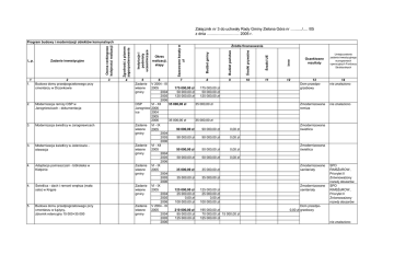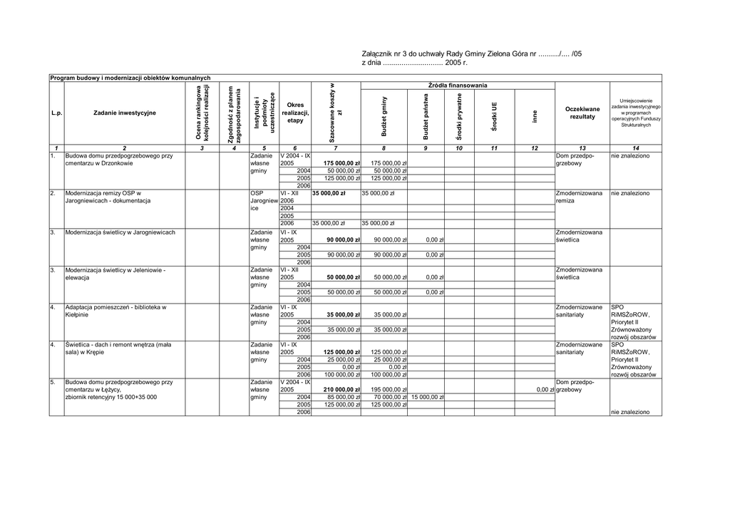 Załącznik nr 3 do uchwały Rady Gminy Zielona Góra nr ........../.... /05 z dnia ............................. 2005 r. 3. Modernizacja świetlicy w Jarogniewicach 3. 4. 4. 5. Modernizacja świetlicy w Jeleniowie elewacja Adaptacja pomieszczeń - biblioteka w Kiełpinie Budżet gminy Szacowane koszty w zł 5 Zadanie własne gminy 6 7 8 V 2004 - IX 2005 175 000,00 zł 175 000,00 zł 2004 50 000,00 zł 50 000,00 zł 2005 125 000,00 zł 125 000,00 zł 2006 OSP VI - XII 35 000,00 zł 35 000,00 zł Jarogniew 2006 ice 2004 2005 2006 35 000,00 zł 35 000,00 zł Zadanie własne gminy Zadanie własne gminy Zadanie własne gminy Świetlica - dach i remont wnętrza (mała sala) w Krępie Zadanie własne gminy Budowa domu przedpogrzebowego przy cmentarzu w Łężycy, zbiornik retencyjny 15 000+35 000 Zadanie własne gminy VI - IX 2005 2004 2005 2006 VI - XII 2005 2004 2005 2006 VI - IX 2005 2004 2005 2006 VI - IX 2005 2004 2005 2006 V 2004 - IX 2005 2004 2005 2006 inne Modernizacja remizy OSP w Jarogniewicach - dokumentacja 4 Środki UE 2. 3 Środki prywatne 2 Budowa domu przedpogrzebowego przy cmentarzu w Drzonkowie Okres realizacji, etapy Źródła finansowania Budżet państwa 1 1. Instytucje i podmioty uczestniczące Zadanie inwestycyjne Zgodność z planem zagospodarowania L.p. Ocena rankingowa kolejności realizacji Program budowy i modernizacji obiektów komunalnych 9 10 11 12 90 000,00 zł 90 000,00 zł 0,00 zł 90 000,00 zł 90 000,00 zł 0,00 zł 50 000,00 zł 50 000,00 zł 0,00 zł 50 000,00 zł 50 000,00 zł 0,00 zł 35 000,00 zł 35 000,00 zł 35 000,00 zł 35 000,00 zł 125 000,00 zł 25 000,00 zł 0,00 zł 100 000,00 zł 125 000,00 zł 25 000,00 zł 0,00 zł 100 000,00 zł 210 000,00 zł 85 000,00 zł 125 000,00 zł 195 000,00 zł 70 000,00 zł 15 000,00 zł 125 000,00 zł Oczekiwane rezultaty Umiejscowienie zadania inwestycyjnego w programach operacyjnych Funduszy Strukturalnych 13 Dom przedpogrzebowy 14 nie znaleziono Zmodernizowana remiza nie znaleziono Zmodernizowana świetlica Zmodernizowana świetlica Zmodernizowane sanitariaty Zmodernizowane sanitariaty SPO RiMSŻoROW, Priorytet II Zrównoważony rozwój obszarów SPO RiMSŻoROW, Priorytet II Zrównoważony rozwój obszarów Dom przedpo0,00 zł grzebowy nie znaleziono 6. 7. 8. 9. 10. 11. 12. 15. 15. Modernizacja remizy OSP w Ochli Remont elewacji i schodów zewnętrznych, Szkoła Podstawowa w Ochli Budowa 8 lokali socjalnych Remont elewacji budynku przedszkola w Przylepie Rozbudowa remizy w Raculi Remont budynku Przedszkola w Raculi Modernizacja remizy OSP w Starym Kisielinie Adaptacja budynku po byłej szkole Remont szkoły podstawowej w Zawadzie OSP Ochla VI - XI 2005 2004 2005 2006 Zadanie III - VIII 2006 własne 2004 gminy 2005 2006 Zadanie VII 2005 XII 2006 własne 2004 gminy 2005 2006 Zadanie I - VIII 2005 własne 2004 gminy 2005 2006 VII 2004 OSP XII 2005 Racula 2004 2005 2006 Zadanie VI - VIII 2004 własne 2004 gminy 2005 2006 OSP Stary VI - IX Kisielin 2004 2004 2005 2006 Zadanie własne VI - X 2004 2004 gminy 2005 2006 Zadanie własne VI - X 2004 gminy 2004 2005 2006 2004 2005 Razem 2006 2004-2006 40 000,00 zł 40 000,00 zł 40 000,00 zł 40 000,00 zł 130 000,00 zł 130 000,00 zł 130 000,00 zł 130 000,00 zł Zmodernizowana remiza Wyremontowana elewacja o pow. 1200 m2 200 000,00 zł SPO RiMSŻoROW, Priorytet II Zrównoważony rozwój obszarów nie znaleziono 8 lokali socjalnych o pow. 320 m2 nie znaleziono Wyremontowana elewacja o pow. 380 m2 nie znaleziono Rozbudowana remiza w Raculi o powierzchni użytkowej 340 m2 SPO RiMSŻoROW, Priorytet II Zrównoważony rozwój obszarów nie znaleziono 135 000,00 zł 135 000,00 zł 60 000,00 zł 75 000,00 zł 60 000,00 zł 75 000,00 zł 415 000,00 zł 15 000,00 zł 200 000,00 zł 200 000,00 zł 415 000,00 zł 15 000,00 zł 200 000,00 zł 200 000,00 zł 195 000,00 zł 120 000,00 zł 75 000,00 zł 195 000,00 zł 120 000,00 zł 75 000,00 zł 40 000,00 zł 40 000,00 zł Zmodernizowana remiza o pow. 80 m2 nie znaleziono 40 000,00 zł 40 000,00 zł 40 000,00 zł 40 000,00 zł Wyremontowany budynek ZPORR, Działanie 3.1. Obszary wiejskie 40 000,00 zł 40 000,00 zł 55 000,00 zł 55 000,00 zł 55 000,00 zł 55 000,00 zł 390 000,00 zł 375 000,00 zł 15 000,00 zł 840 000,00 zł 840 000,00 zł 0,00 zł 540 000,00 zł 540 000,00 zł 0,00 zł 1 770 000,00 zł 1 755 000,00 zł 15 000,00 zł Wyremontowany budynek przedszkola o pow. 240 m2 Wyremontowana ZPORR, Działanie szkoła: wymienione 3.1. Obszary okna, wiejskie wyremontowana elewacja i sala 0,00 zł 0,00 zł 0,00 zł 0,00 zł 0,00 zł 0,00 zł 0,00 zł 0,00 zł 0,00 zł 0,00 zł 0,00 zł 0,00 zł