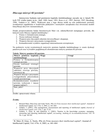 Dlaczego mierzyć KI powiatu? Intensywne badania nad pomiarem kapitału intelektualnego zaczęły się w latach 90tych XX wieku (patrz m.in.: Hall, 1989; Itami, 1991; Roos et al., 1997; Stewart, 1997; Brooking, 1996; Guthrie et al., 2001). Większość prac z tego okresu miała na celu podniesienie poziomu świadomości zagadnienia w środowisku praktyków i teoretyków zarządzania oraz stworzenie modeli klasyfikacji aktywów niematerialnych. Dzięki przeprowadzeniu badan literaturowych Marr i.in. zidentyfikowali następujące powodu, dla których warto Mierzyc kapitał intelektualny1: 1. Pomoc w formułowaniu strategii, 2. Ocena realizacji strategii 3. Wsparcie przy decyzjach odnośnie dywersyfikacji i ekspansji, 4. Wsparcie decyzji o przyznaniu wynagrodzenia 5. Komunikowanie wyników organizacji interesariuszom zewnętrznym Na podstawie wyżej wymienionych motywów pomiaru kapitału intelektualnego w czasie dyskusji panelowych oraz wywiadów pogłębionych sformułowano motywy pomiaru KI powiatu Tabela. Motywy pomiaru KI powiatu. Motyw pomiaru kapitału Waga intelektualnego Po m oc w f o r m uł ow a n i u strategii powiatu Ocena realizacji strategii powiatu Wsparcie przy decyzjach odnośnie rozwoju powiatu, inwestycji itp. Wsparcie decyzji o przyznaniu wynagrodzenia pracownikom urzędu powiatowego Komunikowanie wyników powiatu wyborcom i innym grupom (jakim?) Inne, jakie? Uwagi Źródło: opracowanie własne. Źródła: 1. 2. 3. Bernard Marr, Dina Gray and Andy Neely, Why do Firms measure their intellectual capital?, Journal of Intellectual Capital, Vol. 4 No. 4, 2003, ss. 441-464 Guthrie, J. (2001), ªThe management, measurement and reporting of intellectual capital, Journal of Intellectual Capital, Vol. 2 No. 1, pp. 27-41. Guthrie, J., Petty, R. and Johanson, U. (2001), ªSunrise in the knowledge economy: managing, measuring and reporting intellectual capitalº, Accounting, Auditing & AccountabilityJournal, Vol. 14 No. 4, pp. 365-84. 1 B. Marr, D. Gray, A. Neely, Why do Firms measure their intellectual capital?, Journal of Intellectual Capital, Vol. 4 No. 4, 2003, ss. 441-464 1 4. 5. 6. 7. 8. Hall, R. (1989), The management of intellectual assets: a new corporate perspectiveº, Journal of General Management, Vol. 53 No. 1, pp. 53-68. Itami, H. (1991), Mobilizing Invisible Assets, Harvard University Press, Cambridge, MA. Roos, J., Roos, G., Dragonetti, N.C. and Edvinsson, L. (1997), Intellectual Capital: Navigating the New Business Landscape, Macmillan, London. Stewart, T.A. (1997), Intellectual Capital: The NewWealth of Organizations, Doubleday/Currency, New York, NY. Brooking, A. (1996), Intellectual capital: Core Assets for the Third Millennium Enterprise, Thompson Business Press, London. 2