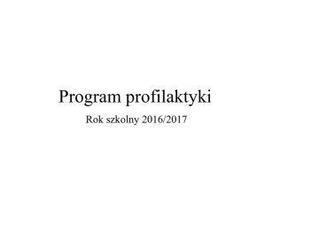 Program profilaktyki Rok szkolny 2016/2017 L.P. I. 1. 2. Działanie Wzmacnianie bezpieczeństwa uczniów w szkole i poza nią Wdrażanie do przestrzegania zasad bezpiecznego zachowania w szkole i poza nią. Kształtowanie umiejętności bezpiecznego poruszania się po drogach. Oczekiwane efekty Formy realizacji - uczeń zna zasady bezpiecznego przebywania i poruszania się na terenie szkoły (sale lekcyjne, świetlica, korytarze, toalety, boisko) i poza nią; - uczeń zna i przestrzega regulaminy poszczególnych sal i pomieszczeń (sala komputerowa, gimnastyczna, biblioteka itd.); - uczeń zna i przestrzega zasad zachowania, w tym bezpieczeństwa podczas zajęć szkolnych, imprez i wycieczek; -zapoznanie ze Statutem Szkoły i wszystkimi regulaminami obowiązującymi w szkole; - odwoływanie się do zapisów regulaminów w różnych sytuacjach: lekcje, przerwy, zajęcia pozalekcyjne, imprezy szkolne i pozaszkolne; - zachęcanie do przestrzegania regulaminów szkolnych; - sumiennie pełnione dyżury nauczycieli podczas przerw, dyskotek; - prowadzenie monitoringu w szkole; - organizowanie bezpiecznych zabaw i gier; - realizacja programów profilaktycznych np. „Powiedz NIE obcemu”; - zapewnienie uczniom właściwej opieki podczas zajęć świetlicowych; -uczeń bezpiecznie i samodzielnie porusza się po drodze; zna i stosuje się do przepisów ruchu drogowego; - zapoznanie uczniów z przepisami i zasadami ruchu drogowego; - zajęcia „Bezpieczna droga do szkoły”; - właściwa organizacja dowozów uczniów do i ze szkoły (zapoznanie uczniów i rodziców z regulaminem dowozów); - przygotowywanie uczniów do egzaminu na kartę rowerową; - konkursy plastyczne, literackie na temat bezpieczeństwa w ruchu drogowym; - przygotowanie i udział uczniów w konkursach np. „Bezpieczeństwo w ruchu drogowym” - spotkania, pogadanki z policjantem; 3. II 1. Kształtowanie umiejętności dbania o bezpieczeństwo swoje i innych. - uczeń potrafi rozpoznać niebezpieczne sytuacje; umie zadbać o własne i innych bezpieczeństwo; - uczeń wie do kogo zwrócić się o pomoc w sytuacji niebezpiecznej; zna numery telefonów ratunkowych; - zapoznanie z procedurami zachowania w sytuacji różnych niebezpieczeństw np. pożar, ewakuacja z budynku, właściwe korzystanie ze sprzętów; - zajęcia udzielania pierwszej pomocy; - udział w ćwiczeniach ewakuacji; - pogadanki, spotkania ze strażakiem, policjantem; - udział w akcji „Bezpieczna zima”; - pogadanki na temat bezpieczeństwa w czasie ferii, wakacji; - ukazywanie uczniom różnych rodzajów zagrożeń, przyczyn i skutków wynikających z nierozważnego zachowania; - ćwiczenie zachowań mających na celu przewidywanie niebezpieczeństw i zapobieganie im; - konkursy plastyczne, ulotki, gazetki dotyczące niebezpieczeństw i sposobów zapobiegania im oraz zachowania w sytuacji zagrożenia; - uwrażliwienie dzieci na możliwość pojawienia się zagrożeń w czasie zabawy; - uczeń zna i stosuje zasady higienicznego i zdrowego trybu życia; - realizacja ścieżki edukacji prozdrowotnej; - uświadamianie uczniom odpowiedzialności za swoje zdrowie i dobre samopoczucie; - udział uczniów w konkursach promujących zdrowy tryb życia; - fluoryzacja zębów; - spotkania z lekarzem, stomatologiem; - projekcje filmów o charakterze prozdrowotnym; - zajęcia na temat chorób zakaźnych i sposobów im zapobiegania; PROPAGOWANIE ZDROWEGO STYLU ŻYCIA Kształtowanie nawyków dbania o zdrowie i higienę osobistą i otoczenia. - przestrzeganie zasad dobrej organizacji pracy i nauki; - zwracanie uwagi na porządek i czystość pomieszczeń; - pogadanki i rozmowy na temat estetyki i czystości ubioru, konieczności dostosowania go do aktualnej pogody; - dostarczanie wiedzy na temat szkodliwego wpływu hałasu na zdrowie człowieka; - organizacja „Dnia ciszy” w szkole; 2. Promowanie właściwego odżywiania się. - uczeń zna i stosuje zasady zdrowego odżywiania się; - pogadanki i rozmowy na temat zasad zdrowego odżywiania się; - realizacja projektu „Śniadanie daje moc”; - akcje „Owoce” i „Mleko” w szkole; - konkursy plastyczne i literackie; 3. Promowanie aktywnego trybu życia. - uczeń ma świadomość jak ważny jest ruch w rozwoju młodego człowieka; - uczeń w sposób aktywny spędza czas wolny; - zajęcia sportowo-rekreacyjne; - rajd rowerowy; - zawody i turnieje sportowe; - realizacja programu „Trzymaj formę”; 4. Przeciwdziałanie uzależnieniom, kształtowanie postaw odpowiedzialności za własne zdrowie. - uczeń rozumie pojęcia: nałóg, uzależnienie; - uczeń wie na czym polegają zagrożenia związane z niewłaściwym korzystaniem z massmediów, w tym z komputera i Internetu; - uczeń jest świadomy zagrożeń związanych ze spożywaniem środków psychoaktywnych; - realizacja programów wychowawczo-profilaktycznych: „Nie pal przy mnie, proszę” - zajęcia wychowawcze w oparciu o bajkę profilaktyczną „Cukierki” - udział w ogólnopolskiej kampanii „Zachowaj Trzeźwy Umysł” - zajęcia edukacyjne dla uczniów, rodziców i nauczycieli; - gazetki, plakaty tematyczne; - Dzień Bezpiecznego Internetu; - realizacja klasowych programów wychowawczych; - udział w konkursach i przedstawieniach profilaktycznych; III ROZWIJANIE UMIEJĘTNOŚCI WSPÓŁŻYCIA SPOŁECZNEGO. 1. Przestrzeganie zasad i reguł współżycia w klasie i szkole. - uczeń stosuje się do zasad i reguł współżycia w klasie i szkole; - czuje się odpowiedzialny za swoje i innych zachowanie; - uczeń zna i przestrzega prawa i obowiązki zawarte w Statucie Szkoły; - wspólne tworzenie kontraktów dotyczących podstawowych zasad współżycia w poszczególnych klasach; - organizacja wyborów „Dobry kolega”; - kształtowanie poczucia odpowiedzialności za swoje zachowanie i umiejętności budowania relacji koleżeńskich i więzi klasowych; - wyposażanie dzieci w wiedzę na temat ogólnych reguł współżycia między ludźmi; - interwencje 