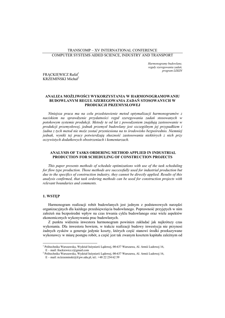TRANSCOMP – XV INTERNATIONAL CONFERENCE COMPUTER SYSTEMS AIDED SCIENCE, INDUSTRY AND TRANSPORT Harmonogramy budowlane, reguły szeregowania zadań, program LEKIN FRĄCKIEWICZ Rafał1 KRZEMIŃSKI Michał2 ANALIZA MOŻLIWOŚCI WYKORZYSTANIA W HARMONOGRAMOWANIU BUDOWLANYM REGUŁ SZEREGOWANIA ZADAŃ STOSOWANYCH W PRODUKCJI PRZEMYSŁOWEJ Niniejsza praca ma na celu przedstawienie metod optymalizacji harmonogramów z naciskiem na sprawdzenie przydatności reguł szeregowania zadań stosowanych w potokowym systemie produkcji. Metody te od lat z powodzeniem znajdują zastosowanie w produkcji przemysłowej, jednak przemysł budowlany jest szczególnym jej przypadkiem i żadna z tych metod nie może zostać przeniesiona na to środowisko bezpośrednio. Niemniej jednak, wyniki tej pracy potwierdzają słuszność zastosowania niektórych z nich przy oczywistych dodatkowych obostrzeniach i komentarzach. ANALYSIS OF TASKS ORDERING METHOD APPLIED IN INDUSTRIAL PRODUCTION FOR SCHEDULING OF CONSTRUCTION PROJECTS This paper presents methods of schedule optimizations with use of the task scheduling for flow type production. Those methods are successfully used for industrial production but due to the specifics of construction industry, they cannot be directly applied. Results of this analysis confirmed, that task ordering methods can be used for construction projects with relevant boundaries and comments. 1. WSTĘP Harmonogram realizacji robót budowlanych jest jednym z podstawowych narzędzi organizacyjnych dla każdego przedsięwzięcia budowlanego. Poprawność przyjętych w nim założeń ma bezpośredni wpływ na czas trwania cyklu budowlanego oraz wiele aspektów ekonomicznych wykonywania prac budowlanych. Z punktu widzenia inwestora harmonogram powinien zakładać jak najkrótszy czas wykonania. Dla inwestora bowiem, w trakcie realizacji budowy inwestycja nie przynosi żadnych zysków a generuje jedynie koszty, których część stanowi środki przekazywane wykonawcy w miarę postępu robót, a część jest tak zwanym kosztem kapitału zależnym od 1 2 Politechnika Warszawska, Wydział Inżynierii Lądowej, 00-637 Warszawa, Al. Armii Ludowej 16, E – mail: [email protected] Politechnika Warszawska, Wydział Inżynierii Lądowej, 00-637 Warszawa, Al. Armii Ludowej 16, E – mail: [email protected], tel.: +48 22 234 62 59 2 Rafał FRĄCKIEWICZ, Michał KRZEMIŃSKI sposobu i czasu finansowania. Od momentu zakończenia budowy, inwestycja staje się aktywną częścią biznesu i zaczyna spełniać swoje podstawowe założenia. W tym przynosić zyski lub środki na spłatę zaciągniętych kredytów. Dla wykonawcy dobrze zaprojektowany harmonogram powinien odpowiadać strukturze organizacyjnej przedsiębiorstwa oraz jego możliwościom finansowym. Wykonanie budowy w krótszym czasie przekłada się między innymi na wysokość środków, którymi wykonawca powinien dysponować w trakcie realizacji robót. Zwiększenie tempa realizacji wymaga przede wszystkim zwiększenia zatrudnienia. W budżecie należy więc zabezpieczyć odpowiednią ilość środków na zobowiązania finansowe w stosunku do pracowników. Większa liczba osób pracujących na budowie wymaga większego zaplecza socjalnego, którego utrzymanie należy również wziąć pod uwagę. Osiągnięcie zamierzonego przerobu nie będzie jednak możliwe przy utrzymaniu tej samej wielkości stanowisk składowych dla wbudowywanych materiałów. Co oznacza nie tylko zabezpieczenie kolejnych środków finansowych na ich zakup ale również, w przypadku gdy inwestor nie dysponuje wystarczająco dużym placem budowy, konieczność wynajęcia dodatkowego placu. W zależności od warunków te i inne czynniki wpływają finalnie na wysokość oferty składanej inwestorowi. Powyższe przykłady są jedynie zarysem zagadnień, które należy wziąć pod uwagę planując przedsięwzięcie budowlane. Cele inwestora i wykonawcy bywają różne a samemu procesowi budowlanemu towarzyszy wiele aspektów technicznych i organizacyjnych. Projektowanie realizacji budowy jest zatem dążeniem do kompromisu pomiędzy stronami procesu, a także możliwymi rozwiązaniami. Ostatecznie, każda przyjęta strategia organizacyjna bazuje na stworzonym dla potrzeb budowy harmonogramie. Niniejsza praca ma na celu przedstawienie metod optymalizacji harmonogramów z naciskiem na sprawdzenie przydatności metod szeregowania zadań w potokowym systemie produkcji. Metody te od lat z powodzeniem znajdują zastosowanie w produkcji przemysłowej, jednak przemysł budowlany jest szczególnym jej przypadkiem i żadna z tych metod nie może zostać przeniesiona na to środowisko bezpośrednio. Niemniej jednak, wyniki tej pracy potwierdzają słuszność zastosowania niektórych z nich przy oczywistych dodatkowych obostrzeniach i komentarzach. Algorytmy i reguły szeregowania zadań zostaną szczegółowo omówione na podstawie harmonogramu robót wykończeniowych dla przykładowej galerii handlowej. Niezbędne obliczenia zostaną wykonane przy pomocy programu wspomagającego harmonogramowanie w produkcji przemysłowej – LEKIN®[4]. Na podstawie otrzymanych z programu wyników i analizie powstanie harmonogram optymalny. 2. POTOKOWE METODY REALIZACJI ROBÓT BUDOWLANYCH Potokowe metody realizacji robót budowlanych są zaczerpnięte z przemysłowych metod produkcji taśmowej. Analogia polega na tym, że brygady robocze są rozpatrywane jak maszyny w fabryce a kolejność prac przez nie wykonywanych ma określoną technologicznie kolejność[1]. Założenia te powodują, że jedynym modyfikacjom może podlegać kolejność poszczególnych działek roboczych. Podstawową zaletą organizacyjną wynikającą z zastosowania modelu pracy równomiernej jest uzyskanie pożądanych właściwości organizacyjnych takich jak ciągłość zatrudnienia, równomierność produkcji oraz zużycia materiałów budowlanych. W tak ANALIZA MOŻLIWOŚCI WYKORZYSTANIA W HARMONOGRAMOWANIU BUDOWLANYM REGUŁ SZER