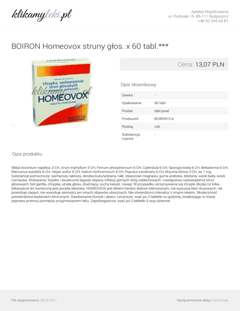 Apteka Współczesna ul. Podwale 15, 85-111 Bydgoszcz +48 52 345 65 81 BOIRON Homeovox struny głos. x 60 tabl.*** Cena: 13,07 PLN Opis słownikowy Dawka - Opakowanie 60 tabl. Postać tabl.powl. Producent BOIRON S.A. Rodzaj Lek Substancja czynna - Opis produktu Skład Aconitum napellus 3 CH, Arum triphyllum 3 CH, Ferrum phosphoricum 6 CH, Calendula 6 CH, Spongia tosta 6 CH, Belladonna 6 CH, Mercurius solubilis 6 CH, Hepar sulfur 6 CH, Kalium bichromicum 6 CH, Populus candicans 6 CH, Bryonia dioica 3 CH; aa 1 mg. Substancje pomocnicze: sacharoza, laktoza, skrobia kukurydziana, talk, stearynian magnezu, guma arabska, żelatyna, wosk biały, wosk Carnauba. Wskazania: Szybko i skutecznie łagodzi objawy infekcji górnych dróg oddechowych i następstwa nadwerężenia strun głosowych: ból gardła, chrypkę, utratę głosu, drażniący, suchy kaszel. Uwagi: W przypadku utrzymywania się chrypki dłużej niż kilka kilkanaście dni konieczna jest porada lekarska. HOMEOVOX jest lekiem bardzo dobrze tolerowanym, nie wysusza błon śluzowych, nie powoduje zaparć, nie wywołuje senności ani innych objawów ubocznych. Nie stwierdzono interakcji z innymi lekami. Skuteczność potwierdzona badaniami klinicznymi. Dawkowanie Dorośli i dzieci: Leczniczo: ssać po 2 tabletki co godzinę, zwiększając w miarę poprawy przerwy pomiędzy przyjmowaniem leku. Zapobiegawczo: ssać po 2 tabletki 5 razy dziennie. Plik wygenerowano: 08-03-2017 Powered by TCPDF (www.tcpdf.org) Oprogramowanie sklepu: AptusShop