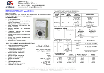ERA-GOST Sp. z o. o. Gostynin 09-500 ul. Płocka 37 tel.: +48 24 2352011 fax +48 24 2353381 www.eragost.pl [email protected] MIERNIK UNIWERSALNY typu UM-112B ZASTOSOWANIE Miernik uniwersalny typu UM-112B jest przeznaczony do pomiarów prądów i napięć, stałych i przemiennych oraz rezystancji. CHARAKTERYSTYKA • 43 zakresy pomiarowe, • System pomiarowy odporny na drgania, wstrząsy czy wibracje, • Zabezpieczenie przed przeciąŜeniami, • Ustrój pomiarowy zabezpieczony jest układem diodowym, • Wspólna podziałka dla wszystkich zakresów, • Przekładnik prądowy do pomiaru prądów przemiennych, • Lusterko pod tarczą minimalizujące błąd paralaksy, • Korektor zera wskazówki Niezawodność • Wygodny uchwyt, • Niezawodność i prostota obsługi. PARAMETRY METROLOGICZNE MIERNIKA Pomiar prądów stałych i przemiennych Rodzaj prądu Klasa Ilość zakresów Zakresy pomiarowe Spadki napięć Stały 1 12 50-100-300µA 1-3-10 mA 30-100-300 mA 1-3-10 A 30-60-80 mV 90 mV 90 mV 90 mV Przemienny 2,5 9 1-3-10 mA 600-500-400 mV 30-100-300 mA 100-100-50 mV 1-3-10 A 50-50-150 mV Zakres częstotliwości podczas pomiarów prądów przemiennych 20...45...65...20 000 Hz Pomiar napięć stałych Klasa Ilość zakresów 1 10 • • • • • • • • • Zasilanie układu omomierza z baterii - zakres omomierza 0…20MΩ: Dokładność pomiaru rezystancji: - w zakresie pomiarowym - poza zakresem pomiarowym Długość podziałki woltomierza i amperomierza Długość podziałki omomierza: Napięcie probiercze izolacji: Wymiary gabarytowe: Masa: Temperatura otoczenia: Wilgotność względna powietrza: PołoŜenie pracy miernika: R-6 1,5 V i 6F22 9V zewn. źródło napięcia 90V − Klasa Ilość zakresów 2,5 7 ±10% wartości wskazanej ±1,5% długości podziałki 100mm 75 mm 3 kV 186 x 134 x 67 mm ok. 900 g 13...23...33°C 25...40...75...85% poziome Rezystancja wewnętrzna 30-100-300 mV 1-3-10 V 30-100-300 V 20 kΩ/V 1000V 1MΩ Pomiar napięć przemiennych DANE TECHNICZNE i WARUNKI EKSPLOATACJI • Zakresy pomiarowe Zakresy pomiarowe Rezystancja wewnętrzna Częstotliwość 1V 100 Ω 20...45...65...10 000 Hz 3V 1000 Ω 10 V 30 V 100-300 V 1000 V 20...45...65...20 000 Hz 1 kΩ/V 20...45...65...2 000 Hz Pomiar rezystancji Zakres wskazań 0...2 kΩ 0...20 kΩ 0...200 kΩ 0...2 MΩ 0...20 MΩ Zakresy pomiarowe 0,01 kΩ...0,4 kΩ 0,1 kΩ...4 kΩ 1 kΩ...40 kΩ 10 kΩ...400 kΩ 0,1 MΩ...4 MΩ ERA-GOST Sp. z o. o., Gostynin 09-500 ul. Płocka 37 tel.: +48 24 2352011 fax +48 24 2353381 KRS: 0000057547 Sąd Rejonowy dla M. St. Warszawy; NIP: 971-06-10-712; Nr GIOŚ: E0006142W www.eragost.pl e-mail: [email protected] Wartości rezyst. dla środka podziałki 75 Ω 750 Ω 7,5 kΩ 75 kΩ 750 kΩ Napięcie zasilania 1,5 V 1,5 V 1,5 V 10,5 V 100,5 V