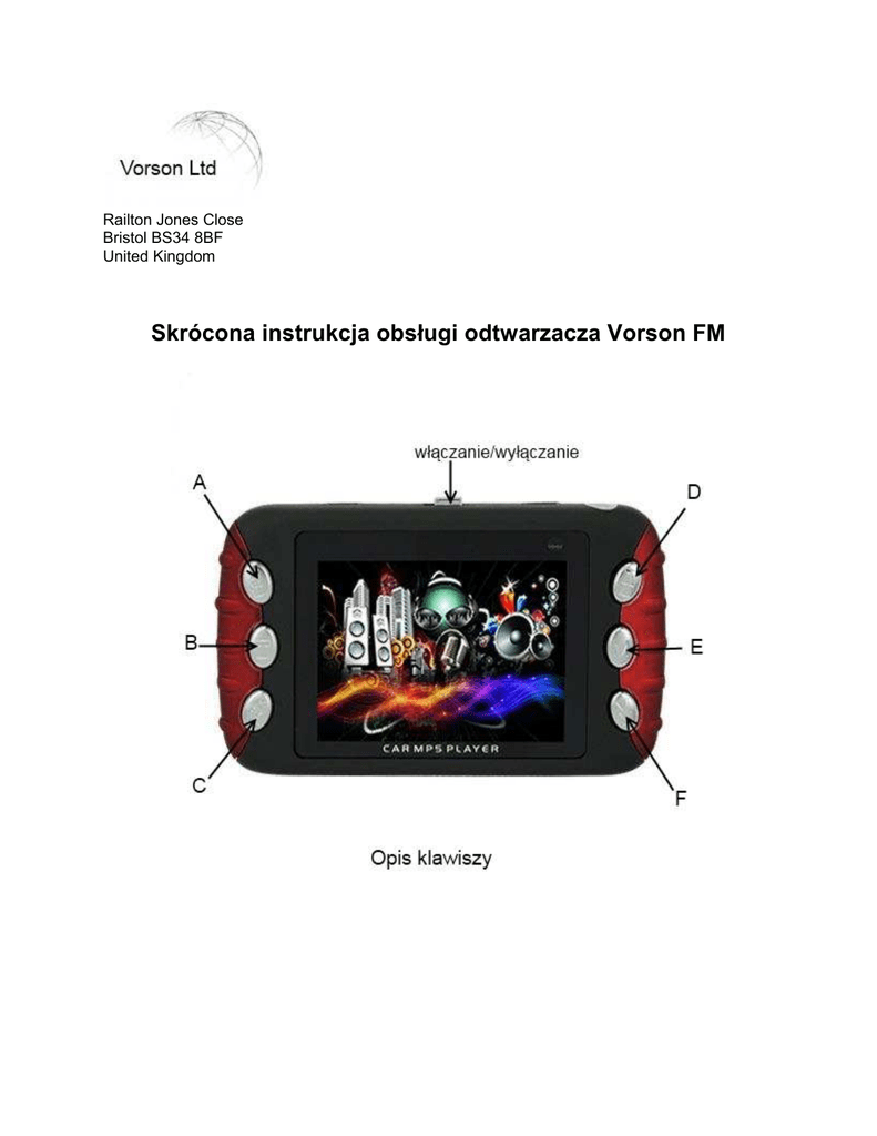Railton Jones Close Bristol BS34 8BF United Kingdom Skrócona instrukcja obsługi odtwarzacza Vorson FM A - klawisz ESCAPE – pozwala na opuszczenie obecnego menu B - klawisz Play/Pause – pojedyncze przyciśnięcie w trakcie odtwarzania utworu pozwala na zatrzymanie oraz wznowienie odtwarzania zarówno muzyki mp3 jaki i odtwarzanych filmów. Przytrzymanie klawisza przez dłuższy czas powoduje wyłączenie urządzenia. C - Volume / Channel – pojedyncze kliknięcie powoduje przejście do ekranu zgłaśniania / ściszania dźwięku. Dwukrotne przyciśnięcie powoduje przejście na ekran wyboru częstotliwości na której transmiter nadaje sygnał. D - Backward – przyciśnięcie tego przycisku powoduje przejście do poprzedniego utworu. Przyciśnięcie i przytrzymanie przycisku powoduje przewijanie aktualnie odtwarzanego utworu (zarówno muzyki jak i filmu) wstecz. W menu pozwala na poruszanie się wstecz. E - Menu – w trakcie odtwarzania utworu powoduje przejście do menu podręcznego. W menu umożliwia zaakceptowanie wyboru – przejście do kolejnego submenu, wybór aktualnie odtwarzanego utworu itp. W trakcie odtwarzania przytrzymanie tego przycisku powoduje przejście do menu głównego pozwalającego na wybór trybu pracy urządzenia (odtwarzanie mp3, przeglądanie zdjęć, odtwarzanie filmów) oraz zmianę ustawień. F - Forward – przyciśnięcie tego przycisku powoduje przejście do następnego utworu. Przyciśnięcie i przytrzymanie przycisku powoduje przewijanie aktualnie odtwarzanego utworu (zarówno muzyki jak i filmu). W menu pozwala na poruszanie się „do przodu”. Cechy charakterystyczne · Funkcja odtwarzania filmów. · Funkcja przeglądania plików obrazów w formacie JPEG. · Transmiter FM · Odtwarzanie wielu formatów plików (MP1, MP2, MP3, WMA, WMV, ASF oraz WAV). · Dostęp do zasobów odtwarzacza jak do dysku twardego za pomocą komputera. · Equalizer z siedmioma wbudowanymi ustawieniami: Normal, Rock, Pop, Classic, Soft, Jazz oraz DBB Opis Działania : - Szybki start oraz ustawienie pracy transmitera fal FM. Zaraz po włączeniu urządzenie znajduje się w trybie odtwarzania muzyki. Aby umożliwić odbiór na odbiorniku radiowym klikamy dwukrotnie w przycisk C (Volume / Channel) i za pomocą przycisków Backward i Forward wybieramy interesującą nas częstotliwość (najlepiej wybrać taką, na której nie „nadaje” żadne radio. Wybór potwierdzamy klawiszem B. Następnie w radiu wybieramy tę samą częstotliwość i możemy delektować się muzyką z odtwarzacza w głośnikach naszego samochodu. Wskazówka – prosimy aby podłączyć odtwarzacz za pomocą załączonego kabla usb do uchwytu. Kabel usb działa także jako przekaźnik – antena, dzięki temu sygnał wysyłany z odtwarzacza będzie silniejszy. - Menu trybu odtwarzania muzyki wywołujemy poprzez naciśniecie przycisku E ( zgodnie z rysunkiem powyżej ) Funkcje menu odtwarzania muzyki : File select – wskazanie folderu plików do odtwarzania Play All – wybranie tej opcji spowoduje kolejne odtwarzanie wszystkich plików znajdujących się w pamięci odtwarzacza. Equalizer – ustawienia odtwarzania plików mp3 według własnych upodobań. Repeat – funkcja powtarzania - normal – utwory odtwarzane są od 1 do ostatniego - repeat one – powtarzanie tylko jednego utworu - repeat All – podobnie jak opcja normal tylko po odsłuchaniu ostatniego utworu automatycznie odtwarzacz włączy utwór pierwszy. Exit - wyjście W menu poruszamy się za pomocą przycisków D oraz F. Przyciskiem E zatwierdzamy wybór. Menu główne Menu główne wywołujemy poprzez naciśnięcie i przytrzymanie przycisku Escape – A. - Music – odtwarzacz plików muzycznych - Movie – odtwarzanie plików video – ustawienia analogiczne do ustawień w trybie odsłuchiwania muzyki. - Photo – przeglądanie plików .jpg - Setup – ustawienia : - Language – ustawienia języka - Contrast – ustawienia kontrastu - Backlight setting – ustawienia podświetlania ekranu. Możliwość ustawienia automatycznego wyłączania podświetlenia – oszczędność baterii. - Memory info – informacja o pamięci odtwarzacza. - F/W Version – wersja oprogramowania. Ładowanie baterii odtwarzacza : • Poprzez uchwyt samochody z gniazdka zapalniczki • Poprzez podpięcie odtwarzacza do komputera za pomocą kabla USB Kopiowanie plików do pamięci odtwarzacza Odtwarzacz działa na zasadzie dysku zewnętrznego pendrive. Po podpięciu odtwarzacza do komputera za pomocą kabla usb zostanie on wykryty jako dodatkowy dysk. Kopiowanie plików odbywa się za pomocą metody „kopiuj – wklej”. Sterowniki nie są wymagane.