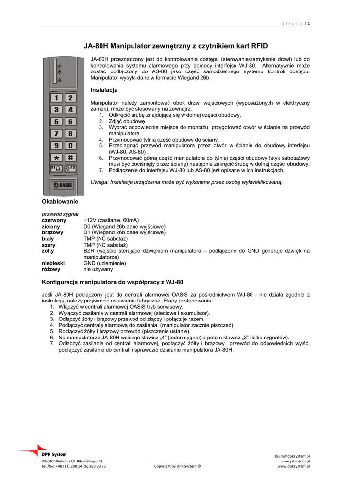 S t r o n a |1 JA-80H Manipulator zewnętrzny z czytnikiem kart RFID JA-80H przeznaczony jest do kontrolowania dostępu (sterowanie/zamykanie drzwi) lub do kontrolowania systemu alarmowego przy pomocy interfejsu WJ-80. Alternatywnie może zostać podłączony do AS-80 jako część samodzielnego systemu kontroli dostępu. Manipulator wysyła dane w formacie Wiegand 26b. Instalacja Manipulator należy zamontować obok drzwi wejściowych (wyposażonych w elektryczny zamek), może być stosowany na zewnątrz. 1. Odkręcić śrubę znajdującą się w dolnej części obudowy. 2. Zdjąć obudowę. 3. Wybrać odpowiednie miejsce do montażu, przygotować otwór w ścianie na przewód manipulatora. 4. Przymocować tylnią część obudowy do ściany. 5. Przeciągnąć przewód manipulatora przez otwór w ścianie do obudowy interfejsu (WJ-80, AS-80) . 6. Przymocować górną część manipulatora do tylniej części obudowy (styk sabotażowy musi być dociśnięty przez ścianę) następnie zakręcić śrubę w dolnej części obudowy. 7. Podłączenie do interfejsu WJ-80 lub AS-80 jest opisane w ich instrukcjach. Uwaga: Instalacja urządzenia może być wykonana przez osobę wykwalifikowaną. Okablowanie przewód sygnał czerwony zielony brązowy biały szary żółty niebieski różowy +12V (zasilanie, 60mA) D0 (Wiegand 26b dane wyjściowe) D1 (Wiegand 26b dane wyjściowe) TMP (NC sabotaż) TMP (NC sabotaż) BZR (wejście sterujące dźwiękiem manipulatora – podłączone do GND generuje dźwięk na manipulatorze) GND (uziemienie) nie używany Konfiguracja manipulatora do współpracy z WJ-80 Jeśli JA-80H podłączony jest do centrali alarmowej OASiS za pośrednictwem WJ-80 i nie działa zgodnie z instrukcją, należy przywrócić ustawienia fabryczne. Etapy postępowania: 1. Włączyć w centrali alarmowej OASiS tryb serwisowy. 2. Wyłączyć zasilanie w centrali alarmowej (sieciowe i akumulator). 3. Odłączyć żółty i brązowy przewód od złączy i połącz je razem. 4. Podłączyć centralę alarmową do zasilania (manipulator zacznie piszczeć). 5. Rozłączyć żółty i brązowy przewód (piszczenie ustanie). 6. Na manipulatorze JA-80H wcisnąć klawisz „4” (jeden sygnał) a potem klawisz „3” (kilka sygnałów). 7. Odłączyć zasilanie od centrali alarmowej, podłączyć żółty i brązowy przewód do odpowiednich wyjść, podłączyć zasilanie do centrali i sprawdzić działanie manipulatora JA-80H. 32-020 Wieliczka Ul. Piłsudskiego 41 tel./fax: +48 (12) 288 14 26; 288 23 75 Copyright by DPK System © [email protected] www.jablotron.pl www.dpksystem.pl S t r o n a |2 Parametry techniczne Zasilanie DC Pobór prądu Obudowa Wytrzymałość mechaniczna Środowisko Temperatura pracy Karta RFID 10V do 16V średnio 60mA IP65 (EN 60529) IK08 (EN 50102) klasa IV (EN 50131-1) -25 do +60°C Jablotron PC-01 lub PC-02 (EM UNIQUE 125 kHz) 46 x 150.5 x 22.5mm 1m klasa 2 (EN 50131-1, TS 50131-3) Wymiary Długość przewodu Poziom bezpieczeństwa JABLOTRON Ltd. deklaruje, iż urządzenie spełnia wszystkie wymogi Dyrektywy 1999/5/EC. Kopia deklaracji zgodności znajduje się na stronie internetowej www.jablotron.pl Uwaga: Urządzenie nie zostało wyprodukowane z żadnych szkodliwych materiałów, jednak w przypadku zużycia zaleca się zwrócić go do punktu zakupu lub producenta. cca 1 m 45 87,5 151,5 TAMPER 22,5 [email protected] www.jablotron.pl 32-020 Wieliczka Ul. Piłsudskiego 41 tel./fax: +48 (12) 288 14 26; 288 23 75 Copyright by DPK System © www.dpksystem.pl