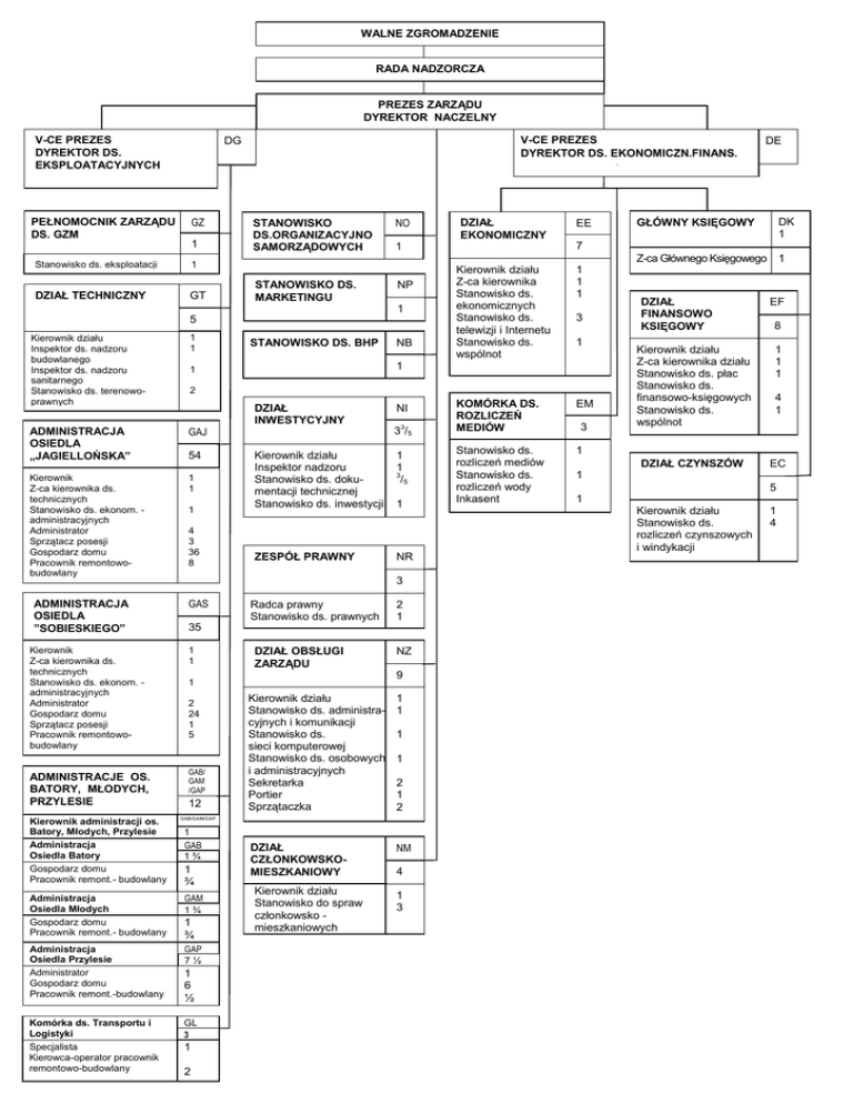 WALNE ZGROMADZENIE RADA NADZORCZA PREZES ZARZĄDU DYREKTOR NACZELNY V-CE PREZES DYREKTOR DS. EKSPLOATACYJNYCH V-CE PREZES DYREKTOR DS. EKONOMICZN.FINANS. DG PEŁNOMOCNIK ZARZĄDU DS. GZM GZ 1 Stanowisko ds. eksploatacji 1 DZIAŁ TECHNICZNY GT STANOWISKO DS.ORGANIZACYJNO SAMORZĄDOWYCH STANOWISKO DS. MARKETINGU 1 1 ADMINISTRACJA OSIEDLA „JAGIELLOŃSKA” GAJ Kierownik Z-ca kierownika ds. technicznych Stanowisko ds. ekonom. administracyjnych Administrator Sprzątacz posesji Gospodarz domu Pracownik remontowobudowlany 1 1 ADMINISTRACJA OSIEDLA ”SOBIESKIEGO” Kierownik Z-ca kierownika ds. technicznych Stanowisko ds. ekonom. administracyjnych Administrator Gospodarz domu Sprzątacz posesji Pracownik remontowobudowlany ADMINISTRACJE OS. BATORY, MŁODYCH, PRZYLESIE Kierownik administracji os. Batory, Młodych, Przylesie Administracja Osiedla Batory Gospodarz domu Pracownik remont.- budowlany STANOWISKO DS. BHP DZIAŁ EKONOMICZNY 1 NP 1 5 5 Kierownik działu Inspektor ds. nadzoru budowlanego Inspektor ds. nadzoru sanitarnego Stanowisko ds. terenowoprawnych NO NB EE Kierownik działu Z-ca kierownika Stanowisko ds. ekonomicznych Stanowisko ds. telewizji i Internetu Stanowisko ds. wspólnot 1 1 1 KOMÓRKA DS. ROZLICZEŃ MEDIÓW EM Stanowisko ds. rozliczeń mediów Stanowisko ds. rozliczeń wody Inkasent 1 3 1 2 54 1 4 3 36 8 GAS DZIAŁ INWESTYCYJNY NI 33/5 Kierownik działu Inspektor nadzoru Stanowisko ds. dokumentacji technicznej Stanowisko ds. inwestycji 1 1 3 /5 ZESPÓŁ PRAWNY NR R 3 R Radca prawny Stanowisko ds. prawnych 1 2 1 35 1 1 DZIAŁ OBSŁUGI ZARZĄDU 1 2 24 1 5 GAB/ GAM /GAP 12 NZ Z 9 Kierownik działu Stanowisko ds. administracyjnych i komunikacji Stanowisko ds. sieci komputerowej Stanowisko ds. osobowych i administracyjnych Sekretarka Portier Sprzątaczka 1 1 DZIAŁ CZŁONKOWSKOMIESZKANIOWY NM 1 1 2 1 2 GAB/GAM/GAP 1 GAB 1¾ 1 ¾ Administracja Osiedla Młodych Gospodarz domu Pracownik remont.- budowlany GAM 1¾ Administracja Osiedla Przylesie Administrator Gospodarz domu Pracownik remont.-budowlany GAP 7½ Komórka ds. Transportu i Logistyki Specjalista Kierowca-operator pracownik remontowo-budowlany GL 3 1 ¾ 1 6 ½ 1 2 Kierownik działu Stanowisko do spraw członkowsko mieszkaniowych 4 1 3 GŁÓWNY KSIĘGOWY DK 1 Z-ca Głównego Księgowego 1 EE 7 1 1 DE 3 DZIAŁ FINANSOWO KSIĘGOWY EF 8 Kierownik działu Z-ca kierownika działu Stanowisko ds. płac Stanowisko ds. finansowo-księgowych Stanowisko ds. wspólnot 1 1 1 DZIAŁ CZYNSZÓW EC 4 1 1 5 1 Kierownik działu Stanowisko ds. rozliczeń czynszowych i windykacji 1 4