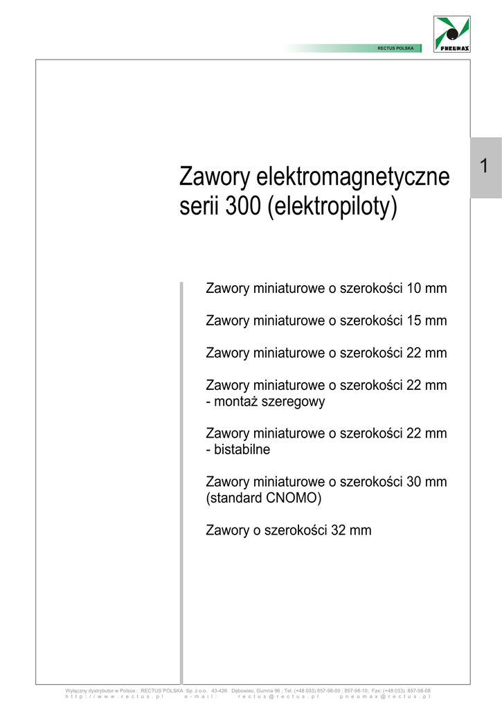 RECTUS POLSKA Zawory elektromagnetyczne serii 300 (elektropiloty) Zawory miniaturowe o szerokoœci 10 mm Zawory miniaturowe o szerokoœci 15 mm Zawory miniaturowe o szerokoœci 22 mm Zawory miniaturowe o szerokoœci 22 mm - monta¿ szeregowy Zawory miniaturowe o szerokoœci 22 mm - bistabilne Zawory miniaturowe o szerokoœci 30 mm (standard CNOMO) Zawory o szerokoœci 32 mm Wy³¹czny dystrybutor w Polsce : RECTUS POLSKA Sp. z o.o. 43-426 Dêbowiec, Gumna 96 ; Tel. (+48 033) 857-98-00 ; 857-98-10; Fax: (+48 033) 857-98-08 h t t p : / / w w w . r e c t u s . p l e - m a i l : r e c t u s @ r e c t u s . p l p n e u m a x @ r e c t u s . p l 1 Zawory elektromagnetyczne sterowane bezpoœrednio Seria 300 RECTUS POLSKA Wstêp Zawory elektromagnetyczne sterowane bezpoœrednio sprzêgaj¹ elektronikê z pneumatyk¹. Sterowane sygna³em elektrycznym pozwalaj¹ na wyjœciu otrzymaæ sygna³ pneumatyczny mog¹cy byæ wykorzystany przez mniejsze elementy wykonawcze (ma³e si³owniki). Najczêstszym zastosowaniem zaworów elektromagnetycznych serii 300 jest sterowanie wiêkszymi rozdzielaczami pneumatycznymi. Firma PNEUMAX oferuje szerok¹ gamê zaworów elektromagnetycznych (pilotów) dla szeregu zastosowañ. Od miniaturowych zaworów 2/2 i 3/2 normalnie zamkniêtych lub otwartych do zaworów 32 mm przystosowanych do sterowania wiêkszych zaworów. Nale¿y zauwa¿yæ, ¿e zawory elektromagnetyczne (piloty ) mo¿na stosowaæ do bezpoœredniego sterowania mniejszymi odbiornikami (np. si³ownikiem ze sprê¿yn¹) poprzez dopasowanie odpowiedniej bazy (indywidualnej lub grupowej, z przy³¹czami pd w¹¿ 4mm, gwint M5 lub G 1/8) Zawory elektromagnetyczne wystêpuj¹ równie¿ w wersjach z homologacj¹ wa¿n¹ w USA i Kanadzie. ( w razie takiej potrzeby prosimy o skierowanie zapytania do firmy Rectus Polska ). Obs³uga i u¿ytkowanie Specjalna obs³uga nie jest wymagana, dlatego nie podano listy czêœci zamiennych. Z³o¿ona konstrukcja zaworów i ich niski koszt, wysokie koszty robocizny czyni¹ naprawê ekonomicznie nieop³acaln¹. Bardziej op³acalna jest wymiana kompletnego zaworu. Dla w³aœciwego smarowania nale¿y u¿ywaæ tylko olei hydraulicznych klasy H np. Castrol typu MAGNA GC 32. 1.1 Wy³¹czny dystrybutor w Polsce : RECTUS POLSKA Sp. z o.o. 43-426 Dêbowiec, Gumna 96 ; Tel. (+48 033) 857-98-00 ; 857-98-10; Fax: (+48 033) 857-98-08 h t t p : / / w w w . r e c t u s . p l e - m a i l : r e c t u s @ r e c t u s . p l p n e u m a x @ r e c t u s . p l Zawory elektromagnetyczne miniaturowe, sterowane bezpoœrednio, o szerokoœci 32 mm Seria 300 RECTUS POLSKA Schemat dzia³ania Normalnie Zamkniêty (N.Z.) 3/2 lub 2/2 3 3 2 3 1 2 1 2 1 1 = WEJŒCIE 2 = WYJŒCIE 3 = ODPOWIETRZENIE (korek, jeœli w funkcji 2/2) 2 1 W SPOCZYNKU AKTYWNY Normalnie Otwarty (N.O.) 3/2 lub 2/2 1 1 2 3 1 2 1 2 3 W SPOCZYNKU 2 3 AKTYWNY Budowa: Czêœci elektryczne : Cewki nawiniête drutem nawojowym miedzianym odpowiednim do danego napiêcia. Izolacja zgodna ze standardem "H" . Wszystkie czæœci wykonano z materia³ów odpornych na korozjê. Czêœci mechaniczne: Sprê¿yna, trzpieñ i suwak zaworu wykonane s¹ ze stali nierdzewnej (AISI 430F), uszczelki suwaka wykonano z vitonu, p³ytka przy³¹czaniowa wykonana ze stopu cynku, uszczelnienia z gumy NBR, przesterowanie rêczne - niklowany mosi¹dz, niklowana stal - nakrêtka zabezpieczaj¹ca cewkê, stal cynkowana - œruby monta¿owe. Cewka do u¿ytku z na bazie lub bezpoœrednio na sterowanym wiêkszym zawo¿e (jako pilot). 1.21 Wy³¹czny dystrybutor w Polsce : RECTUS POLSKA Sp. z o.o. 43-426 Dêbowiec, Gumna 96 ; Tel. (+48 033) 857-98-00 ; 857-98-10; Fax: (+48 033) 857-98-08 h t t p : / / w w w . r e c t u s . p l e - m a i l : r e c t u s @ r e c t u s . p l p n e u m a x @ r e c t u s . p l Zawory elektromagnetyczne miniaturowe, sterowane bezpoœrednio, o szerokoœci 32 mm Seria 300 RECTUS POLSKA Dane techniczne Czêœæ pneumatyczna Czêœæ elektryczna Ciœnienie robocze Œrednica nominalna Maksymalna temperatura medium Maksymalna temperatura otoczenia Maksymalny przep³yw przy 6 barach i Dp = 1 Szybkoœæ ( w cyklach na minutæ) Medium Smarowanie Czas bezawaryjnej pracy Pobór mocy (za³¹czanie) - D.C. Pobór mocy (za³¹czanie) - A.C. Pobór mocy (stan aktwny) - D.C. Pobór mocy (stan aktwny) - A.C. Tolerancja napiêcia Czas otwarcia Czas zamkniêcia Klasa izolacji przewodu miedzianego Klasa izolacji cewki Zabezpieczenie wtyczki Zabezpieczenie przewodu 0 ¸ 10 bar 1,8 mm 50°C 50°C 80 NI/min 700 Powietrze - Pró¿nia - Gazy obojêtne nie wymagane 40 - 50 milionów cykli 19,5 VA 8,2 W 9 VA ±10% 40 ms 21 ms H F IP 65 PG 11 1 Czasy zamkniêcia i otwarcia zaworu ustalone zgodnie z procedur¹ CETO RP 82 P. Obs³uga i czêœci zamienne: U¿ytkowanie zaworów podobne do opisanego dla poprzednich typów zaworów. Wymiana grzybka lub suwaka zaworu nie zalecana ze wzglêdu na trudnoœæ w dopasowaniu nowego elementu do zu¿ytego czêœciowo zaworu. Zwracaæ uwagê na brud gromadz¹cy siê pomiêdzy powierzchni¹ wewnêtrzn¹ rdzenia a suwakiem. Mo¿e on powodowaæ wadliw¹ pracê zaworu i przegrzewanie siê cewki. Nale¿y zadbaæ o mo¿liwie najlepsz¹ jakoœæ styku elektrycznego, szczególnie podczas zasilania cewki niskim napiêciem (12-24 V). Korozja spowodowana utlenianiem styków pomiêdzy wtyczk¹ a cewk¹ prowadzi do trudnych do wykrycia awarii. Mo¿e to powodowaæ b³êdy w sygnalizacji stanu instalacji . Styki nale¿y zabezpieczyæ œrodkami do tego przeznaczonymi ( np. specjalnymi sprayami) . Wy³¹czny dystrybutor w Polsce : RECTUS POLSKA Sp. z o.o. 43-426 Dêbowiec, Gumna 96 ; Tel. (+48 033) 857-98-00 ; 857-98-10; Fax: (+48 033) 857-98-08 h t t p : / / w w w . r e c t u s . p l e - m a i l : r e c t u s @ r e c t u s . p l p n e u m a x @ r e c t u s . p l 1.22 Zawory elektromagnetyczne miniaturowe, sterowane bezpoœrednio, o szerokoœci 32 mm Seria 300 RECTUS POLSKA Zawór elektromagnetyczny typu S i S/1 Normalnie Otwarty Normalnie Zamkniêty (N.C.) - S