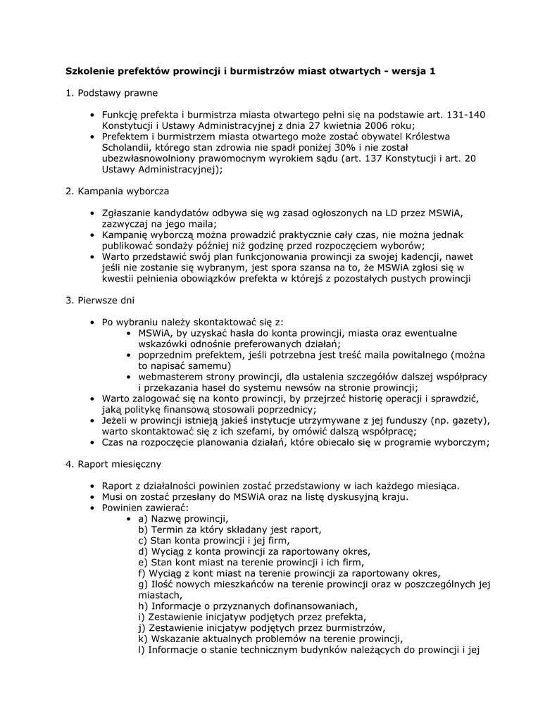 Szkolenie prefektów prowincji i burmistrzów miast otwartych - wersja 1 1. Podstawy prawne • Funkcję prefekta i burmistrza miasta otwartego pełni się na podstawie art. 131-140 Konstytucji i Ustawy Administracyjnej z dnia 27 kwietnia 2006 roku; • Prefektem i burmistrzem miasta otwartego może zostać obywatel Królestwa Scholandii, którego stan zdrowia nie spadł poniżej 30% i nie został ubezwłasnowolniony prawomocnym wyrokiem sądu (art. 137 Konstytucji i art. 20 Ustawy Administracyjnej); 2. Kampania wyborcza • Zgłaszanie kandydatów odbywa się wg zasad ogłoszonych na LD przez MSWiA, zazwyczaj na jego maila; • Kampanię wyborczą można prowadzić praktycznie cały czas, nie można jednak publikować sondaży później niż godzinę przed rozpoczęciem wyborów; • Warto przedstawić swój plan funkcjonowania prowincji za swojej kadencji, nawet jeśli nie zostanie się wybranym, jest spora szansa na to, że MSWiA zgłosi się w kwestii pełnienia obowiązków prefekta w którejś z pozostałych pustych prowincji 3. Pierwsze dni • Po wybraniu należy skontaktować się z: • MSWiA, by uzyskać hasła do konta prowincji, miasta oraz ewentualne wskazówki odnośnie preferowanych działań; • poprzednim prefektem, jeśli potrzebna jest treść maila powitalnego (można to napisać samemu) • webmasterem strony prowincji, dla ustalenia szczegółów dalszej współpracy i przekazania haseł do systemu newsów na stronie prowincji; • Warto zalogować się na konto prowincji, by przejrzeć historię operacji i sprawdzić, jaką politykę finansową stosowali poprzednicy; • Jeżeli w prowincji istnieją jakieś instytucje utrzymywane z jej funduszy (np. gazety), warto skontaktować się z ich szefami, by omówić dalszą współpracę; • Czas na rozpoczęcie planowania działań, które obiecało się w programie wyborczym; 4. Raport miesięczny • Raport z działalności powinien zostać przedstawiony w iach każdego miesiąca. • Musi on zostać przesłany do MSWiA oraz na listę dyskusyjną kraju. • Powinien zawierać: • a) Nazwę prowincji, b) Termin za który składany jest raport, c) Stan konta prowincji i jej firm, d) Wyciąg z konta prowincji za raportowany okres, e) Stan kont miast na terenie prowincji i ich firm, f) Wyciąg z kont miast na terenie prowincji za raportowany okres, g) Ilość nowych mieszkańców na terenie prowincji oraz w poszczególnych jej miastach, h) Informacje o przyznanych dofinansowaniach, i) Zestawienie inicjatyw podjętych przez prefekta, j) Zestawienie inicjatyw podjętych przez burmistrzów, k) Wskazanie aktualnych problemów na terenie prowincji, l) Informacje o stanie technicznym budynków należących do prowincji i jej firm, m) Informacje o stanie technicznym budynków należących do miast na terenie prowincji i ich firm. • (za "Rozporządzeniem o podsumowaniu działalności prefektów i burmistrzów" z dnia 2 grudnia 2007 r.) 5. Wspieranie inicjatyw, inwestycji • W wypadku zgłoszenia się któregoś z obywateli odnośnie przyznania dotacji dla inicjatywy bądź inwestycji można samemu wniosek rozpatrzyć. Warto jednak skonsultować się z Ministrem Finansów, który pomoże w ustaleniu szczegółów dotacji, korzystnych dla obu stron. • Jeżeli jakaś już istniejąca i działająca prężnie inicjatywa w obrębie kraju zostanie uznana za wartą dotacji, również można taką dotację wydać, uzasadniając powody jej przyznania. 6. Pomoc nowym obywatelom • Warto interesować się sytuacją obywateli w swojej prowincji, tak by utrzymać ich w kraju. • Jeżeli któryś zwróci się o pomoc w znalezieniu pracy lub zorganizowaniu jakiejś inicjatywy, należy znaleźć kogoś, kto mu pomoże, lub zrobić to samemu. 7. Wydawanie aktów prawa miejscowego • Prefekt prowincji ma prawo do wydawania aktów prawa miejscowego, regulujących: • - zasady przyznawania dofinansowań firm z funduszy prowincji, - zasady wspierania instytucji kulturalnych, sportowych i edukacyjnych działających na terenie prowincji, - zasady działania lokalnej listy dyskusyjnej, - sposób zagospodarowania przestrzennego prowincji, - zasady gospodarowania mieniem prowincji, - sposoby promocji prowincji, - sposoby promocji aktywności mieszkańców. • za "Ustawą administracyjną" z dnia 27 kwietnia 2006 r. Szkolenie to dotyczy również burmistrzów miast otwartych. Autor: Mat Max Sygnatura: szkolenie pr/bu/v01