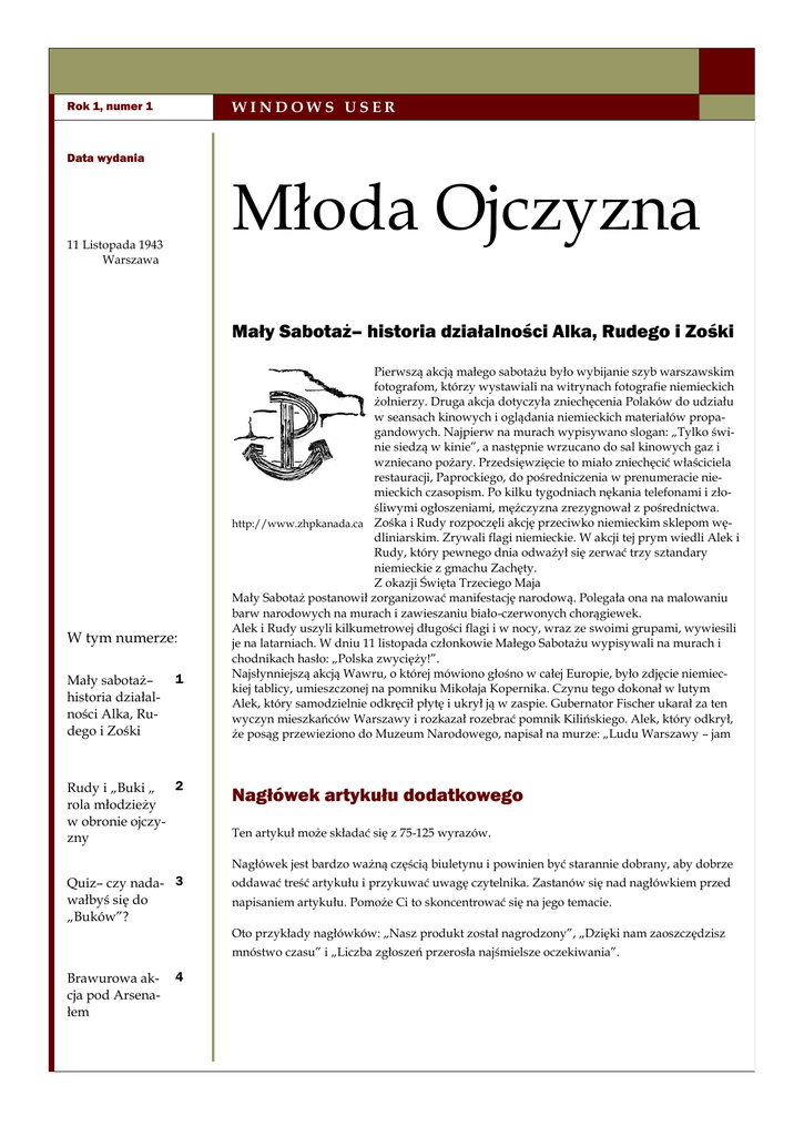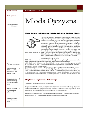 WINDOWS USER Rok 1, numer 1 Data wydania Młoda Ojczyzna 11 Listopada 1943 Warszawa Mały Sabotaż– historia działalności Alka, Rudego i Zośki W tym numerze: Mały sabotaż– historia działalności Alka, Rudego i Zośki 1 2 Rudy i „Buki „ rola młodzieży w obronie ojczyzny Pierwszą akcją małego sabotażu było wybijanie szyb warszawskim fotografom, którzy wystawiali na witrynach fotografie niemieckich żołnierzy. Druga akcja dotyczyła zniechęcenia Polaków do udziału w seansach kinowych i oglądania niemieckich materiałów propagandowych. Najpierw na murach wypisywano slogan: „Tylko świnie siedzą w kinie”, a następnie wrzucano do sal kinowych gaz i wzniecano pożary. Przedsięwzięcie to miało zniechęcić właściciela restauracji, Paprockiego, do pośredniczenia w prenumeracie niemieckich czasopism. Po kilku tygodniach nękania telefonami i złośliwymi ogłoszeniami, mężczyzna zrezygnował z pośrednictwa. http://www.zhpkanada.ca Zośka i Rudy rozpoczęli akcję przeciwko niemieckim sklepom wędliniarskim. Zrywali flagi niemieckie. W akcji tej prym wiedli Alek i Rudy, który pewnego dnia odważył się zerwać trzy sztandary niemieckie z gmachu Zachęty. Z okazji Święta Trzeciego Maja Mały Sabotaż postanowił zorganizować manifestację narodową. Polegała ona na malowaniu barw narodowych na murach i zawieszaniu biało-czerwonych chorągiewek. Alek i Rudy uszyli kilkumetrowej długości flagi i w nocy, wraz ze swoimi grupami, wywiesili je na latarniach. W dniu 11 listopada członkowie Małego Sabotażu wypisywali na murach i chodnikach hasło: „Polska zwycięży!”. Najsłynniejszą akcją Wawru, o której mówiono głośno w całej Europie, było zdjęcie niemieckiej tablicy, umieszczonej na pomniku Mikołaja Kopernika. Czynu tego dokonał w lutym Alek, który samodzielnie odkręcił płytę i ukrył ją w zaspie. Gubernator Fischer ukarał za ten wyczyn mieszkańców Warszawy i rozkazał rozebrać pomnik Kilińskiego. Alek, który odkrył, że posąg przewieziono do Muzeum Narodowego, napisał na murze: „Ludu Warszawy – jam Nagłówek artykułu dodatkowego Ten artykuł może składać się z 75-125 wyrazów. Nagłówek jest bardzo ważną częścią biuletynu i powinien być starannie dobrany, aby dobrze Quiz– czy nada- 3 wałbyś się do „Buków”? oddawać treść artykułu i przykuwać uwagę czytelnika. Zastanów się nad nagłówkiem przed napisaniem artykułu. Pomoże Ci to skoncentrować się na jego temacie. Oto przykłady nagłówków: „Nasz produkt został nagrodzony”, „Dzięki nam zaoszczędzisz mnóstwo czasu” i „Liczba zgłoszeń przerosła najśmielsze oczekiwania”. Brawurowa akcja pod Arsenałem 4 Młoda Ojczyzna Str. 2 Rudy i „Buki”- rola młodzieży w obronie ojczyzny organizacjami. Nasze życie częściej jest narażone na niebezpieczeństwo. Mimo wszystko działamy jak bracia i każdy oddałby życie za innego. E.C: Kiedy i jak poznałeś swoich naj- Windows clip art lepszych przyjaciół? J.B: Poznaliśmy się jeszcze przed wojną chodząc do jednego gimnazjum. E.C: Jak zarabiasz na życie podczas „Umiejętność znoszenia niepowodzeń jest wojny? http://zielonowglowie.blogst.com Wywiad z Janem Bytnarem „Rudym” Edyta Cisło: Skąd się wzięło twoje wielką i ważną przezwisko „Rudy”? umiejętnością. przyczyniły się do wymyślenia tego Oczywiście jeśli Jan Bytnar: Jak widać moje rude włosy przezwiska. E.C.: Czy należysz lub należałeś do ja- towarzyszy jej kichś organizacji? zdolność i chęć należeliśmy do „Buków” do wyciągania nauki z porażek…” J.B.: Tak, ja i moi najlepsi przyjaciele E.C: Możesz mi dokładniej powiedzieć czym są „Buki”? J.B.: Jest to drużyna harcerska, której dowódcą był „Zeus”, nasz nauczyciel geografii. E.C: A dlaczego akurat „Buki”? J.B: Nazwa ta wzięła się od naszych Aleksander Kamiński częstych wypraw do lasu. „Kamienie na szaniec” E.C: Co robiliście na takich spotkaniach? J.B: Głównie rozmawialiśmy, poznawaliśmy się, każdy z nas był inny. E.C: Wiem, że „Buki” później stały się tajną organizacją podziemną. Co się zmieniło i co było waszym celem? J.B: Zaczęliśmy działać przeciwko okupantowi, współpracujemy z innymi J.B.: Zacząłem niedawno pracę, wyrabiam marmoladę. E.C.: Czyli wtedy, gdy zacząłeś pracę, to skończyłeś z organizacjami? J.B.: Niezupełnie, jakiś czas później przystąpiłem do organizacji „Wawer”. E.C.: Co robicie w tej organizacji? J.B.: Robimy wiele propagandowych akcji. Między innymi zbijaliśmy szyby z fotografiami Niemców, zrywaliśmy niemieckie flagi. E.C.: Co zdecydowało o tym, że tak bardzo chcesz pomagać Polsce? J.B.: Gdy wędrowaliśmy razem z harcerzami po lesie, zauważyliśmy samoloty ostrzeliwujące pociąg z uchodźcami. Niby nic takiego, przecież jest wojna, ale jednak coś we mnie drgnęło. Wtedy uświadomiłem sobie, że jestem Polakiem i jestem zobowiązany do obrony mojego kraju. E.C.: Dziękuję za wywiad. Str. 3 Quiz– czy nadawał/a byś się do „Buków”? 1.Czy jesteś odważny/a? A. Tak B. Nie Windows clip art C. Nie wiem, zależy w jakiej sytuacji 2.Oddał/a byś życie za przyjaciół? A. Tak B. Nie C. Myślę, że tak 3.Jesteś sprytny/a? „Tylko odwaga i A. Tak zdecydowanie B. Nie wydaje mi się połączone ze C. Nawet bardzo, mam dobre pomysły 4.Co jest dla Ciebie najważniejsze? spokojem i A. Rodzina, przyjaciele, kraj trzeźwością dają B. Rodzina, dobra zabawa, pieniądze powodzenie.” C. Przyjaźń, zabawa, wolność 5.Dlaczego chciałbyś/chciałabyś być w „Bukach”? „Kamienie na szaniec” A. Chcę walczyć z Niemcami B. Myślę że to dobra zabawa C. Poznam tam przyjaciół Najwięcej odp. A Najwięcej odp. B Z Twoich odpowiedzi Stanowczo nie pa- Żeby dołączyć do wynika, że nadawałbyś sujesz do tej orga- się do „Buków”. Kieru- nizacji młodzieżo- byś jeszcze nad jesz się w ży
