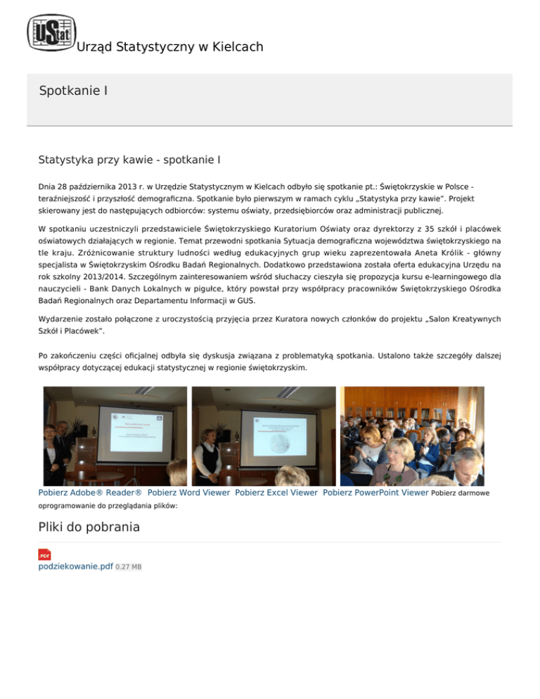 Urząd Statystyczny w Kielcach Spotkanie I Statystyka przy kawie - spotkanie I Dnia 28 października 2013 r. w Urzędzie Statystycznym w Kielcach odbyło się spotkanie pt.: Świętokrzyskie w Polsce teraźniejszość i przyszłość demograficzna. Spotkanie było pierwszym w ramach cyklu „Statystyka przy kawie”. Projekt skierowany jest do następujących odbiorców: systemu oświaty, przedsiębiorców oraz administracji publicznej. W spotkaniu uczestniczyli przedstawiciele Świętokrzyskiego Kuratorium Oświaty oraz dyrektorzy z 35 szkół i placówek oświatowych działających w regionie. Temat przewodni spotkania Sytuacja demograficzna województwa świętokrzyskiego na tle kraju. Zróżnicowanie struktury ludności według edukacyjnych grup wieku zaprezentowała Aneta Królik - główny specjalista w Świętokrzyskim Ośrodku Badań Regionalnych. Dodatkowo przedstawiona została oferta edukacyjna Urzędu na rok szkolny 2013/2014. Szczególnym zainteresowaniem wśród słuchaczy cieszyła się propozycja kursu e-learningowego dla nauczycieli - Bank Danych Lokalnych w pigułce, który powstał przy współpracy pracowników Świętokrzyskiego Ośrodka Badań Regionalnych oraz Departamentu Informacji w GUS. Wydarzenie zostało połączone z uroczystością przyjęcia przez Kuratora nowych członków do projektu „Salon Kreatywnych Szkół i Placówek”. Po zakończeniu części oficjalnej odbyła się dyskusja związana z problematyką spotkania. Ustalono także szczegóły dalszej współpracy dotyczącej edukacji statystycznej w regionie świętokrzyskim. Pobierz Adobe® Reader® Pobierz Word Viewer Pobierz Excel Viewer Pobierz PowerPoint Viewer Pobierz darmowe oprogramowanie do przeglądania plików: Pliki do pobrania podziekowanie.pdf 0.27 MB