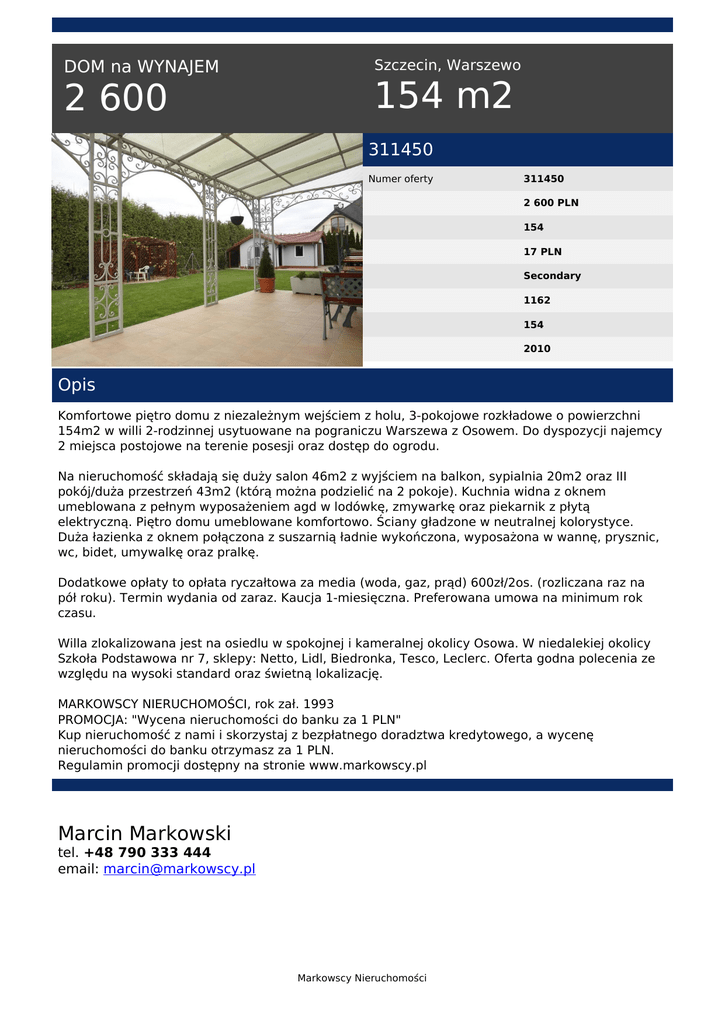 DOM na WYNAJEM 2 600 Szczecin, Warszewo 154 m2 311450 Numer oferty 311450 2 600 PLN 154 17 PLN Secondary 1162 154 2010 Opis Komfortowe piętro domu z niezależnym wejściem z holu, 3-pokojowe rozkładowe o powierzchni 154m2 w willi 2-rodzinnej usytuowane na pograniczu Warszewa z Osowem. Do dyspozycji najemcy 2 miejsca postojowe na terenie posesji oraz dostęp do ogrodu. Na nieruchomość składają się duży salon 46m2 z wyjściem na balkon, sypialnia 20m2 oraz III pokój/duża przestrzeń 43m2 (którą można podzielić na 2 pokoje). Kuchnia widna z oknem umeblowana z pełnym wyposażeniem agd w lodówkę, zmywarkę oraz piekarnik z płytą elektryczną. Piętro domu umeblowane komfortowo. Ściany gładzone w neutralnej kolorystyce. Duża łazienka z oknem połączona z suszarnią ładnie wykończona, wyposażona w wannę, prysznic, wc, bidet, umywalkę oraz pralkę. Dodatkowe opłaty to opłata ryczałtowa za media (woda, gaz, prąd) 600zł/2os. (rozliczana raz na pół roku). Termin wydania od zaraz. Kaucja 1-miesięczna. Preferowana umowa na minimum rok czasu. Willa zlokalizowana jest na osiedlu w spokojnej i kameralnej okolicy Osowa. W niedalekiej okolicy Szkoła Podstawowa nr 7, sklepy: Netto, Lidl, Biedronka, Tesco, Leclerc. Oferta godna polecenia ze względu na wysoki standard oraz świetną lokalizację. MARKOWSCY NIERUCHOMOŚCI, rok zał. 1993 PROMOCJA: "Wycena nieruchomości do banku za 1 PLN" Kup nieruchomość z nami i skorzystaj z bezpłatnego doradztwa kredytowego, a wycenę nieruchomości do banku otrzymasz za 1 PLN. Regulamin promocji dostępny na stronie www.markowscy.pl Marcin Markowski tel. +48 790 333 444 email: [email protected] Markowscy Nieruchomości Powered by TCPDF (www.tcpdf.org)