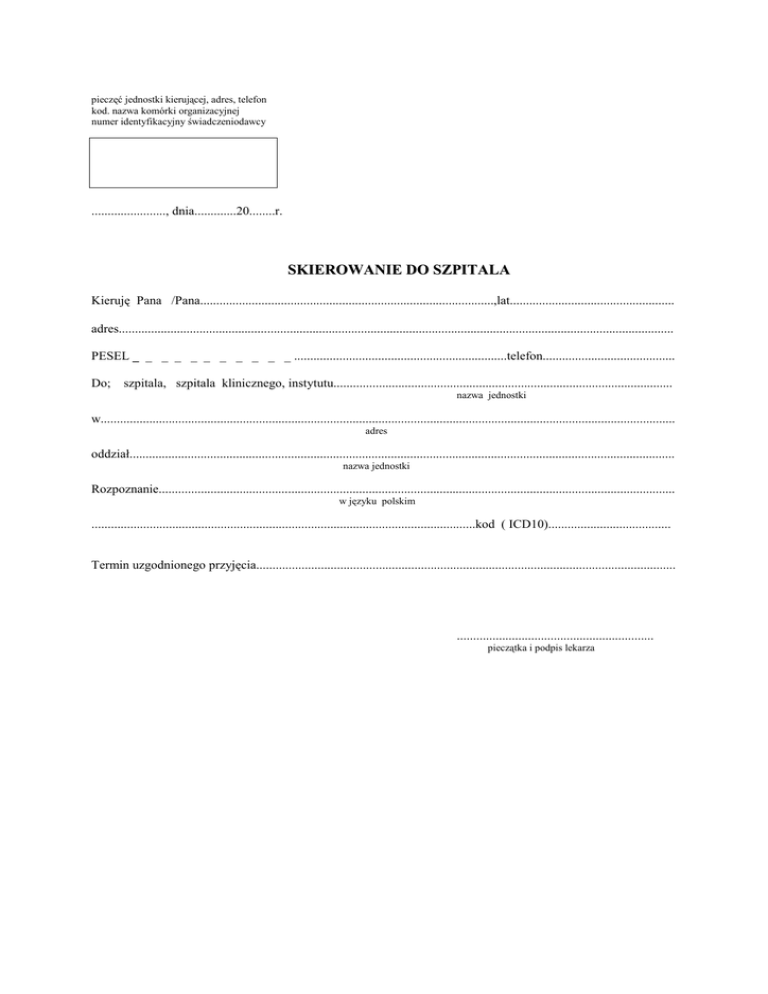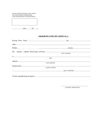 pieczęć jednostki kierującej, adres, telefon kod. nazwa komórki organizacyjnej numer identyfikacyjny świadczeniodawcy ......................., dnia.............20........r. SKIEROWANIE DO SZPITALA Kieruję Pana /Pana...........................................................................................,lat................................................... adres............................................................................................................................................................................ PESEL _ _ _ _ _ _ _ _ _ _ _ ..................................................................telefon......................................... Do; szpitala, szpitala klinicznego, instytutu......................................................................................................... nazwa jednostki w.................................................................................................................................................................................. adres oddział......................................................................................................................................................................... nazwa jednostki Rozpoznanie................................................................................................................................................................ w języku polskim .......................................................................................................................kod ( ICD10)...................................... Termin uzgodnionego przyjęcia.................................................................................................................................. ............................................................. pieczątka i podpis lekarza