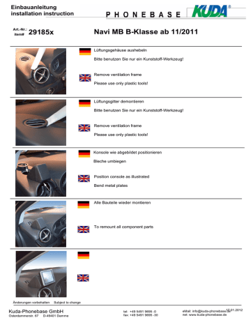 Einbauanleitung installation instruction Art.-Nr.: item# Navi MB B-Klasse ab 11/2011 29185x Lüftungsgehäuse aushebeln Bitte benutzen Sie nur ein Kunststoff-Werkzeug! Remove ventilation frame Please use only plastic tools! Lüftungsgitter demontieren Bitte benutzen Sie nur ein Kunststoff-Werkzeug! Remove ventilation frame Please use only plastic tools! Konsole wie abgebildet positionieren Bleche umbiegen Position console as illustrated Bend metal plates Alle Bauteile wieder montieren To remount all component parts Änderungen vorbehalten Subject to change Kuda-Phonebase GmbH Osterdammerstr. 67 D-49401 Damme tel: +49 5491 9695 -0 fax: +49 5491 9695 -30 17.01.2012 eMail: [email protected] net: www.kuda-phonebase.de Instructions d´ installation instrucciones de instalación Art. 29185x Navi MB B-Klasse ab 11/2011 Tirez la grille de buse d´aération Veuillez n’utiliser qu’un outil de matière plastique Desmonte la carcasa de ventilación Use sólo herramientas de plástico! Démontez grille de buse d´aération Veuillez n’utiliser qu’un outil de matière plastique Desmonte izquierda de ventilación Use sólo herramientas de plástico! Positionnez la console comme illustré Tirez les tôles Posicione la consola como mostrado Tuerza las chapas Remontez les éléments de construction Remonte todos partes de construcción . Nous nous réservons la possibilité de modification instrukcja montazu Kuda-Phonebase GmbH Osterdammerstr. 67 D-49401 Damme Salvo posibles modificaciones tel: +49 5491 9695 -0 fax: +49 5491 9695 -30 17.01.2012 eMail: [email protected] net: www.kuda-phonebase.de instrukcja montazu installatie instructie Art. 29185x Navi MB B-Klasse ab 11/2011 Luchtroosterhuis uitnemen Alleen plastic gereedschap gebruiken alstublieft! Wywazyc ramke wylotów powietrza Prosze uzywac tylko narzedzi z tworzywa sztucznego. Luchtrooster demonteren Alleen plastic gereedschap gebruiken alstublieft! Zdemontowac kratke wylotów powietrza Prosze uzywac tylko narzedzi z tworzywa sztucznego. Konsole zoals afgebeeld positioneren Metalen plaat ombuigen Uchwyt umiescic jak na przedstawionym zdjeciu. Blaszki zagiac Remonte todos partes de construcción Wszystkie elementy ponownie zamontowac Nous nous réservons la possibilité de modification Kuda-Phonebase GmbH Osterdammerstr. 67 D-49401 Damme Salvo posibles modificaciones tel: +49 5491 9695 -0 fax: +49 5491 9695 -30 17.01.2012 eMail: [email protected] net: www.kuda-phonebase.de