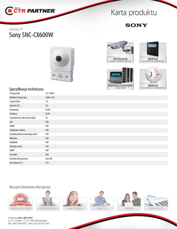 Kamery IP Sony SNC-CX600W INSTALACJA KAMER PRZEMYSŁOWYCH KONTROLA DOSTĘPU I CZASU PRACY Specyfikacja techniczna Przetwornik 1/4" CMOS Wielkość obrazu [px] 1280 x 720 Czułość [lux] 1,0 Apertura [F] 2,0 Kompresja H.264 Zasilanie 5V DC Częstotliwość odświeżania [fps] 30 AGC TAK XDNR TAK Stabilizator obrazu TAK Dwukierunkowa transmisja audio TAK Mikrofon TAK Głoś niki TAK Detekcja ruchu TAK ONVIF TAK Sieć WiFi TAK Gniazdo karty pamięci microSD Kąt widzenia [°] 120 MONTAŻ SYSTEMÓW ALARMOWYCH MONTAŻ SYSTEMÓW P.POŻAROWYCH Naszym klientom oferujemy: GWARANCJA SATYSFAKCJI PROGRAM PARTNERSKI POMOC TECHNICZNA SERWIS CCTV SZKOLENIA GENERATOR OFERT