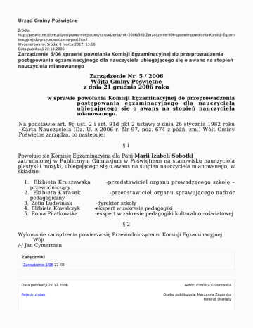 Urząd Gminy Poświętne Źródło: http://poswietne.bip-e.pl/pos/prawo-miejscowe/zarzadzenia/rok-2006/589,Zarzadzenie-506-sprawie-powolania-Komisji-Egzam inacyjnej-do-przeprowadzenia-post.html Wygenerowano: Środa, 8 marca 2017, 13:16 Data publikacji 22.12.2006 Zarządzenie 5/06 sprawie powołania Komisji Egzaminacyjnej do przeprowadzenia postępowania egzaminacyjnego dla nauczyciela ubiegającego się o awans na stopień nauczyciela mianowanego Zarządzenie Nr 5 / 2006 Wójta Gminy Poświętne z dnia 21 grudnia 2006 roku w sprawie powołania Komisji Egzaminacyjnej do przeprowadzenia postępowania egzaminacyjnego dla nauczyciela ubiegającego się o awans na stopień nauczyciela mianowanego. Na podstawie art. 9g ust. 2 i art. 91d pkt 2 ustawy z dnia 26 stycznia 1982 roku –Karta Nauczyciela (Dz. U. z 2006 r. Nr 97, poz. 674 z późń. zm.) Wójt Gminy Poświętne zarządza, co następuje: §1 Powołuje się Komisję Egzaminacyjną dla Pani Marii Izabeli Sobotki zatrudnionej w Publicznym Gimnazjum w Poświętnem na stanowisku nauczyciela plastyki i muzyki, ubiegającego się o awans na stopień nauczyciela mianowanego, w składzie: 1. Elżbieta Kruszewska -przedstawiciel organu prowadzącego szkołę – przewodniczący 2. Elżbieta Karasek -przedstawiciel organu sprawującego nadzór pedagogiczny 3. Zofia Ludwiniak -dyrektor szkoły 4. Elżbieta Kowalczyk -ekspert w zakresie pedagogiki 5. Roma Piłatkowska -ekspert w zakresie pedagogiki kulturalno –oświatowej §2 Wykonanie zarządzenia powierza się Przewodniczącemu Komisji Egzaminacyjnej. Wójt /-/ Jan Cymerman Załączniki Zarządzenie 5/06 22 KB Data publikacji 22.12.2006 Rejestr zmian Autor: Elżbieta Kruszewska Osoba publikująca: Marzanna Zagórska Referat Oświaty Statystyka strony: 1317 wizyt