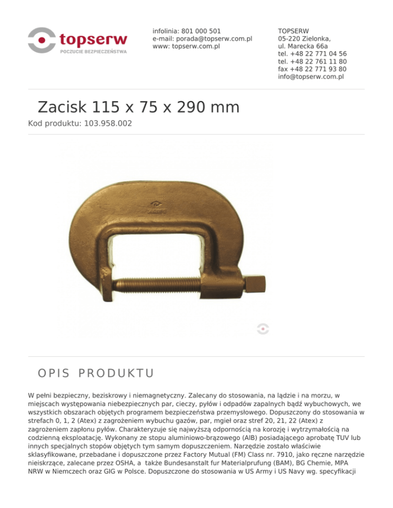 infolinia: 801 000 501 e-mail: [email protected] www: topserw.com.pl TOPSERW 05-220 Zielonka, ul. Marecka 66a tel. +48 22 771 04 56 tel. +48 22 761 11 80 fax +48 22 771 93 80 [email protected] Zacisk 115 x 75 x 290 mm Kod produktu: 103.958.002 OPIS PRODUKTU W pełni bezpieczny, beziskrowy i niemagnetyczny. Zalecany do stosowania, na lądzie i na morzu, w miejscach występowania niebezpiecznych par, cieczy, pyłów i odpadów zapalnych bądź wybuchowych, we wszystkich obszarach objętych programem bezpieczeństwa przemysłowego. Dopuszczony do stosowania w strefach 0, 1, 2 (Atex) z zagrożeniem wybuchu gazów, par, mgieł oraz stref 20, 21, 22 (Atex) z zagrożeniem zapłonu pyłów. Charakteryzuje się najwyższą odpornością na korozję i wytrzymałością na codzienną eksploatację. Wykonany ze stopu aluminiowo-brązowego (AlB) posiadającego aprobatę TUV lub innych specjalnych stopów objętych tym samym dopuszczeniem. Narzędzie zostało właściwie sklasyfikowane, przebadane i dopuszczone przez Factory Mutual (FM) Class nr. 7910, jako ręczne narzędzie nieiskrzące, zalecane przez OSHA, a także Bundesanstalt fur Materialprufung (BAM), BG Chemie, MPA NRW w Niemczech oraz GIG w Polsce. Dopuszczone do stosowania w US Army i US Navy wg. specyfikacji MIL oraz standardów NATO. Wykonanie zgodne z górną granicą normy DIN. Narzędzie posiada trwałe oznaczenie producenta/symbolu produktu pozwalającego na objęcie dożywotnią gwarancją uszkodzeń lub nieprawidłowego działania w normalnych warunkach użytkowania oraz polisą ubezpieczeniową odpowiedzialności za produkt na kwotę 10.000.000 CHF. Twardość stopu wg Brinella 200 HBW, wytrzymałość na rozciąganie 680 Nmm2, granica plastyczności 350 Nmm2. Wymiary: szerokość 100 mm, odstęp 70 mm, długość 265 mm, waga 5000 g. DANE TECHNICZNE Dożywotnia gwarancja Tak Normy OSHA, DIN Testowanie Factory Mutual Research Corporation nr 7910 Dopuszczenie MIL do stosowania w USA Army i USA Navy, NATO POWIĄZANE Produkt Zacisk 19 x 19 x 79 mm Zacisk 115 x 75 x 290 mm Zacisk 165 x 90 x 370 mm