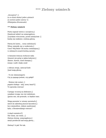 *** Zielony uśmiech „Szczęście? - to co dzień dostać jeden uśmiech i zwrócić jeden wiersz.” (Władysław Broniewski) *** Zielony uśmiech Poeta napisał wiersz o szczęściu, Zmalował miłość na szmaragdowo, czytałam wieczorem, przed zaśnięciem - budzę się rankiem z zieloną głową. Patrzę do lustra... coraz zieleńsza! Włosy zmieniły się w wodorosty, Cera? Mój Boże! Od mchu ciemniejsza, w zielonych oczach kwitną zarosty w kieszeni trencza rechocze żaba (nawet nie pytaj w jakim kolorze), abażur, dywan, szara kanapa, ściany i sufit i biały orzeł z obrazu stryja, zatoczył koło nad moją głową: - To nic śmiesznego! Czy ja papuga jestem, czy gołąb? - Możesz tak zostać, popatrz kolego - mój, nowy imaż!! To sprawka wiersza! Czytając wczoraj na dobranoc, usnęłam (czując się ciut zieleńsza), przez sen, nie przeszło, co będzie rano. Mogę pozostać w wiosny zarostach, niech mi zakwitną jeszcze kaczeńce, lecz niemożliwe, żebym zazdrosna była, o Broniewskiego wiersze? A skąd rumieńce? Nie wiem, nie wiem… Zielono dzisiaj, szmaragdowo, motyl przeleciał nad moją głową… Zielony? A jak! No tak.