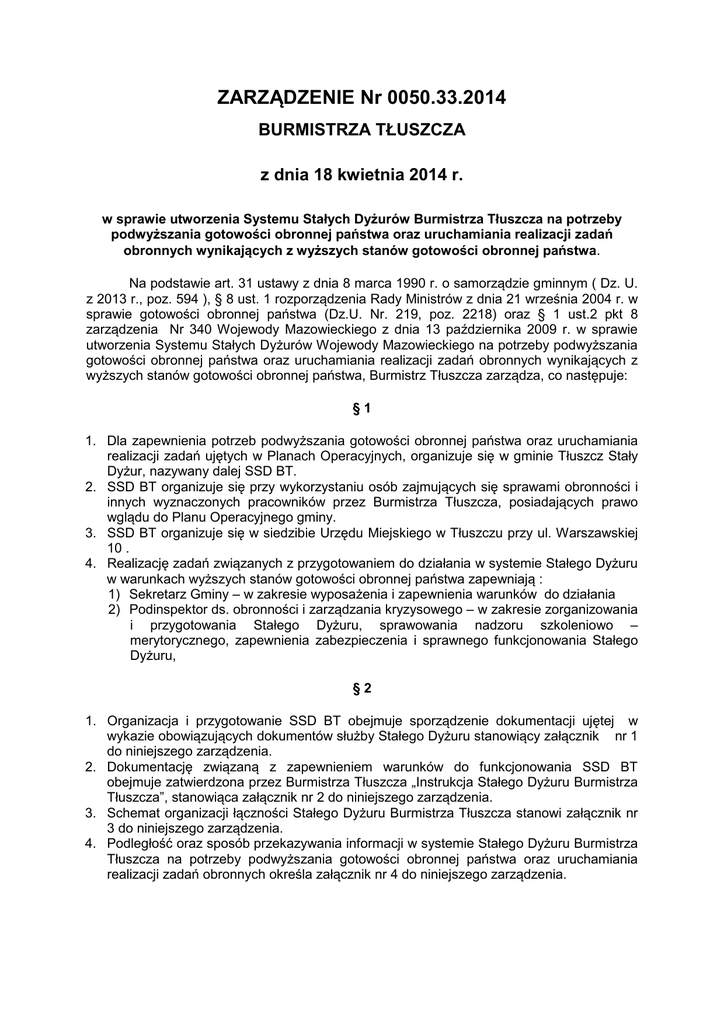 ZARZĄDZENIE Nr 0050.33.2014 BURMISTRZA TŁUSZCZA z dnia 18 kwietnia 2014 r. w sprawie utworzenia Systemu Stałych Dyżurów Burmistrza Tłuszcza na potrzeby podwyższania gotowości obronnej państwa oraz uruchamiania realizacji zadań obronnych wynikających z wyższych stanów gotowości obronnej państwa. Na podstawie art. 31 ustawy z dnia 8 marca 1990 r. o samorządzie gminnym ( Dz. U. z 2013 r., poz. 594 ), § 8 ust. 1 rozporządzenia Rady Ministrów z dnia 21 września 2004 r. w sprawie gotowości obronnej państwa (Dz.U. Nr. 219, poz. 2218) oraz § 1 ust.2 pkt 8 zarządzenia Nr 340 Wojewody Mazowieckiego z dnia 13 października 2009 r. w sprawie utworzenia Systemu Stałych Dyżurów Wojewody Mazowieckiego na potrzeby podwyższania gotowości obronnej państwa oraz uruchamiania realizacji zadań obronnych wynikających z wyższych stanów gotowości obronnej państwa, Burmistrz Tłuszcza zarządza, co następuje: §1 1. Dla zapewnienia potrzeb podwyższania gotowości obronnej państwa oraz uruchamiania realizacji zadań ujętych w Planach Operacyjnych, organizuje się w gminie Tłuszcz Stały Dyżur, nazywany dalej SSD BT. 2. SSD BT organizuje się przy wykorzystaniu osób zajmujących się sprawami obronności i innych wyznaczonych pracowników przez Burmistrza Tłuszcza, posiadających prawo wglądu do Planu Operacyjnego gminy. 3. SSD BT organizuje się w siedzibie Urzędu Miejskiego w Tłuszczu przy ul. Warszawskiej 10 . 4. Realizację zadań związanych z przygotowaniem do działania w systemie Stałego Dyżuru w warunkach wyższych stanów gotowości obronnej państwa zapewniają : 1) Sekretarz Gminy – w zakresie wyposażenia i zapewnienia warunków do działania 2) Podinspektor ds. obronności i zarządzania kryzysowego – w zakresie zorganizowania i przygotowania Stałego Dyżuru, sprawowania nadzoru szkoleniowo – merytorycznego, zapewnienia zabezpieczenia i sprawnego funkcjonowania Stałego Dyżuru, §2 1. Organizacja i przygotowanie SSD BT obejmuje sporządzenie dokumentacji ujętej w wykazie obowiązujących dokumentów służby Stałego Dyżuru stanowiący załącznik nr 1 do niniejszego zarządzenia. 2. Dokumentację związaną z zapewnieniem warunków do funkcjonowania SSD BT obejmuje zatwierdzona przez Burmistrza Tłuszcza „Instrukcja Stałego Dyżuru Burmistrza Tłuszcza”, stanowiąca załącznik nr 2 do niniejszego zarządzenia. 3. Schemat organizacji łączności Stałego Dyżuru Burmistrza Tłuszcza stanowi załącznik nr 3 do niniejszego zarządzenia. 4. Podległość oraz sposób przekazywania informacji w systemie Stałego Dyżuru Burmistrza Tłuszcza na potrzeby podwyższania gotowości obronnej państwa oraz uruchamiania realizacji zadań obronnych określa załącznik nr 4 do niniejszego zarządzenia. §3 1. Do zadań osób pełniących SSD BT w szczególności należy : 1) powiadamianie określonych osób o obowiązku niezwłocznego stawienia się we wskazanym miejscu, 2) przyjmowanie i ewidencjonowanie oraz przekazywanie sygnałów, decyzji, a także informacji kierowanych do właściwych adresatów, 3) wykonywanie zadań ujętych w „ Instrukcji Stałego Dyżuru Burmistrza Tłuszcza”. 2. Funkcjonowanie SSD w systemie zmian : BT zapewnią dwie dwuosobowe grupy, działające 1) I zmiana od godz. 8.00 do godz. 20.30 2) II zmiana od godz. 20.00 do godz. 8.30 3. Obsadę Stałego Dyżuru stanowią osoby wskazane przez Burmistrza Miasta zgodnie z dokumentacją „Instrukcja Stałego Dyżuru Burmistrza Tłuszcza”. §4 1. W stanie stałej gotowości obronnej państwa, Stały Dyżur uruchamia się w pełnym lub ograniczonym zakresie, na zarządzenie Burmistrza Tłuszcza lub organu nadrzędnego w następujących przypadkach: 1) nadzwyczajnych zagrożeń (klęski żywiołowe, awarie, katastrofy zagrażające bezpieczeństwu życia lub mienia ludności); 2) w celach szkoleniowych i kontrolno-sprawdzających. 2. W wyższych stanach gotowości obronnej państwa Stały Dyżur uruchamiany jest obligatoryjne, zgodnie z harmonogramem osiągania wyższych stanów gotowości obronnej gminy Tłuszcz. §5 Stały Dyżur należy utrzymywać w stałej aktualności i gotowości do działania. §6 Stały Dyżur według zasad określonych w zarządzeniu należy przygotować do działania do dnia 10 kwietnia 2014 roku. §7 Zarządzenie wchodzi w życie z dniem podjęcia. BURMISTRZ TŁUSZCZA /-/ mgr inż. Paweł Marcin Bednarczyk