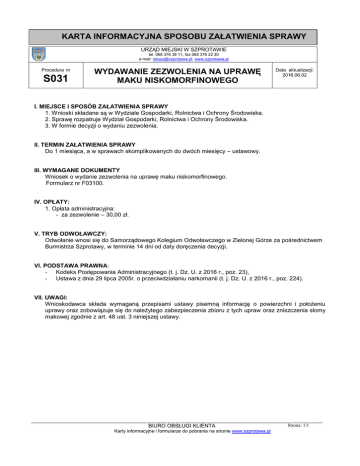 KARTA INFORMACYJNA SPOSOBU ZAŁATWIENIA SPRAWY URZĄD MIEJSKI W SZPROTAWIE tel. 068 376 38 11, fax 068 376 22 20 e-mail: [email protected], www.szprotawa.pl Procedura nr S031 WYDAWANIE ZEZWOLENIA NA UPRAWĘ MAKU NISKOMORFINOWEGO Data aktualizacji: 2016.06.02 I. MIEJSCE I SPOSÓB ZAŁATWIENIA SPRAWY 1. Wnioski składane są w Wydziale Gospodarki, Rolnictwa i Ochrony Środowiska. 2. Sprawę rozpatruje Wydział Gospodarki, Rolnictwa i Ochrony Środowiska. 3. W formie decyzji o wydaniu zezwolenia. II. TERMIN ZAŁATWIENIA SPRAWY Do 1 miesiąca, a w sprawach skomplikowanych do dwóch miesięcy – ustawowy. III. WYMAGANE DOKUMENTY Wniosek o wydanie zezwolenia na uprawę maku niskomorfinowego. Formularz nr F03100. IV. OPŁATY: 1. Opłata administracyjna: - za zezwolenie – 30,00 zł. V. TRYB ODWOŁAWCZY: Odwołanie wnosi się do Samorządowego Kolegium Odwoławczego w Zielonej Górze za pośrednictwem Burmistrza Szprotawy, w terminie 14 dni od daty doręczenia decyzji. VI. PODSTAWA PRAWNA: - Kodeks Postępowania Administracyjnego (t. j. Dz. U. z 2016 r., poz. 23), - Ustawa z dnia 29 lipca 2005r. o przeciwdziałaniu narkomanii (t. j. Dz. U. z 2016 r., poz. 224). VII. UWAGI: Wnioskodawca składa wymaganą przepisami ustawy pisemną informację o powierzchni i położeniu uprawy oraz zobowiązuje się do należytego zabezpieczenia zbioru z tych upraw oraz zniszczenia słomy makowej zgodnie z art. 48 ust. 3 niniejszej ustawy. BIURO OBSŁUGI KLIENTA Karty informacyjne i formularze do pobrania na stronie www.szprotawa.pl Strona: 1/1