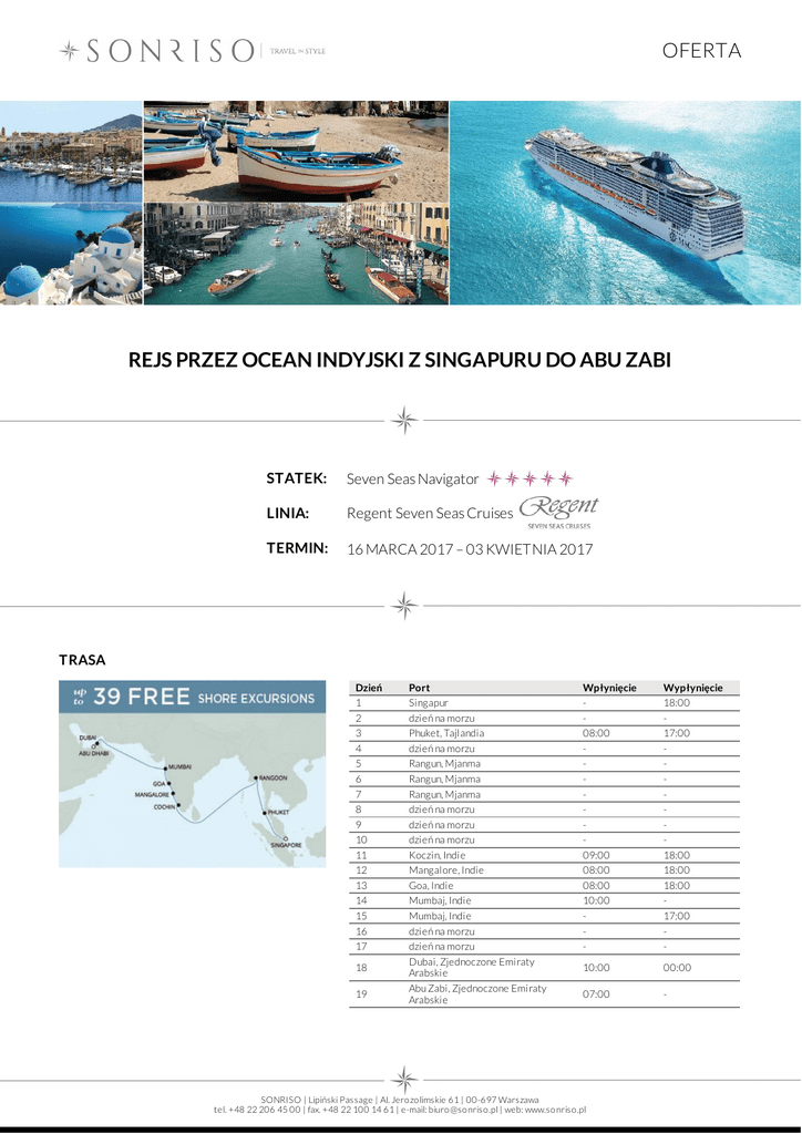OFERTA REJS PRZEZ OCEAN INDYJSKI Z SINGAPURU DO ABU ZABI STATEK: Seven Seas Navigator LINIA: Regent Seven Seas Cruises TERMIN: 16 MARCA 2017 – 03 KWIETNIA 2017 TRASA Dzień 1 2 3 4 5 6 7 8 9 10 11 12 13 14 15 16 17 18 19 Port Singapur dzień na morzu Phuket, Tajlandia dzień na morzu Rangun, Mjanma Rangun, Mjanma Rangun, Mjanma dzień na morzu dzień na morzu dzień na morzu Koczin, Indie Mangalore, Indie Goa, Indie Mumbaj, Indie Mumbaj, Indie dzień na morzu dzień na morzu Dubai, Zjednoczone Emiraty Arabskie Abu Zabi, Zjednoczone Emiraty Arabskie Wpłynięcie 08:00 09:00 08:00 08:00 10:00 - Wypłynięcie 18:00 17:00 18:00 18:00 18:00 17:00 - 10:00 00:00 07:00 - SONRISO | Lipiński Passage | Al. Jero zo limskie 61 | 00-697 Warszawa tel. +48 22 206 45 00 | fax. +48 22 100 14 61 | e-mail: biuro @so nriso .pl | web: www.so nriso .pl OFERTA CENA Typ kabiny Cena z osobę Window Suite od 7 979 EUR Deluxe Suite od 9 699 EUR Concierge Suite od 10 559 EUR CENA ZAWIERA DOTATKOWE OPŁATY zakwaterowanie w 2 - os apartamencie wybranej kategorii pełne wyżywienie: 3 posiłki, przekąski między posiłakmi, bufet o północy korzystanie z restauracji tematycznych open bar: wybrane wina i szampany, alkohole premium, różnorodne kawy i herbaty, woda butelkowana, napoje bezalkoholowe oraz soki dostępne w barach i restauracjach korzystanie z mini baru w apartamencie serwis bagażowy podczas wejścia i zejścia ze statku obsługa kamerdynerska (dostępna w apartamentach od kategorii C) 24 godzinny serwis kabinowy korzystanie z urządzeń sportowo - rekreacyjnych dostępnych na pokładzie (baseny, jacuzzi, boiska sportowe, itp.) udział we wszystkich imprezach organizowanych na pokładzie (przedstawienia, pokazy, aukcje, animacje i inne) opłatę serwisową (napiwki) dla obsługi statku obowiązkowe opłaty portowe wybrane wycieczki fakultatywne dojazd/przelot do portu rozpoczęcia i zakończenia rejsu transfery (lotnisko - port - lotnisko) ewentualne noclegi przed lub po rejsie wycieczki fakultatywne korzystanie z usług typu: SPA, salon piękności, pralnia itp. wydatki osobiste tj. zakupy w butikach, internet, kasyno itp. obowiązkowe ubezpieczenie turystyczne koszt wymaganych wiz ewentualna opłata paliwowa (linia w momencie wzrotu cen ropy zastrzega sobie prawo do dodania oplaty paliwowej do każdej rezerwacji) Na życzenie świadczymy dodatkowo usługi: rezerwacje hotelowe na całym świecie rezerwacje biletów lotniczych, trasferów oraz parkingu w porcie rezerwacje wycieczek fakultatywnych i innych atrakcji SONRISO | Lipiński Passage | Al. Jero zo limskie 61 | 00-697 Warszawa tel. +48 22 206 45 00 | fax. +48 22 100 14 61 | e-mail: biuro @so nriso .pl | web: www.so nriso .pl