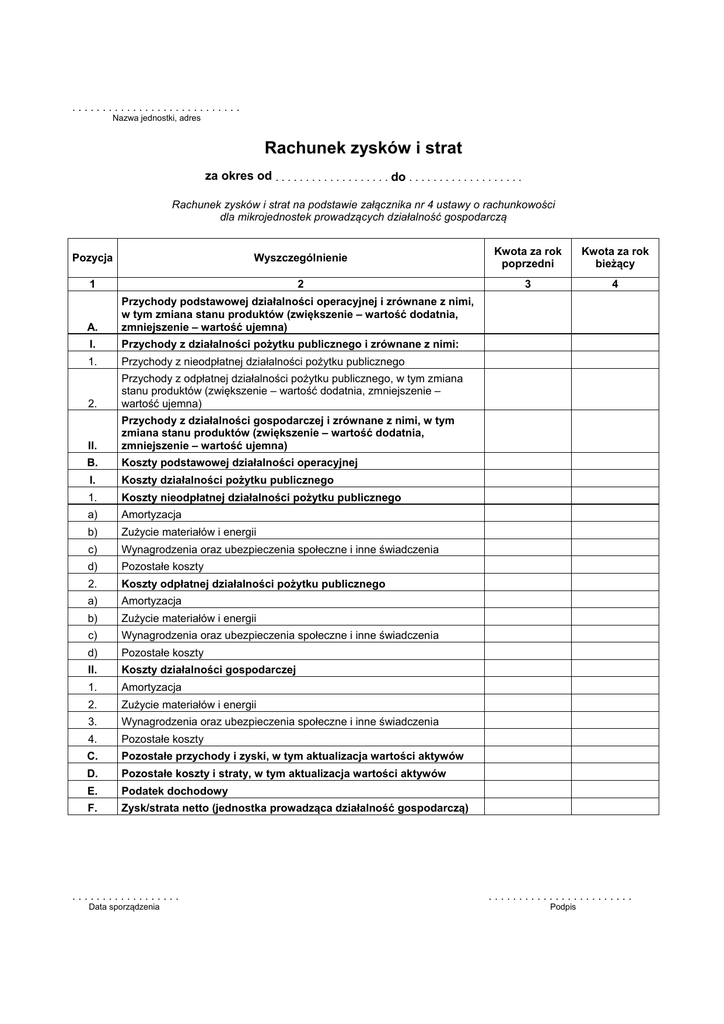 ............................ Nazwa jednostki, adres Rachunek zysków i strat za okres od . . . . . . . . . . . . . . . . . . . do . . . . . . . . . . . . . . . . . . . Rachunek zysków i strat na podstawie załącznika nr 4 ustawy o rachunkowości dla mikrojednostek prowadzących działalność gospodarczą Wyszczególnienie Kwota za rok poprzedni Kwota za rok bieżący 1 2 3 4 A. Przychody podstawowej działalności operacyjnej i zrównane z nimi, w tym zmiana stanu produktów (zwiększenie – wartość dodatnia, zmniejszenie – wartość ujemna) I. Przychody z działalności pożytku publicznego i zrównane z nimi: 1. Przychody z nieodpłatnej działalności pożytku publicznego 2. Przychody z odpłatnej działalności pożytku publicznego, w tym zmiana stanu produktów (zwiększenie – wartość dodatnia, zmniejszenie – wartość ujemna) Pozycja II. Przychody z działalności gospodarczej i zrównane z nimi, w tym zmiana stanu produktów (zwiększenie – wartość dodatnia, zmniejszenie – wartość ujemna) B. Koszty podstawowej działalności operacyjnej I. Koszty działalności pożytku publicznego 1. Koszty nieodpłatnej działalności pożytku publicznego a) Amortyzacja b) Zużycie materiałów i energii c) Wynagrodzenia oraz ubezpieczenia społeczne i inne świadczenia d) Pozostałe koszty 2. Koszty odpłatnej działalności pożytku publicznego a) Amortyzacja b) Zużycie materiałów i energii c) Wynagrodzenia oraz ubezpieczenia społeczne i inne świadczenia d) Pozostałe koszty II. Koszty działalności gospodarczej 1. Amortyzacja 2. Zużycie materiałów i energii 3. Wynagrodzenia oraz ubezpieczenia społeczne i inne świadczenia 4. Pozostałe koszty C. Pozostałe przychody i zyski, w tym aktualizacja wartości aktywów D. Pozostałe koszty i straty, w tym aktualizacja wartości aktywów E. Podatek dochodowy F. Zysk/strata netto (jednostka prowadząca działalność gospodarczą) .................. Data sporządzenia ........................ Podpis