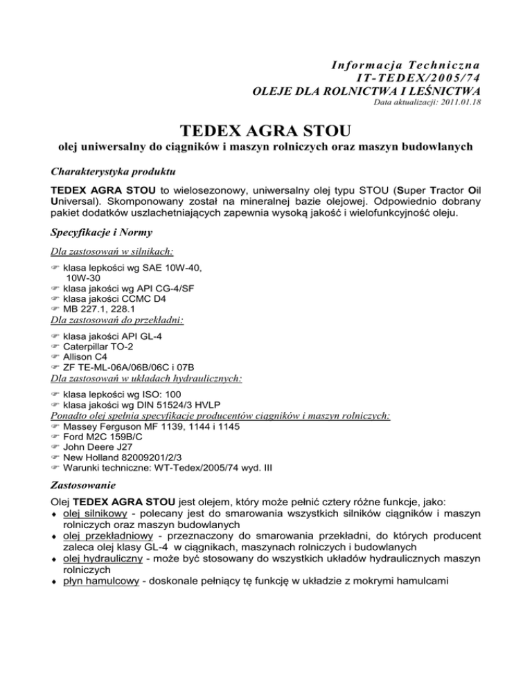 I n f o rm a c j a Te c h n i c z n a I T- TE DE X / 2 0 0 5 /7 4 OLEJE DLA ROLNICTWA I LEŚNICTWA Data aktualizacji: 2011.01.18 TEDEX AGRA STOU olej uniwersalny do ciągników i maszyn rolniczych oraz maszyn budowlanych Charakterystyka produktu TEDEX AGRA STOU to wielosezonowy, uniwersalny olej typu STOU (Super Tractor Oil Universal). Skomponowany został na mineralnej bazie olejowej. Odpowiednio dobrany pakiet dodatków uszlachetniających zapewnia wysoką jakość i wielofunkcyjność oleju. Specyfikacje i Normy Dla zastosowań w silnikach: klasa lepkości wg SAE 10W-40, 10W-30 klasa jakości wg API CG-4/SF klasa jakości CCMC D4 MB 227.1, 228.1 Dla zastosowań do przekładni: klasa jakości API GL-4 Caterpillar TO-2 Allison C4 ZF TE-ML-06A/06B/06C i 07B Dla zastosowań w układach hydraulicznych: klasa lepkości wg ISO: 100 klasa jakości wg DIN 51524/3 HVLP Ponadto olej spełnia specyfikacje producentów ciągników i maszyn rolniczych: Massey Ferguson MF 1139, 1144 i 1145 Ford M2C 159B/C John Deere J27 New Holland 82009201/2/3 Warunki techniczne: WT-Tedex/2005/74 wyd. III Zastosowanie Olej TEDEX AGRA STOU jest olejem, który może pełnić cztery różne funkcje, jako: olej silnikowy - polecany jest do smarowania wszystkich silników ciągników i maszyn rolniczych oraz maszyn budowlanych olej przekładniowy - przeznaczony do smarowania przekładni, do których producent zaleca olej klasy GL-4 w ciągnikach, maszynach rolniczych i budowlanych olej hydrauliczny - może być stosowany do wszystkich układów hydraulicznych maszyn rolniczych płyn hamulcowy - doskonale pełniący tę funkcję w układzie z mokrymi hamulcami Olej TEDEX AGRA STOU może być stosowany w miejsce wielofunkcyjnych olejów produkcji zagranicznej oraz krajowej typu TOU np. Ursina TOU, typu UTTO np. Agrol i Agrol U, STOU np. Ursina STOU i jest z nimi mieszalny. Olej TEDEX AGRA STOU może być stosowany jako olej uniwersalny do ciągników: Massey Ferguson, Ursus i Ursus-MF 235 i 255, Zetor, John Deere, David Brown, Fiat, British Leyland, Ford z ręczną przekładnią, Case z wyjątkiem dyferencjału w seriach 1200, 1470, 2470. W maszynach budowlanych olej TEDEX AGRA STOU może być stosowany do smarowania silników i przekładni, wszędzie tam gdzie producenci zalecają oleje o n/w kategoriach jakości Właściwości użytkowe Olej TEDEX AGRA STOU posiada doskonałe właściwości eksploatacyjne, a zwłaszcza: myjąco- dyspergujące - zapewniające czystość wewnętrznych elementów silnika i par trących przekładni w ciężkich warunkach pracy maszyn rolniczych antyutleniające - zmniejszające powstawanie osadów typu laków i nagarów przeciwzużyciowe - zmniejszające zużycie układu zaworowego silnika oraz prawidłowe smarowanie elementów przekładni pracujących przy dużych obciążeniach i małych prędkościach antykorozyjne i przeciwrdzewne przeciwpienne lepkościowo-temperaturowe - zapewniające niezawodne smarowanie silnika i par trących przekładni, oraz prawidłową pracę w systemach hydraulicznych w szerokim zakresie temperatur specjalne dodatki zapobiegają powstawaniu irytującego pisku w układzie z mokrymi hamulcami oraz redukują hałas i wibracje przy pracy maszyn Właściwości fizyko-chemiczne - wartości typowe TEDEX AGRA STOU 10W-40 10W-30 Lepkość kinematyczna w 100°C, mm2/s 14,1 11,0 Wskaźnik lepkości 135 138 Temperatura zapłonu, °C 220 220 Temperatura płynięcia, °C -30 -35 Popiół siarczanowy, % wag. 1,57 1,57 Liczba zasadowa TBN, mg KOH/g 10,1 10,1 Podane parametry są danymi standardowymi, zastrzegamy sobie prawo zmian wynikających z postępu technicznego. Własności BHP i przeciwpożarowe olej nie zawiera w swoim składzie substancji toksycznych lotność oleju w stosunku do eteru bardzo mała ciecz trudno palna, skłonność do samozapalenia niska klasa niebezpieczeństwa pożarowego - IV Przechowywanie i transport Olej TEDEX AGRA STOU należy przechowywać w opakowaniach zamkniętych, które chronią go przed dostępem wilgoci, wody i zanieczyszczeń mechanicznych. Olej może być przewożony środkami transportu kolejowego i samochodowego, zarówno luzem jak i w beczkach oraz innych opakowaniach jednostkowych - nie stwarza zagrożeń. Informacje o stosowaniu olejów i smarów TEDEX udziela : T E D EX S .A . 9 7 - 2 0 0 Tomaszów Mazowiecki,Cygan2 tel. (0-44) 724 95 62, (0-44) 725 29 15 AUTOMOTIVE OILS OLEJE SAMOCHODOWE АВТОМОБИЛЬНЫЕ МАСЛА INDUSTRIAL OILS OLEJE PRZEMYSŁOWE ИНДУСТРИАЛЬНЫЕ МАСЛА