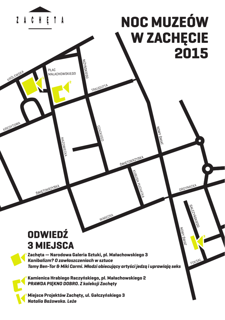 NOC MUZEÓW W ZACHĘCIE 2015 A SK EW ÓL KR 1 2 TTA UGU TRA O IECKA MAZOW KIEG CZAC A OW DYT KRE USIA KUB PUC A KA HAT NACK ORDY A ECK WAR ODWIEDŹ 3 MIEJSCA 1 Zachęta — Narodowa Galeria Sztuki, pl. Małachowskiego 3 Kanibalizm? O zawłaszczeniach w sztuce Tamy Ben-Tor & Miki Carmi. Młodzi obiecujący artyści jedzą i uprawiają seks 2 Kamienica Hrabiego Raczyńskiego, pl. Małachowskiego 2 PRAWDA PIĘKNO DOBRO. Z kolekcji Zachęty 3 Miejsce Projektów Zachęty, ul. Gałczyńskiego 3 Natalia Bażowska. Leże 3 SAL FOK NOC MUZEÓW W ZACHĘCIE Odwiedź 3 miejsca. Zobacz wszystkie wystawy 1 Zachęta — Narodowa Galeria Sztuki, pl. Małachowskiego 3 wystawa Kanibalizm? O zawłaszczeniach w sztuce Wystawa dotyczy zagadnienia zawłaszczeń, zapożyczeń, przetwarzania, remiksowania i samplowania kultury. Ta strategia twórcza jest stosowana przez artystów od czasów awangardy początku XX wieku. W Zachęcie prezentowane są prace od końca lat 70. po współczesne. Wystawa stawia pytania odnoszące się do kwestii oryginalności, kopii i reprodukcji, przywłaszczania prac w świetle prawa autorskiego, czy w końcu do sprawy najistotniejszej, jaką jest problem wolności artystycznej. górne sale wystawowe koncert Warsaw Laptop Orchestra Otwarty koncert ambientalny nawiązujący do klasyki estetycznej gatunku. Muzyka ambient, nieinwazyjna i magnetyczna, stworzy brzmieniową narrację we wnętrzach Zachęty. godz. 18–21 sala wystawowa na I piętrze 2 wystawa Tamy Ben-Tor & Miki Carmi. Młodzi obiecujący artyści jedzą i uprawiają seks Wystawa prezentuje prace wideo Tamy Ben-Tor oraz obrazy Mikiego Carmi, dwojga izraelskich artystów mieszkających w Nowym Jorku. W swoich słynnych wideoperformansach z „gadającymi głowami” Tamy Ben-Tor charakteryzuje się, przebiera, zasłania i odgrywa role. W przewrotny i dowcipny sposób analizuje swoją żydowską tożsamość, współczesne postrzeganie Holokaustu, życie w nowojorskim środowisku artystycznym. Miki Carmi, portretując członków swojej rodziny, prowadzi swoiste badania antropologiczne na temat poszukiwania tzw. typu żydowskiego. W ich pracach sfera prywatna i działania artystyczne są silnie ze sobą splecione, przenikają się wzajemnie. dolne sale wystawowe warsztaty: O-świeć mnie! Lightrecykling Na warsztatach, wykorzystując materiały pochodzące z recyklingu, własnoręcznie wykonamy świecące rzeźby-lampy. Inspirując się wybitnymi dziełami sztuki, stworzymy autorskie konstrukcje, które zmienią wnętrza naszych domów. Nie trzeba mieć doświadczenia w projektowaniu, pomogą animatorzy. Najciekawszy projekt zostanie nagrodzony. współorganizator: Euro-Light godz. 20–22 liczba miejsc ograniczona wiek: 18+ lub pod opieką osoby dorosłej sala warsztatowa plac Małachowskiego rozświetli iluminacja zrealizowana przez Organic Lighting partner galerii partner Nocy Muzeów 3 Kamienica Hrabiego Raczyńskiego, pl. Małachowskiego 2 wystawa PRAWDA PIĘKNO DOBRO. Z kolekcji Zachęty Znana z filozofii triada platońska najwyższych idei i wartości to jednocześnie cytat z jednego z prezentowanych na wystawie dzieł — fotografii Jadwigi Sawickiej, gdzie napis ten wydrapany został na plastikowej butelce. Brzmi nieco ironicznie, jeśli przypomnimy, że tymi pojęciami z upodobaniem posługują się konserwatywni krytycy, chłoszcząc sztukę współczesną za brak idei i zdradę ideałów. Ale czy słusznie? Może jednak artyści z konsekwencją i uporem wciąż pokazują nam (krytykom, widzom) niechcianą często stronę prawdy, choćby kwestionując dobro i piękno we współczesnej wersji pop. Miejsce Projektów Zachęty, ul. Gałczyńskiego 3 wystawa Natalia Bażowska. Leże Artystka znana z wideoperformansu Luna, który ukazuje relację między kobietą a dziką wilczycą, podejmuje także próby poszukiwania obszarów porozumienia międzygatunkowego, usiłuje wniknąć w środowisko naturalne. Jej prace, m.in. instalacja dźwiękowo-przestrzenna oraz tytułowe Leże, rozwijające ideę rzeźb runowych, pozwalają doświadczyć bliskości świata przyrody. Księgarnia Artystyczna czynna w godz. 12-1 wszystkie wystawy czynne do godz. 1