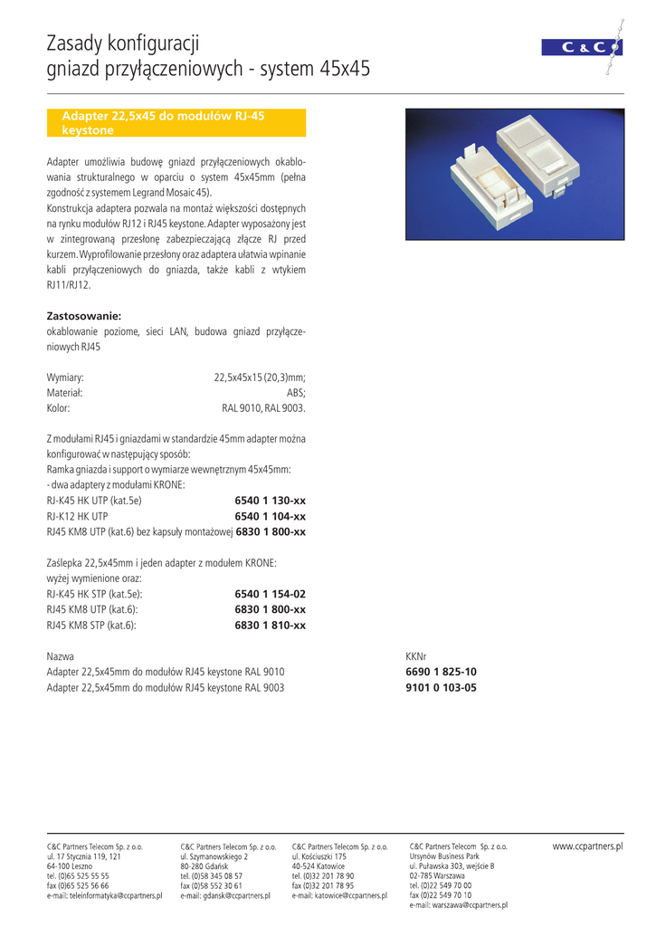 Zasady konfiguracji gniazd przy³¹czeniowych - system 45x45 Adapter 22,5x45 do modu³ów RJ-45 keystone Adapter umo¿liwia budowê gniazd przy³¹czeniowych okablowania strukturalnego w oparciu o system 45x45mm (pe³na zgodnoœæ z systemem Legrand Mosaic 45). Konstrukcja adaptera pozwala na monta¿ wiêkszoœci dostêpnych na rynku modu³ów RJ12 i RJ45 keystone. Adapter wyposa¿ony jest w zintegrowan¹ przes³onê zabezpieczaj¹c¹ z³¹cze RJ przed kurzem. Wyprofilowanie przes³ony oraz adaptera u³atwia wpinanie kabli przy³¹czeniowych do gniazda, tak¿e kabli z wtykiem RJ11/RJ12. Zastosowanie: okablowanie poziome, sieci LAN, budowa gniazd przy³¹czeniowych RJ45 Wymiary: Materia³: Kolor: 22,5x45x15 (20,3)mm; ABS; RAL 9010, RAL 9003. Z modu³ami RJ45 i gniazdami w standardzie 45mm adapter mo¿na konfigurowaæ w nastêpuj¹cy sposób: Ramka gniazda i support o wymiarze wewnêtrznym 45x45mm: - dwa adaptery z modu³ami KRONE: RJ-K45 HK UTP (kat.5e) 6540 1 130-xx RJ-K12 HK UTP 6540 1 104-xx RJ45 KM8 UTP (kat.6) bez kapsu³y monta¿owej 6830 1 800-xx Zaœlepka 22,5x45mm i jeden adapter z modu³em KRONE: wy¿ej wymienione oraz: RJ-K45 HK STP (kat.5e): 6540 1 154-02 RJ45 KM8 UTP (kat.6): 6830 1 800-xx RJ45 KM8 STP (kat.6): 6830 1 810-xx Nazwa Adapter 22,5x45mm do modu³ów RJ45 keystone RAL 9010 Adapter 22,5x45mm do modu³ów RJ45 keystone RAL 9003 KKNr 6690 1 825-10 9101 0 103-05