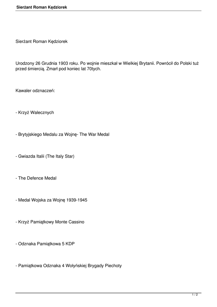 Sierżant Roman Kędziorek Sierżant Roman Kędziorek Urodzony 26 Grudnia 1903 roku. Po wojnie mieszkał w Wielkiej Brytanii. Powrócił do Polski tuż przed śmiercią. Zmarł pod koniec lat 70tych. Kawaler odznaczeń: - Krzyż Walecznych - Brytyjskiego Medalu za Wojnę- The War Medal - Gwiazda Italii (The Italy Star) - The Defence Medal - Medal Wojska za Wojnę 1939-1945 - Krzyż Pamiątkowy Monte Cassino - Odznaka Pamiątkowa 5 KDP - Pamiątkowa Odznaka 4 Wołyńskiej Brygady Piechoty 1/2 Sierżant Roman Kędziorek * zdjęcia i pamiątki z zasobów rodzinnych 2/2