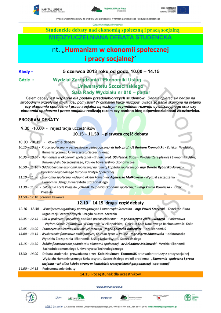 Studenckie debaty nad ekonomią społeczną i pracą socjalną MIĘDZYUCZELNIANA DEBATA STUDENCKA nt. „Humanizm w ekonomii społecznej i pracy socjalnej” Kiedy Gdzie - 5 czerwca 2013 roku od godz. 10.00 – 14.15 Wydział Zarządzania i Ekonomiki Usług Uniwersytetu Szczecińskiego Sala Rady Wydziału nr 010 – parter Celem debaty jest wsparcie dla postaw przedsiębiorczych studentów. Debata opierać się będzie na swobodnym przepływie myśli, idei, pomysłów! W globalnej burzy mózgów uwaga zostanie skupiona na pytaniu czy ekonomia społeczna i praca socjalna są waŜnym czynnikiem rozwoju cywilizacyjnego oraz czy ekonomia społeczna i praca socjalna realizują razem czy osobno ideę odpowiedzialności za człowieka. PROGRAM DEBATY 9.30 –10.00 - rejestracja uczestników 10.15 – 11.50 - pierwsza część debaty 10.00 -10.15 - otwarcie debaty 10.15 – 10.35 - Praca społeczna w perspektywie pedagogicznej- dr hab. prof. US Barbara Kromolicka - Dziekan Wydziału Humanistycznego Uniwersytetu Szczecińskiego 10.35 – 10.50 - Humanizm w ekonomii społecznej - dr hab. prof. US Henryk Babis - Wydział Zarządzania i Ekonomiki Usług Uniwersytetu Szczecińskiego, Polskie Towarzystwo Ekonomiczne 10.50 – 11.10 - Oddziaływanie ekonomii społecznej na rozwój kapitału społecznego- mgr Dorota Rybarska-Jarosz – Dyrektor Regionalnego Ośrodka Polityki Społecznej 11.10 – 11.30 - Ekonomia społeczna widziana okiem kobiet - dr Agnieszka Malkowska - Wydział Zarządzania i Ekonomiki Usług Uniwersytetu Szczecińskiego 11.30 – 11.50 - Założenia i cele Projektu „Ośrodki Wsparcia Ekonomii Społecznej” – mgr Emilia Kowalska - Lider Projektu 11.50 – 12.10 przerwa kawowa 12.10 – 14.15 druga część debaty 12.10 – 12.30 - Współpraca organizacji pozarządowych i samorządu Szczecina – mgr Paweł Szczyrski - Dyrektor Biura Organizacji Pozarządowych Urzędu Miasta Szczecin 12.35 – 12.45 - CSR w praktyce - przykłady polskich przedsiębiorstw – mgr Katarzyna Zioło-Gwadera - Państwowa Wyższa Szkoła Zawodowa w Gorzowie Wielkopolskim, Opiekun Koła Naukowego Rachunkowości KoRa 12.45 – 13.00 - Franczyza społeczna i warunki jej rozwoju - mgr Agnieszka Balcewicz – KN EconomUS 13.00 – 13.15 - Wykluczenie finansowe osób powyżej 65 roku życia w Polsce - mgr Marta Zdanowska – doktorantka Wydziału Zarządzania i Ekonomiki Usług Uniwersytetu Szczecińskiego 13.15 – 13.30 - Źródła finansowania podmiotów ekonomii społecznej - dr Arkadiusz Malkowski - Wydział Ekonomii Zachodniopomorskiego Uniwersytetu Technologicznego 13.30 – 14.00 - Debata studencka prowadzona przez Koło Naukowe EconomUS oraz wolontariuszy z pracy socjalnej Wydziału Humanistycznego Uniwersytetu Szczecińskiego wokół problemu „Ekonomia społeczna i praca socjalna – ich silne i słabe strony w kontekście rzeczywistości gospodarczej i społecznej” 14.00 – 14.15 - Podsumowanie debaty 14.15 Poczęstunek dla uczestników