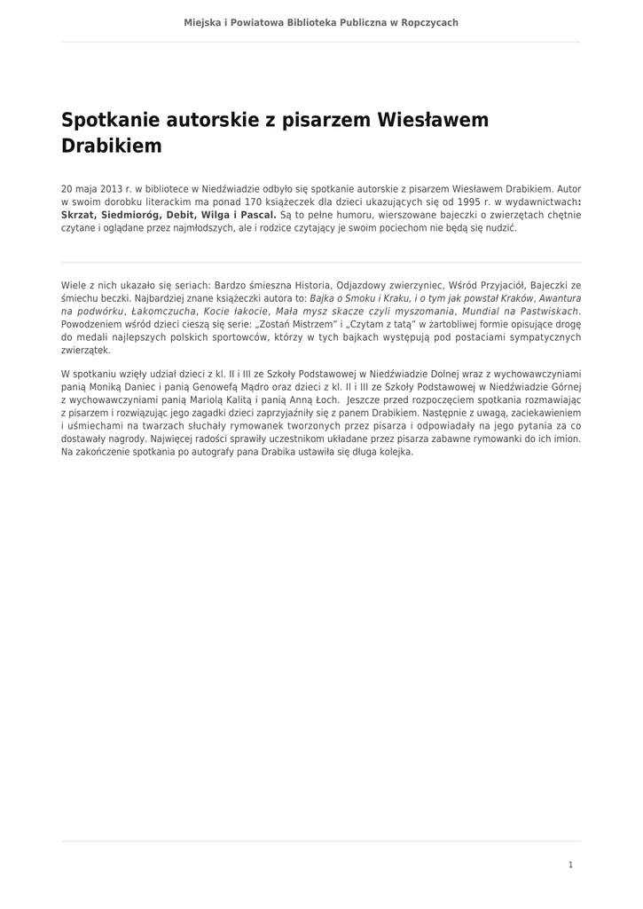 Miejska i Powiatowa Biblioteka Publiczna w Ropczycach Spotkanie autorskie z pisarzem Wiesławem Drabikiem 20 maja 2013 r. w bibliotece w Niedźwiadzie odbyło się spotkanie autorskie z pisarzem Wiesławem Drabikiem. Autor w swoim dorobku literackim ma ponad 170 książeczek dla dzieci ukazujących się od 1995 r. w wydawnictwach: Skrzat, Siedmioróg, Debit, Wilga i Pascal. Są to pełne humoru, wierszowane bajeczki o zwierzętach chętnie czytane i oglądane przez najmłodszych, ale i rodzice czytający je swoim pociechom nie będą się nudzić. Wiele z nich ukazało się seriach: Bardzo śmieszna Historia, Odjazdowy zwierzyniec, Wśród Przyjaciół, Bajeczki ze śmiechu beczki. Najbardziej znane książeczki autora to: Bajka o Smoku i Kraku, i o tym jak powstał Kraków, Awantura na podwórku, Łakomczucha, Kocie łakocie, Mała mysz skacze czyli myszomania, Mundial na Pastwiskach. Powodzeniem wśród dzieci cieszą się serie: „Zostań Mistrzem” i „Czytam z tatą” w żartobliwej formie opisujące drogę do medali najlepszych polskich sportowców, którzy w tych bajkach występują pod postaciami sympatycznych zwierzątek. W spotkaniu wzięły udział dzieci z kl. II i III ze Szkoły Podstawowej w Niedźwiadzie Dolnej wraz z wychowawczyniami panią Moniką Daniec i panią Genowefą Mądro oraz dzieci z kl. II i III ze Szkoły Podstawowej w Niedźwiadzie Górnej z wychowawczyniami panią Mariolą Kalitą i panią Anną Łoch. Jeszcze przed rozpoczęciem spotkania rozmawiając z pisarzem i rozwiązując jego zagadki dzieci zaprzyjaźniły się z panem Drabikiem. Następnie z uwagą, zaciekawieniem i uśmiechami na twarzach słuchały rymowanek tworzonych przez pisarza i odpowiadały na jego pytania za co dostawały nagrody. Najwięcej radości sprawiły uczestnikom układane przez pisarza zabawne rymowanki do ich imion. Na zakończenie spotkania po autografy pana Drabika ustawiła się długa kolejka. 1