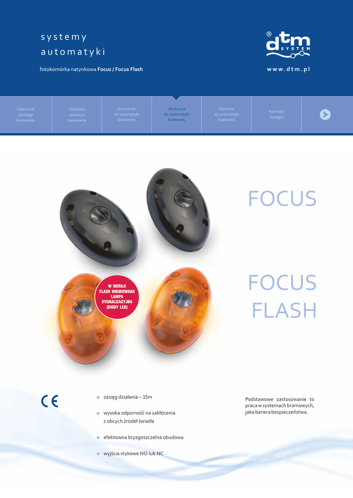 systemy automatyki www.dtm.pl fotokomórka natynkowa Focus / Focus Flash Odbiorniki zdalnego sterowania Nadajniki zdalnego sterowania Sterowniki do automatyki bramowej Akcesoria do automatyki bramowej Siłowniki do automatyki bramowej Kontrola dostępu FOCUS W WERSJI FLASH WBUDOWANA LAMPA SYGNALIZACYJNA (DIODY LED) zasięg działania – 15m wysoka odporność na zakłócenia z obcych źródeł światła efektowna bryzgoszczelna obudowa wyjścia stykowe NO lub NC FOCUS FLASH Podstawowe zastosowanie to praca w systemach bramowych, jako bariera bezpieczeństwa. FOCUS FOCUS FLASH fotokomórka natynkowa Parametry podstawowe zasięg działania: zasilanie nadajnika i odbiornika: zasilanie lampy sygnalizacyjnej (wersja Flash): pobór prądu odbiornika: pobór prądu nadajnika: pobór prądu lampy sygnalizacyjnej (wersja Flash): temperatura pracy (min./max.): gabaryty zewnętrzne obudowy (szer. x głęb. x wys.): stopień ochrony: materiał obudowy: 15m 24V AC lub DC 24V AC lub DC 25mA 25mA 2 x 40mA -20°C / +55°C 62x28x100mm IP-54 obudowa z ABS z poliwęglanowym kloszem Elementy wykonawcze wyjścia stykowe (typ / maksymalne obciążenie): NO lub NC/ 1A 24V AC lub DC Funkcjonalność interfejs użytkownika: sprzętowy interfejs na dwóch diodach LED Odbiorniki zdalnego sterowania Nadajniki zdalnego sterowania Sterowniki do automatyki bramowej Akcesoria do automatyki bramowej systemy automatyki DTM System, ul. Brzeska 7, 85-145 Bydgoszcz, tel./fax +48 52 340 15 83, e-mail: [email protected] www.dtm.pl Siłowniki do automatyki bramowej Kontrola dostępu