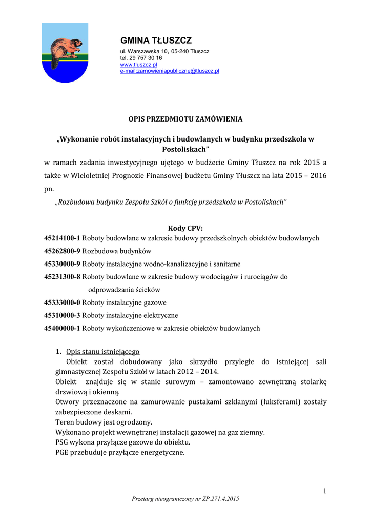 GMINA TŁUSZCZ ul. Warszawska 10, 05-240 Tłuszcz tel. 29 757 30 16 www.tluszcz.pl e-mail:[email protected] OPIS PRZEDMIOTU ZAMÓWIENIA „Wykonanie robót instalacyjnych i budowlanych w budynku przedszkola w Postoliskach” w ramach zadania inwestycyjnego ujętego w budżecie Gminy Tłuszcz na rok 2015 a także w Wieloletniej Prognozie Finansowej budżetu Gminy Tłuszcz na lata 2015 – 2016 pn. „Rozbudowa budynku Zespołu Szkół o funkcję przedszkola w Postoliskach” Kody CPV: 45214100-1 Roboty budowlane w zakresie budowy przedszkolnych obiektów budowlanych 45262800-9 Rozbudowa budynków 45330000-9 Roboty instalacyjne wodno-kanalizacyjne i sanitarne 45231300-8 Roboty budowlane w zakresie budowy wodociągów i rurociągów do odprowadzania ścieków 45333000-0 Roboty instalacyjne gazowe 45310000-3 Roboty instalacyjne elektryczne 45400000-1 Roboty wykończeniowe w zakresie obiektów budowlanych 1. Opis stanu istniejącego Obiekt został dobudowany jako skrzydło przyległe do istniejącej sali gimnastycznej Zespołu Szkół w latach 2012 – 2014. Obiekt znajduje się w stanie surowym – zamontowano zewnętrzną stolarkę drzwiową i okienną. Otwory przeznaczone na zamurowanie pustakami szklanymi (luksferami) zostały zabezpieczone deskami. Teren budowy jest ogrodzony. Wykonano projekt wewnętrznej instalacji gazowej na gaz ziemny. PSG wykona przyłącze gazowe do obiektu. PGE przebuduje przyłącze energetyczne. 1 Przetarg nieograniczony nr ZP.271.4.2015 2. Ogólny opis robót przewidzianych do wykonania: 1) wykonanie instalacji sanitarnych, 2) wykonanie wewnętrznej instalacji gazowej na gaz ziemny, 3) wykonanie instalacji elektrycznych 4) wykonanie robót budowlanych wewnętrznych, 3. Zakres robót: 3.1 Instalacje sanitarne (bez wewn. inst. gazowej): 3.1.1 Wewnętrzna instalacja wod-kan, 3.1.2 Kotłownia gazowa (z podgrzewaczem c.w.), 3.1.3 Instalacja wentylacji, 3.1.4 Przyłącze wodociągowe, 3.1.5 Kanalizacja zewnętrzna dla budynku przedszkola, UWAGA: Projekt instalacji sanitarnych z roku 2009 przewidywał budowę wewnętrznej instalacji gazowej na gaz LPG ale Zamawiający zrezygnował z tego rozwiązania! Wewnętrzna instalacja gazowa zasilana będzie gazem ziemnym i zostanie wykonana wg projektu budowlanego zatwierdzonego decyzją o pozwoleniu na budowę Nr 57p/2015 z dn. 26.01.2015r. 3.2 Wewnętrzna instalacja gazowa na gaz ziemny: 3.2.1 Rurociągi z uzbrojeniem w instalacji wewnętrznej, 3.2.2 Zabezpieczenia antykorozyjne rur, 3.2.3 Montaż kształtek, kurków, szafki gazowej i towarzyszące roboty budowlane, 3.3 Instalacje elektryczne: 3.3.1 Przebudowa zasilania, 3.3.2 WLZ zewnętrzny 3.3.3 Rozdzielnie, 3.3.4 WLZ wewnętrzny, 3.3.5 Montaż osprzętu 3.3.6 Układanie przewodów, 3.3.7 Montaż osprzętu, 3.3.8 Montaż opraw, 3.3.9 Instalacja odgromowa, uziemniająca i połączeń wyrównawczych 3.3.10 Instalacja centrali oddymiania, 3.3.11 Instalacja zasilania wentylacji, 3.3.12 Badania i pomiary powykonawcze, 3.3.13 Instalacje teletechniczne (sieć LAN/telefoniczna, instalacja TV, instalacja domofon./kontroli dostępu, instalacja monitoringu, instalacja SSWiN) 2 Przetarg nieograniczony nr ZP.271.4.2015 3.4 Roboty budowlane wewnętrzne: 3.4.1 Montaż luksferów EI 60, w tym w istniejącej sali gimnastycznej, 3.4.2 Roboty przygotowawcze i uzupełniające ( zakres wg. przedmiaru robót), 3.4.3 Posadzki cementowe z izolacją, 3.4.4 Tynki i podokienniki wewnętrzne, 3.4.5 Wykończenie pomieszczenia kotłowni (zakres wg przedmiaru robót) 4. Szczegółowy zakres robót określają łącznie: 1) niniejszy opis przedmiotu zamówienia, 2) przedmiary robót, 3) dokumentacja projektowa tj. dokumentacja z roku 2009 wraz ze zmianami z roku 2015, 4) specyfikacje techniczne wykonania i odbioru robót. 3 Przetarg nieograniczony nr ZP.271.4.2015