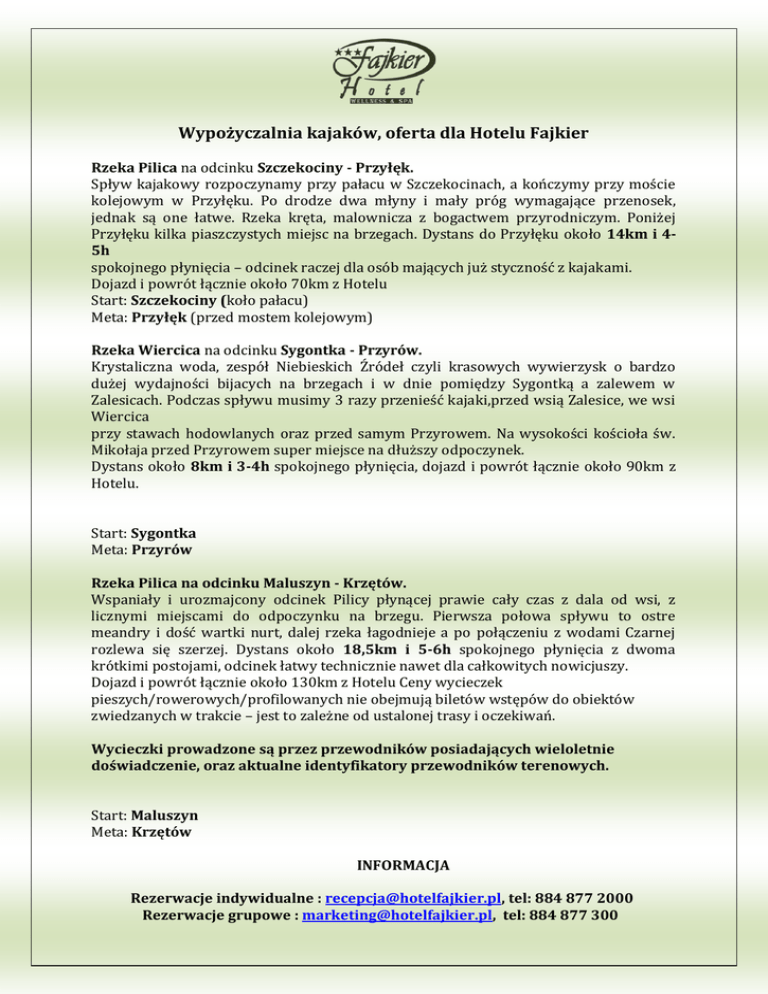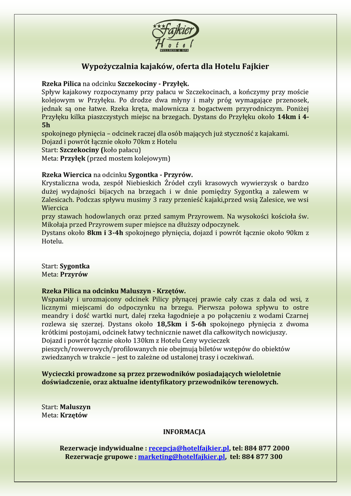 Wypożyczalnia kajaków, oferta dla Hotelu Fajkier Rzeka Pilica na odcinku Szczekociny - Przyłęk. Spływ kajakowy rozpoczynamy przy pałacu w Szczekocinach, a kończymy przy moście kolejowym w Przyłęku. Po drodze dwa młyny i mały próg wymagające przenosek, jednak są one łatwe. Rzeka kręta, malownicza z bogactwem przyrodniczym. Poniżej Przyłęku kilka piaszczystych miejsc na brzegach. Dystans do Przyłęku około 14km i 45h spokojnego płynięcia – odcinek raczej dla osób mających już styczność z kajakami. Dojazd i powrót łącznie około 70km z Hotelu Start: Szczekociny (koło pałacu) Meta: Przyłęk (przed mostem kolejowym) Rzeka Wiercica na odcinku Sygontka - Przyrów. Krystaliczna woda, zespół Niebieskich Źródeł czyli krasowych wywierzysk o bardzo dużej wydajności bijacych na brzegach i w dnie pomiędzy Sygontką a zalewem w Zalesicach. Podczas spływu musimy 3 razy przenieść kajaki,przed wsią Zalesice, we wsi Wiercica przy stawach hodowlanych oraz przed samym Przyrowem. Na wysokości kościoła św. Mikołaja przed Przyrowem super miejsce na dłuższy odpoczynek. Dystans około 8km i 3-4h spokojnego płynięcia, dojazd i powrót łącznie około 90km z Hotelu. Start: Sygontka Meta: Przyrów Rzeka Pilica na odcinku Maluszyn - Krzętów. Wspaniały i urozmajcony odcinek Pilicy płynącej prawie cały czas z dala od wsi, z licznymi miejscami do odpoczynku na brzegu. Pierwsza połowa spływu to ostre meandry i dość wartki nurt, dalej rzeka łagodnieje a po połączeniu z wodami Czarnej rozlewa się szerzej. Dystans około 18,5km i 5-6h spokojnego płynięcia z dwoma krótkimi postojami, odcinek łatwy technicznie nawet dla całkowitych nowicjuszy. Dojazd i powrót łącznie około 130km z Hotelu Ceny wycieczek pieszych/rowerowych/profilowanych nie obejmują biletów wstępów do obiektów zwiedzanych w trakcie – jest to zależne od ustalonej trasy i oczekiwań. Wycieczki prowadzone są przez przewodników posiadających wieloletnie doświadczenie, oraz aktualne identyfikatory przewodników terenowych. Start: Maluszyn Meta: Krzętów INFORMACJA Rezerwacje indywidualne : [email protected], tel: 884 877 2000 Rezerwacje grupowe : [email protected], tel: 884 877 300 Cena zawiera: - wypożyczenie kompletu sprzętu i jego transport, - transporty powrotny kierowców na miejsce rozpoczęcia spływu, - pilotaż uczestników z Hotelu na miejsce rozpoczęcia spływu, - w przypadku wypożyczenia 1-2 kajaków również transport uczestników, Komplet wypożyczanego sprzętu: - dwuosobowy nowoczesny, wygodny i bezpieczny kajak polietylenowy ProTour470, - dwa wiosła Egalis Swift Alu, - dwie kamizelki asekuracyjne Aquarius, - worek wodoszczelny 30l, - schematyczna mapka trasy spływu. Usługa wypożyczenia nie obejmuje opieki instruktora i ratownika. Istnieje możliwość spływu na: - Pilica od Krzętowa aż po Zalew Sulejowski - Warta od Mirowa do Mstowa 11km - Warta Załęczański Łuk Warty od Lisowic k/Działoszyna do Kamiona 28km - Liswarta od Zawad do Wąsosza Górnego na Warcie - Nida (Biała od Bizorędy, Czarna od wsi Nida i od połączenia aż po Wiślicę) - inne okoliczne rzeki i spływy wielodniowe. Maksymalna liczba uczestników podczas jednorazowego spływu to 12 osób (6 kajaków). W kajaku poza dwójką dorosłych na łatwych odcinkach może również płynąć małe dziecko 5-7lat. Podstawowe informacje praktyczne: 1. Uczestnicy mają obowiązek zapoznania się i stosowania do regulaminu usługi dostępnego na stronie http://jurapolska.com/jurapolska_regulamin_wyp_kajakow.pdf i przed udostępnieniem sprzętu. 2. Osoby niepełnoletnie mogą płynąć tylko i wyłącznie w kajaku z osobą dorosłą. 3. Obowiązuje kategoryczny zakaz spływania po sztucznych progach wodnych. 4. Pływamy w kamizelkach asekuracyjnych 5. Nie pływamy pod wpływem alkoholu i innych środków odurzających. 6. Na spływ należy zabrać: komplet ubrań na zmianę, czapkę/kapelusz, kurtkę przeciwdeszczową, ręcznik, sandały lub inne buty do wody, picie oraz jedzenie. INFORMACJA Rezerwacje indywidualne : [email protected], tel: 884 877 2000 Rezerwacje grupowe : [email protected], tel: 884 877 300