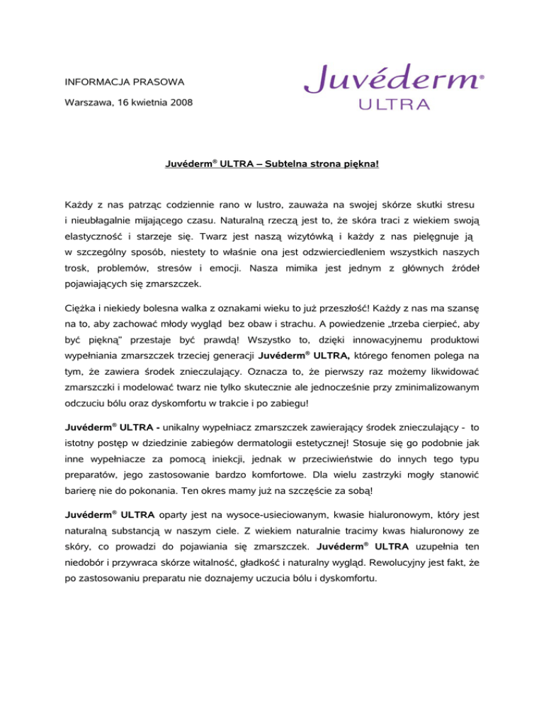 INFORMACJA PRASOWA Warszawa, 16 kwietnia 2008 Juvéderm® ULTRA – Subtelna strona piękna! Każdy z nas patrząc codziennie rano w lustro, zauważa na swojej skórze skutki stresu i nieubłagalnie mijającego czasu. Naturalną rzeczą jest to, że skóra traci z wiekiem swoją elastyczność i starzeje się. Twarz jest naszą wizytówką i każdy z nas pielęgnuje ją w szczególny sposób, niestety to właśnie ona jest odzwierciedleniem wszystkich naszych trosk, problemów, stresów i emocji. Nasza mimika jest jednym z głównych źródeł pojawiających się zmarszczek. Ciężka i niekiedy bolesna walka z oznakami wieku to już przeszłość! Każdy z nas ma szansę na to, aby zachować młody wygląd bez obaw i strachu. A powiedzenie „trzeba cierpieć, aby być piękną” przestaje być prawdą! Wszystko to, dzięki innowacyjnemu produktowi wypełniania zmarszczek trzeciej generacji Juvéderm® ULTRA, którego fenomen polega na tym, że zawiera środek znieczulający. Oznacza to, że pierwszy raz możemy likwidować zmarszczki i modelować twarz nie tylko skutecznie ale jednocześnie przy zminimalizowanym odczuciu bólu oraz dyskomfortu w trakcie i po zabiegu! Juvéderm® ULTRA - unikalny wypełniacz zmarszczek zawierający środek znieczulający - to istotny postęp w dziedzinie zabiegów dermatologii estetycznej! Stosuje się go podobnie jak inne wypełniacze za pomocą iniekcji, jednak w przeciwieństwie do innych tego typu preparatów, jego zastosowanie bardzo komfortowe. Dla wielu zastrzyki mogły stanowić barierę nie do pokonania. Ten okres mamy już na szczęście za sobą! Juvéderm® ULTRA oparty jest na wysoce-usieciowanym, kwasie hialuronowym, który jest naturalną substancją w naszym ciele. Z wiekiem naturalnie tracimy kwas hialuronowy ze skóry, co prowadzi do pojawiania się zmarszczek. Juvéderm® ULTRA uzupełnia ten niedobór i przywraca skórze witalność, gładkość i naturalny wygląd. Rewolucyjny jest fakt, że po zastosowaniu preparatu nie doznajemy uczucia bólu i dyskomfortu. Juvéderm® ULTRA może być stosowany do wypełniania takich obszarów twarzy jak: fałdy nosowo-wargowe, wargowo-podbródkowe, kontur warg a także doliny łzowe czy policzki. Sam zabieg jest prosty i minimalnie bolesny, nie wymaga specjalnych przygotowań a iniekcja trwa krótką chwilę. Z powodzeniem można umówić się na zabieg podczas krótkiej przerwy w codziennych obowiązkach, dlatego też zwany jest zabiegiem „lunchowym”. Dzięki specjalnej formule usieciowania, efekty zastosowania preparatu są widoczne tuż po zabiegu i utrzymują się do 12 m-cy: Przed Po Dystrybutorem preparatu Juvéderm® ULTRA jest firma Ewopharma, producentem firma Allergan. Serdecznie zapraszamy po dodatkowe informacje do