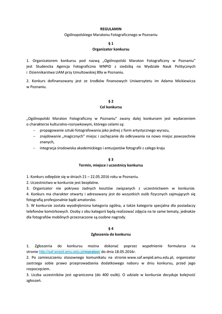 REGULAMIN Ogólnopolskiego Maratonu Fotograficznego w Poznaniu §1 Organizator konkursu 1. Organizatorem konkursu pod nazwą „Ogólnopolski Maraton Fotograficzny w Poznaniu” jest Studencka Agencja Fotograficzna WNPiD z siedzibą na Wydziale Nauk Politycznych i Dziennikarstwa UAM przy Umultowskiej 89a w Poznaniu. 2. Konkurs dofinansowany jest ze środków finansowych Uniwersytetu im Adama Mickiewicza w Poznaniu. §2 Cel konkursu „Ogólnopolski Maraton Fotograficzny w Poznaniu” zwany dalej konkursem jest wydarzeniem o charakterze kulturalno-rozrywkowym, którego celami są: propagowanie sztuki fotografowania jako jednej z form artystycznego wyrazu, znajdowanie „magicznych” miejsc i zachęcanie do odkrywania na nowo miejsc powszechnie znanych, integracja środowiska akademickiego i entuzjastów fotografii z całego kraju §3 Termin, miejsce i uczestnicy konkursu 1. Konkurs odbędzie się w dniach 21 – 22.05.2016 roku w Poznaniu. 2. Uczestnictwo w konkursie jest bezpłatne. 3. Organizator nie pokrywa żadnych kosztów związanych z uczestnictwem w konkursie. 4. Konkurs ma charakter otwarty i adresowany jest do wszystkich osób fizycznych zajmujących się fotografią profesjonalnie bądź amatorsko. 5. W konkursie została wyodrębniona kategoria ogólna, a także kategoria specjalna dla posiadaczy telefonów komórkowych. Osoby z obu kategorii będą realizować zdjęcia na te same tematy, jednakże dla fotografów mobilnych przeznaczone są osobne nagrody. §4 Zgłoszenia do konkursu 1. Zgłoszenia do konkursu można dokonać poprzez wypełnienie formularza na stronie http://saf.wnpid.amu.edu.pl/maraton/ do dnia 18.05.2016r. 2. Po zamieszczeniu stosownego komunikatu na stronie www.saf.wnpid.amu.edu.pl, organizator zastrzega sobie prawo przeprowadzenia dodatkowego naboru w dniu konkursu, przed jego rozpoczęciem. 3. Liczba uczestników jest ograniczona (do 400 osób). O udziale w konkursie decyduje kolejność zgłoszeń. 4. Osoby, które zakwalifikują się do udziału w konkursie zostaną o tym fakcie powiadomione drogą elektroniczną na adres wskazany w zgłoszeniu, nie później niż do dnia 20.05.2016 r. 5. Nadesłanie zgłoszenia do udziału w konkursie jest jednoznaczne z akceptacją niniejszego regulaminu. §5 Zasady konkursu 1. Konkurs trwa 24 godziny. W tym czasie zawodnicy wykonują zdjęcia na zadane tematy. 2. W ciągu wyznaczonego czasu zadaniem zawodnika jest wykonanie zdjęć, ich selekcja i dostarczenie jednego zdjęcia w zadanym temacie w wersji elektronicznej do pracowni komputerowej mieszczącej się na Wydziale Nauk Politycznych i Dziennikarstwa UAM. 3. Zdjęcia wykonywane będą w 4 różnych, wskazanych przez organizatora tematach. 4. Niedopuszczalny jest fotomontaż, dodawanie i usuwanie elementów ze zdjęcia, łączenie zdjęć i inna zaawansowana obróbka. Dopuszcza się jedynie podstawową korektę zdjęcia (nasycenie, balans bieli, kadrowanie). §6 Szczegółowy przebieg konkursu 1. Uczestnicy konkursu zgłaszają się w dniu 21.05.2014 r. (sobota) w godzinach 8:30 – 10:00 w punkcie rejestracji zawodników znajdującym się na Wydziale Nauk Politycznych i Dziennikarstwa UAM przy Umultowskiej 89a, celem potwierdzenia uczestnictwa i uzyskania numerów startowych. 2. Uroczyste rozpoczęcie konkursu i przydzielenie pierwszego tematu odbędzie się o godzinie 10.00. 3. Kolejne tematy przydzielane będą według scenariusza: a) sobota, godz. 13.00 – temat nr 2, b) sobota, godz. 17.00 – temat nr 3, c) sobota, godz. 21.00 – temat nr 4, 4. Przekazanie do oceny zdjęcia z tematu nr 4 odbywa się do godz. 10.00 w niedzielę 22.05.2016 r. 5. Uroczysty finał konkursu odbędzie się w dniu 22.05.2016 r. w godzinach popołudniowych, podanych przez organizatorów w trakcie trwania konkursu. §7 Jury konkursu, kryteria oceny i nagrody 1. Jury konkursu złożone jest z przedstawicieli organizatorów, mediów i zaproszonych gości. 2. Jury wyłoni zwycięzców w poszczególnych kategoriach tematycznych. 3. Jury przysługuje prawo przyznania dodatkowych wyróżnień. 4. Werdykt jury jest ostateczny i nie podlega odwołaniu. 5. Nadzór nad obradami jury sprawuje Przewodniczący Jury, który ma decydujący głos w sytuacjach spornych. 6. Kryteria oceny: a) walory artystyczne zdjęcia, b) nawiązanie do tematu, c) pomysłowość i kreatywność. 7. Zwycięzcom poszczególnych kategorii przyznane zostaną nagrody rzeczowe ufundowane przez partnerów i sponsorów konkursu. §8 Ochrona danych osobowych 1. Przystąpienie do konkursu oznacza wyrażenie zgody na przetwarzanie danych osobowych przez Organizatora w celu przeprowadzenia i rozstrzygnięcia Konkursu oraz identyfikacji Uczestników i Laureatów konkursu, wydania nagród oraz publicznego podania imion i nazwisk wszystkich Uczestników, zgodnie z ustawą o ochronie danych osobowych. 2. Uczestnik konkursu ma prawo wglądu i poprawiania danych osobowych. §9 Prawa autorskie 1. Uczestnik konkursu poprzez zgłoszenie pracy konkursowej, oświadcza, że przysługują mu do niej autorskie prawa osobiste i nieograniczone prawa majątkowe, jest uprawniony do rozpowszechniania wizerunku osób sportretowanych na fotografii, a także przejmuje na siebie odpowiedzialność wobec Organizatora za wady prawne zgłoszonych fotografii, w tym brak praw wymienionych powyżej. 2. Uczestnik konkursu upoważnia nieodpłatnie Organizatora do korzystania ( w sposób nieograniczony czasowo i terytorialnie) w dowolnym celu związanym z promowaniem konkursu Maraton Fotograficzny, Organizacji, lub któregoś ze Sponsorów lub Patronów, a w szczególności działaniach promocyjnych na następujących polach: – utrwalenie i zwielokrotnienie poligraficzne lub podobną techniką, a także utrwalenie w części lub w całości i zwielokrotnienie plastyczne, fotograficzne, w formie zapisu cyfrowego, niezależnie od standardu, systemu lub formatu, – wprowadzenie do pamięci komputera i przechowywanie, wprowadzenie do obrotu, rozpowszechni