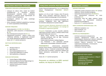 PORĘCZENIA KREDYTÓW I POŻYCZEK PORĘCZENIA WADIÓW PRZETARGOWYCH PORĘCZENIA UDZIELANE SĄ PRZEDSIĘBIORCOM: Fundusz Poręczeń Kredytowych Sp. z o.o. w Jeleniej Górze oferuje Przedsiębiorcom PORĘCZENIE ZAPŁATY WADIUM. należącym do sektora mikro, małych lub średnich przedsiębiorców w rozumieniu aktualnie obowiązujących przepisów prawa, prowadzący działalność w dowolnej formie organizacyjnej we wszystkich sektorach gospodarki, posiadającym zdolność do spłaty uzyskanego kredytu/pożyczki, którzy prowadzą działalność gospodarczą, inwestycję na terenie województwa dolnośląskiego. WARUNKI PORĘCZENIA: kwota poręczenia od 10 000 zł do 350 000 zł, maksymalny udział poręczenia w kredycie/pożyczce do 70%, okres obowiązywania poręczenia do 60 m-cy, zabezpieczenie poręczenia - weksel in blanco wraz z deklaracją wekslową, w wyjątkowych sytuacjach inne rodzaje zabezpieczeń uzgodnione z klientem, koszty: do 3,5 % wartości poręczenia. Zgodnie z art. 45 ust. 6 pkt. 5 Ustawy z dnia 29 stycznia 2004r. Prawo Zamówień Publicznych dopuszcza się wnoszenie wadium przetargowego w formie poręczeń. Poręczenie udzielane jest za podmioty przystępujące do przetargu, zobligowane przez jego organizatora do wniesienia zabezpieczenia w postaci wadium. Poręczenie posiada identyczną skuteczność prawną jak wpłata wadium w formie pieniężnej a nie wymaga od Przedsiębiorcy angażowania gotówki. INSTYTUCJE WSPÓŁPRACUJĄCE: Poręczenia honorowane są przez wszystkie podmioty organizujące przetargi w oparciu o przepisy ustawy Prawo Zamówień Publicznych. Są to m.in.: Miasta, Gminy, Powiaty i inne jednostki sektora finansów publicznych takie jak Sądy, Państwowe Szkoły Wyższe, NFZ, ZUS, Polskie Koleje Państwowe, Holdingi Węglowe, Lasy Państwowe i inne państwowe jednostki organizacyjne nieposiadające osobowości prawnej. BANKI: PRZEDSIĘBIORCA PKO Bank Polski S.A. Bank Pekao S.A. Bank Polskiej Spółdzielczości S.A. Łużycki Bank Spółdzielczy w Lubaniu Bank Spółdzielczy w Żmigrodzie FUNDUSZE POŻYCZKOWE: Fundusz Regionu Wałbrzyskiego Karkonoska Agencja Rozwoju Regionalnego S.A. Polska Fundacja Przedsiębiorczości Sudeckie Stowarzyszenie Inicjatyw Gospodarczych zainteresowany poręczeniem powinien złożyć wniosek o udzielenie pakietu wadialnego i podpisać umowę z funduszem poręczeniowym. Pakiet jest ważny przez 12 miesięcy, a poręczenia wadialne pod kolejne zamówienia są wystawiane w ciągu 1 dnia roboczego. PORĘCZENIA LEASINGU PORĘCZENIA KREDYTÓW I POŻYCZEK WARUNKI PORĘCZENIA: KREDYTÓW maksymalny poziom poręczenia wynosi 70% wartości A I POŻYCZEK zadłużenia z tytułu transakcji leasingowej, maksymalna kwota poręczenia to 350.000,00 zł, okres obowiązywania poręczenia nie może przekroczyć 5 lat, poręczeniem może być objęty wyłącznie leasing przeznaczony na finansowanie działalności gospodarczej przedsiębiorcy, koszty: do 1,6 % wartości poręczenia. FIRMY LEASINGOWE WSPÓŁPRACUJĄCE z FPK: Millennium Leasing Sp. z o.o Pekao Leasing Sp. z o.o. PKO Leasing Sp. z o.o. KORZYŚCI DLA PRZEDSIĘBIORCY: niski koszt ustanowienia zabezpieczenia, uzyskanie zabezpieczenia kredytu dla firm nieposiadających dostatecznych własnych możliwości (w tym ze względu krótką historię kredytową), uzyskanie wsparcia poręczenia na realizację ryzykownych przedsięwzięć – innowacyjnych, zwiększenie konkurencyjności, nieobciążanie własnego majątku. Więcej informacji można uzyskać: Koszty: do 1,5 % wartości poręczenia. Poręczenia są udzielane na 100% wartości wadium, nie więcej niż 350.000 zł. w siedzibie Funduszu przy ul. 1 Maja 27 w Jeleniej Górze, telefonicznie 75 64 20 222, na stronie internetowej: www.fpk.jgora.pl INFORMACJE O FUNDUSZU Fundusz Poręczeń Kredytowych Sp. z o.o. powstał w 2001 roku z inicjatywy Karkonoskiej Agencji Rozwoju Regionalnego S.A. oraz władz samorządowych gmin: Jeleniej Góry, Lwówka Śląskiego, Nowogrodźca, Zgorzelca oraz Specjalnej Strefy Ekonomicznej Małej Przedsiębiorczości S.A. w Kamiennej Górze. Aktualnie Fundusz posiada 12 udziałowców. Celem działania FPK jest wspieranie przedsiębiorców z segmentu MSP w zakresie zwiększania dostępności do zewnętrznych źródeł finansowania poprzez udzielanie poręczeń kredytowych, pożyczkowych, leasingowych i wadialnych. Zapraszamy Państwa do współpracy Fundusz Poręczeń Kredytowych Sp. z o.o. ul. 1 Maja 27, pok. 208 58-500 Jelenia Góra tel.: 75 64 20 222 PORĘCZENIA www.fpk.jgora.pl e-mail: [email protected], [email protected] KREDYTÓW/POŻYCZEK LEASINGÓW WADIÓW PRZETARGOWYCH DLA FIRM mikro, małych i średnich z Dolnego Śląska Stan prawny na dzień 30.11.2016 r.