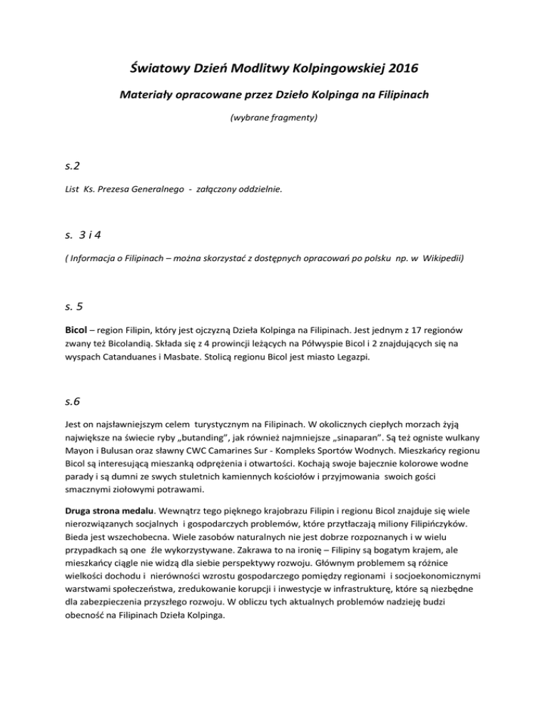 Światowy Dzień Modlitwy Kolpingowskiej 2016 Materiały opracowane przez Dzieło Kolpinga na Filipinach (wybrane fragmenty) s.2 List Ks. Prezesa Generalnego - załączony oddzielnie. s. 3 i 4 ( Informacja o Filipinach – można skorzystać z dostępnych opracowań po polsku np. w Wikipedii) s. 5 Bicol – region Filipin, który jest ojczyzną Dzieła Kolpinga na Filipinach. Jest jednym z 17 regionów zwany też Bicolandią. Składa się z 4 prowincji leżących na Półwyspie Bicol i 2 znajdujących się na wyspach Catanduanes i Masbate. Stolicą regionu Bicol jest miasto Legazpi. s.6 Jest on najsławniejszym celem turystycznym na Filipinach. W okolicznych ciepłych morzach żyją największe na świecie ryby „butanding”, jak również najmniejsze „sinaparan”. Są też ogniste wulkany Mayon i Bulusan oraz sławny CWC Camarines Sur - Kompleks Sportów Wodnych. Mieszkańcy regionu Bicol są interesującą mieszanką odprężenia i otwartości. Kochają swoje bajecznie kolorowe wodne parady i są dumni ze swych stuletnich kamiennych kościołów i przyjmowania swoich gości smacznymi ziołowymi potrawami. Druga strona medalu. Wewnątrz tego pięknego krajobrazu Filipin i regionu Bicol znajduje się wiele nierozwiązanych socjalnych i gospodarczych problemów, które przytłaczają miliony Filipińczyków. Bieda jest wszechobecna. Wiele zasobów naturalnych nie jest dobrze rozpoznanych i w wielu przypadkach są one źle wykorzystywane. Zakrawa to na ironię – Filipiny są bogatym krajem, ale mieszkańcy ciągle nie widzą dla siebie perspektywy rozwoju. Głównym problemem są różnice wielkości dochodu i nierówności wzrostu gospodarczego pomiędzy regionami i socjoekonomicznymi warstwami społeczeństwa, zredukowanie korupcji i inwestycje w infrastrukturę, które są niezbędne dla zabezpieczenia przyszłego rozwoju. W obliczu tych aktualnych problemów nadzieję budzi obecność na Filipinach Dzieła Kolpinga. s. 7 Dzieło Kolpinga na Filipinach – jako „ odpowiedź socjalna” Zostało założone w 1992 roku przez dwie pierwsze RK w Calabanga i Bonbon W 1994 uzyskało osobowość prawną W 1996 zostało uznane przez Międzynarodowe Dzieło Kolpinga w Kolonii jako Narodowy Związek s.8 Członkostwo Dzieło Kolpinga na Filipinach liczy 1400 aktywnych członków działających w 5 diecezjach i ponad 60 parafiach .Głównym zadaniem jest wzmacnianie aktualnych grup kolpingowskich i wychodzenie ze szkoleniami z RK do grup docelowych. Dzieło Kolpinga na Filipinach uznaje ważna rolę swych członków w Związku, zapewnia ich rozwój poprzez program Empowerment Przekazywanie wartości jest podstawą każdego działania organizowanego przez członków. Oddziaływuje to kaskadowo na wszystkie inne programy Dzieła Kolpinga na Filipinach Wizja – o czym marzymy Misja – jak te marzenia realizujemy s.9 Programy: 1. Kształtowanie Związku i „Budowanie objętości”. Ten program kształceniowy składa się z dwóch podprogramów: kształcenia liderów (KLEP) i wspierania Młodego Kolpinga. Chce on kształtować RK złożone ze świadomych odpowiedzialności członków, kolegialnych pracowników, aktywnych obywateli i zaangażowanych chrześcijan i katolików. 2. Programy kształcenia zawodowego. Wprowadza różnorodne metody treningowe, które służą rozwojowi kwalifikacji zawodowych zainteresowanym ludziom. s.10 3. Program rozwoju przedsiębiorczości. Jego głównym zadaniem jest wyposażenie RK i członków w niezbędne umiejętności (wiedzę, gotowość, zasady i wartości), które są niezbędne by działać społecznie i przedsiębiorczo. . Komponentami programu są: szkolenia z pozyskiwania przychodów i rozdziału niskooprocentowanych pożyczek . Szkolenia z pozyskiwania środków na prowadzenie seminariów, warsztaty biznesowe . Niskooprocentowane pożyczki są oknem, które stoi do dyspozycji gospodarczo aktywnej wspólnoty kolpingowskiej, bo mogła posiadać i prowadzić swe biznesowe przedsięwzięcia Hasło rozwojowe Dzieła Kolpinga na Filipinach - „ Przemieniać ludzi, wzmacniać wspólnoty” s.12 Kolping jest Miłosierdziem Bożym Tegoroczny Światowy Dzień Modlitwy Kolpingowskiej odróżnia się od poprzednich tym, że przypada w Nadzwyczajnym Roku Miłosierdzia. Dzieło Kolpinga na Filipinach kieruje swoje modlitwy i refleksje przede wszystkim w stronę Miłosierdzia Bożego, które jest konkretną rzeczywistością dla Rodzin Kolpinga. Temat tegorocznego Dnia brzmi : Kolping jest Miłosierdziem Bożym Dzieło Kolpinga na Filipinach uznaje, że Bóg w swej miłości i miłosierdziu wezwał zwykłych, prostych ludzi - tak jak później bł.A. Kolpinga do służby jako kapłana - by w sposób duchowy rozszerzali Jego miłosierdzie na cały świat, na wszystkie obszary Kościoła, które jest obliczone na wszystkie czasy, szczególnie dla ludzi młodych i ubogich i dla wszystkich, którzy najbardziej oczekują Jego łaski. Dzieło Kolpinga na Filipinach - w kraju rozwijającym się i do tego jedynym chrześcijańskim kraju w Azji z młodą i biedną ludnością - powierza się szczególnie Miłosierdziu Bożemu, które rozprzestrzenia się poprzez miłosiernych ludzi. Z okazji świętowania Światowego Dnia Modlitwy Kolpingowskiej Dzieło Kolpinga na Filipinach wznosi swe serce chwaląc Boga i dziękując Mu za Jego nieopisane Dobro. Prosimy Wszechmocnego o przyjęcie Bł. A. Kolpingaw poczet świętych i modlimy się za wszystkich członków Międzynarodowego Dzieła Kolpinga i ich współpracowników. My członkowie Dzieła Kolpinga na Filipinach prosimy odważnie o przebaczenie naszej skłonności do grzechu i za wszystkich, którzy opuścili rodziny. Modlimy się dlatego, że „jesteśmy miłosierni jak Ojciec w niebie jest miłosierny” Przygotowaniem do Światowego Dnia Modlitwy Kolpingowskiej będzie Triduum odprawiane przez Rodziny Kolpinga wraz z prezesami i wspólnotami parafialnymi w dniach 24, 25 i 26 października. Pierwszy dzień jest po